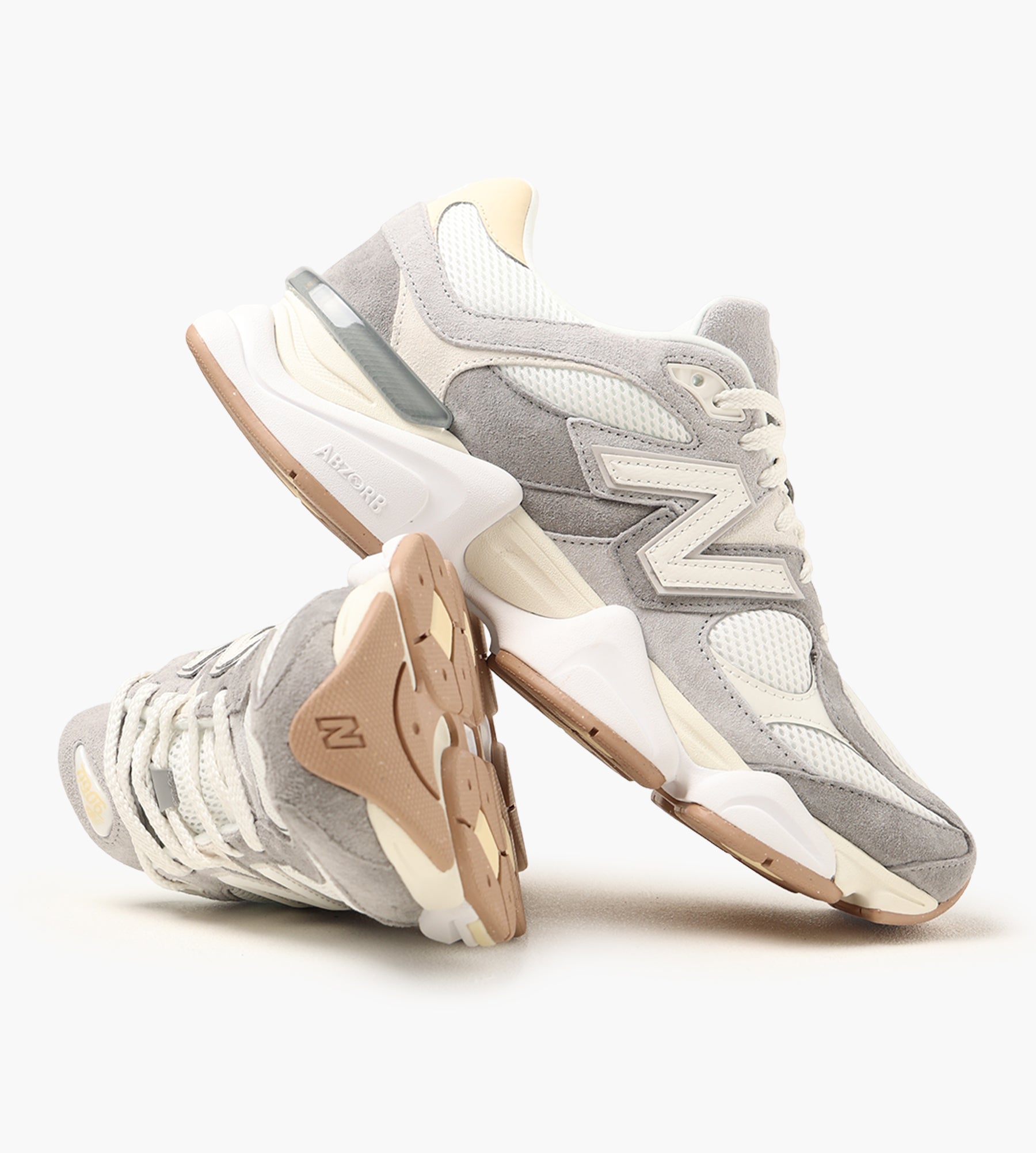 The New Balance 9060 in Slate Gray and Calcium blends heritage design with modern innovation, drawing inspiration from the iconic 99X series. Its upper combines off-white breathable mesh with brown hairy suede overlays and reflective gray panels, delivering a tactile interplay of textures. This thoughtful material mix ensures both durability and ventilation, making it a versatile choice for all-day wear.
