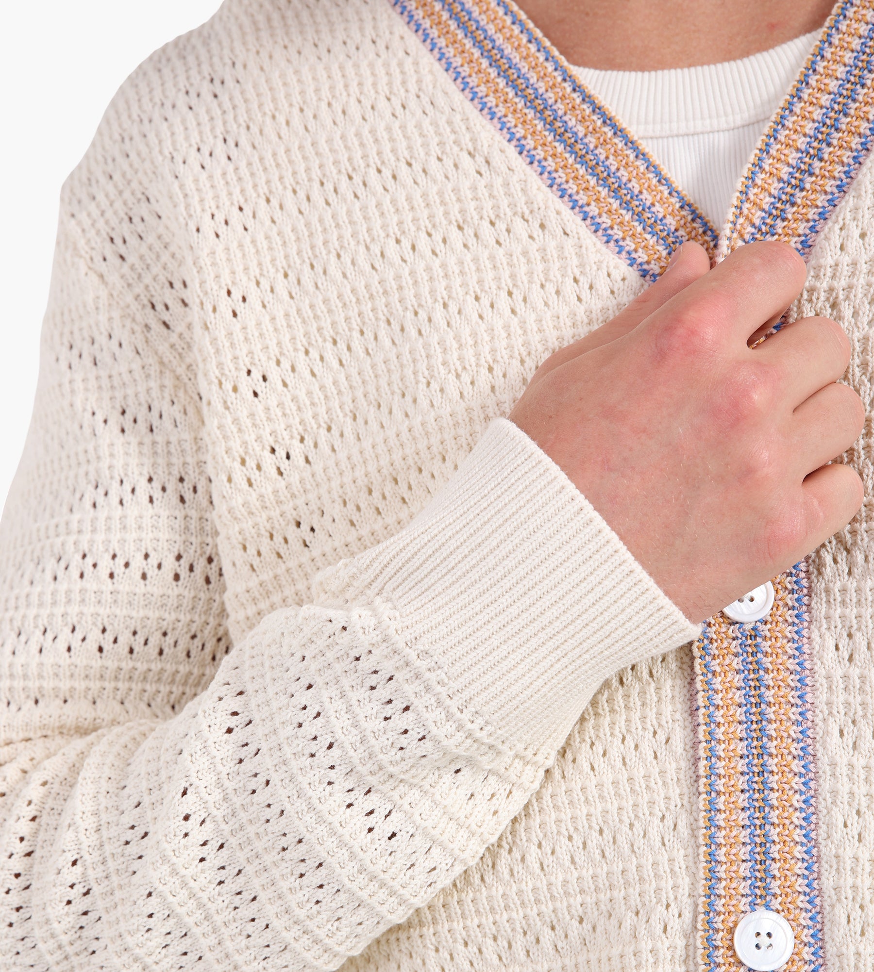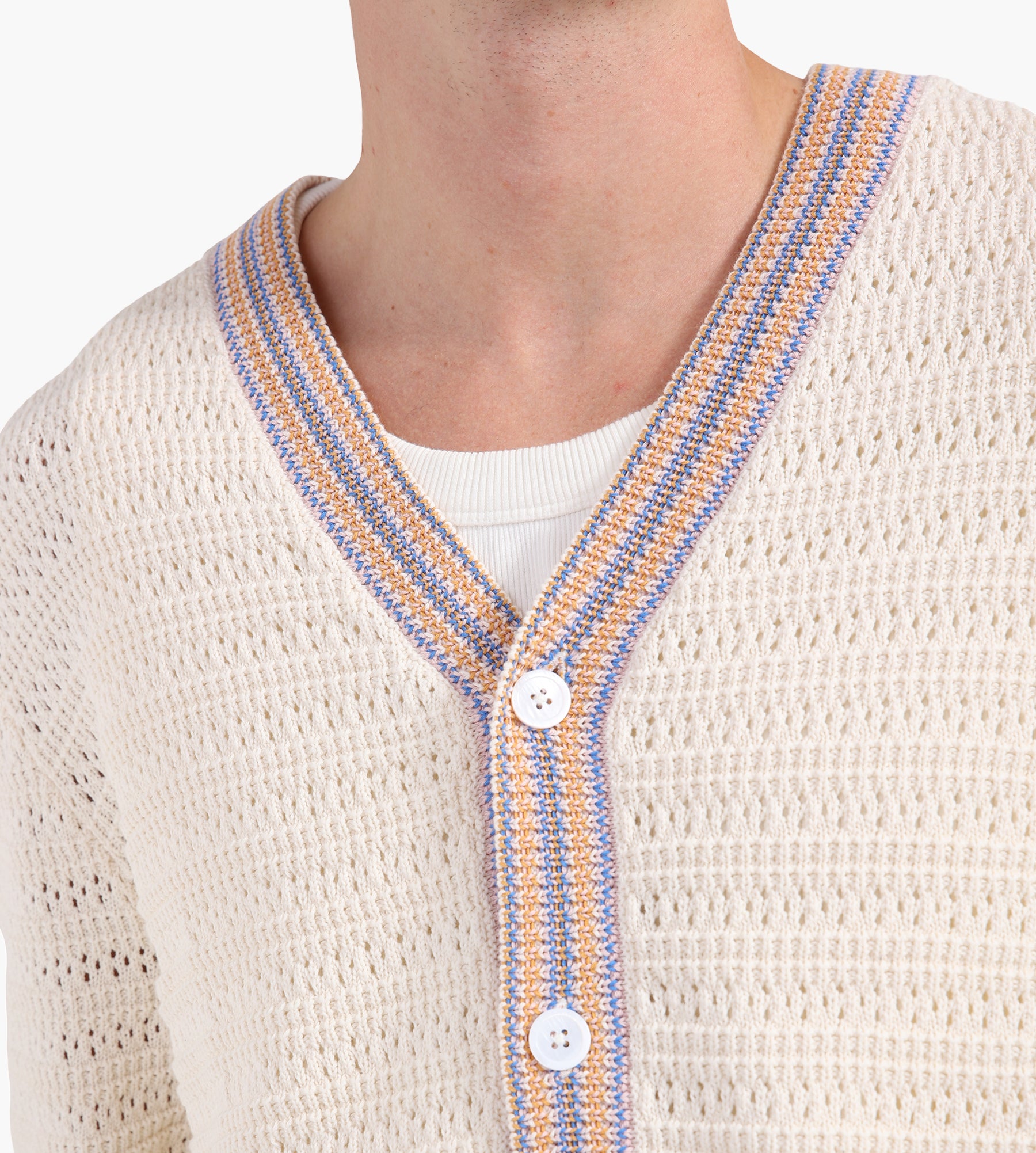 The NN.07 Josh Cardigan in Ivory is crafted from 100% cotton, offering a breathable yet substantial mid-weight open knit. Its refined texture is paired with a contrast stripe trim, lending understated detail to a timeless silhouette. A V-neckline and button placket anchor the design, balancing classic appeal with modern versatility.