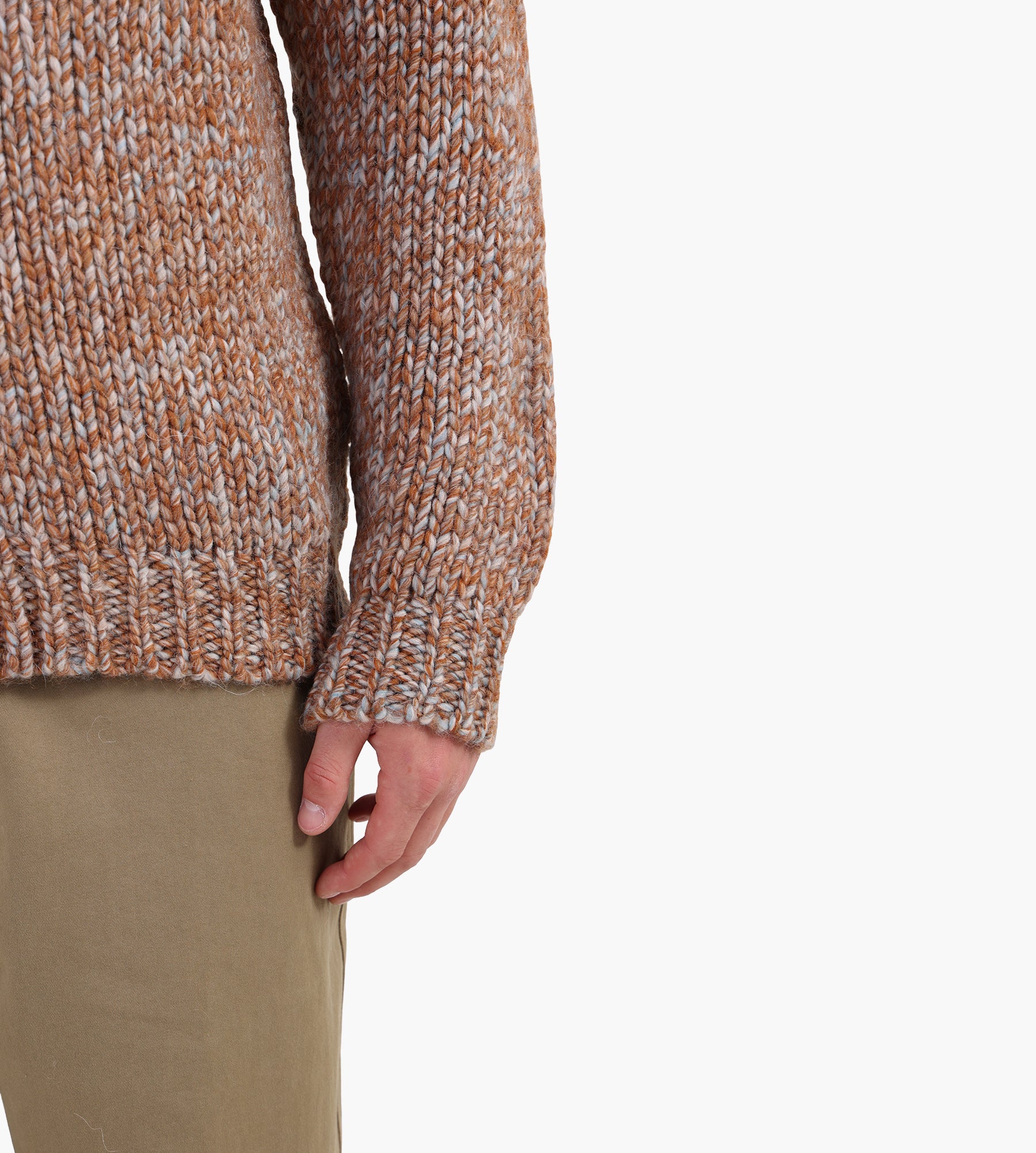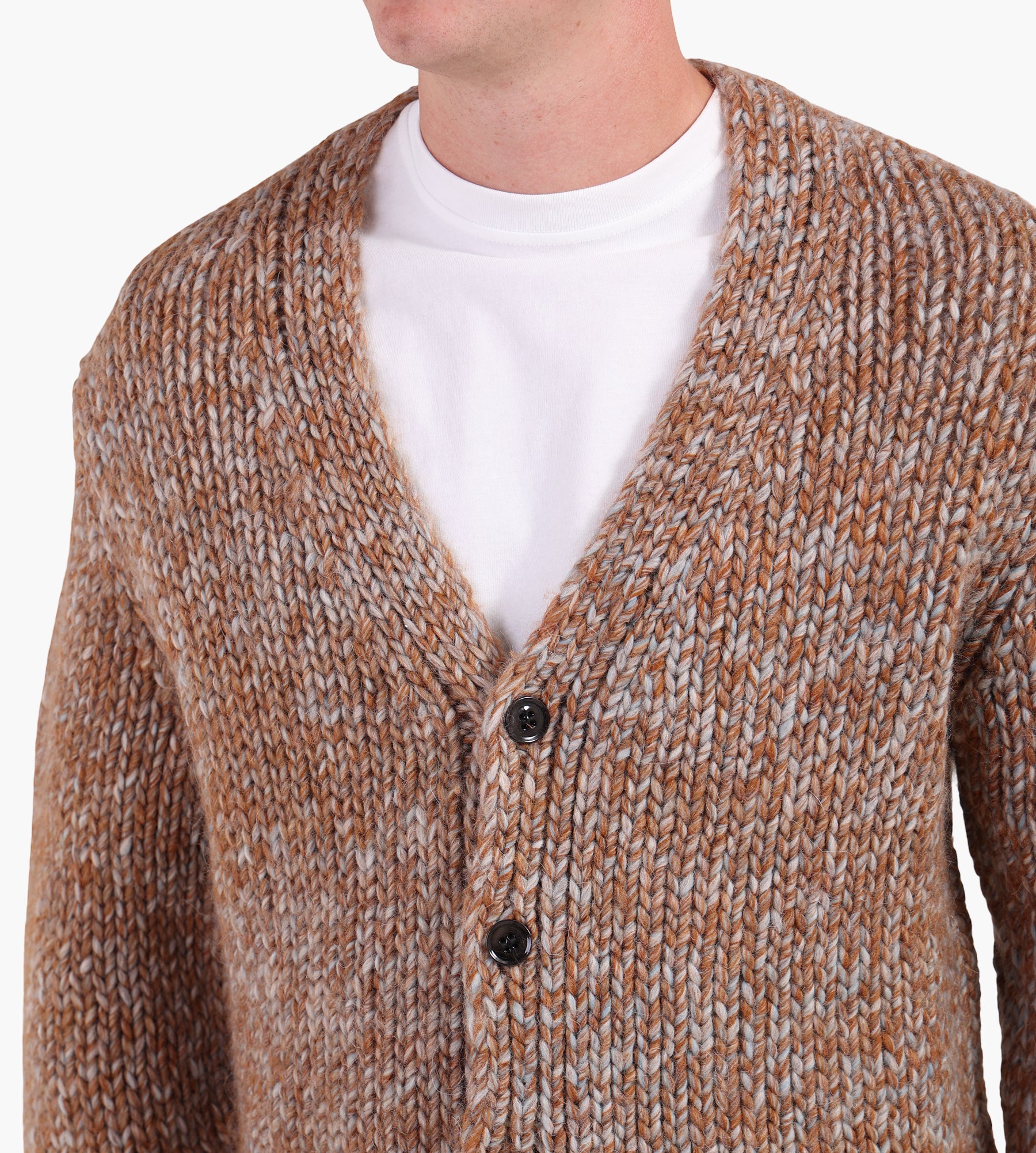 The NN.07 Osky Cardigan 60008 in Caramel combines a blend of 50% wool, 40% acrylic, and 10% alpaca, creating a warm, breathable layer with a soft, fluffy mouline yarn texture. Its chunky knit construction offers a tactile depth, while the rich caramel hue evokes natural warmth, making it an ideal piece for cooler days.