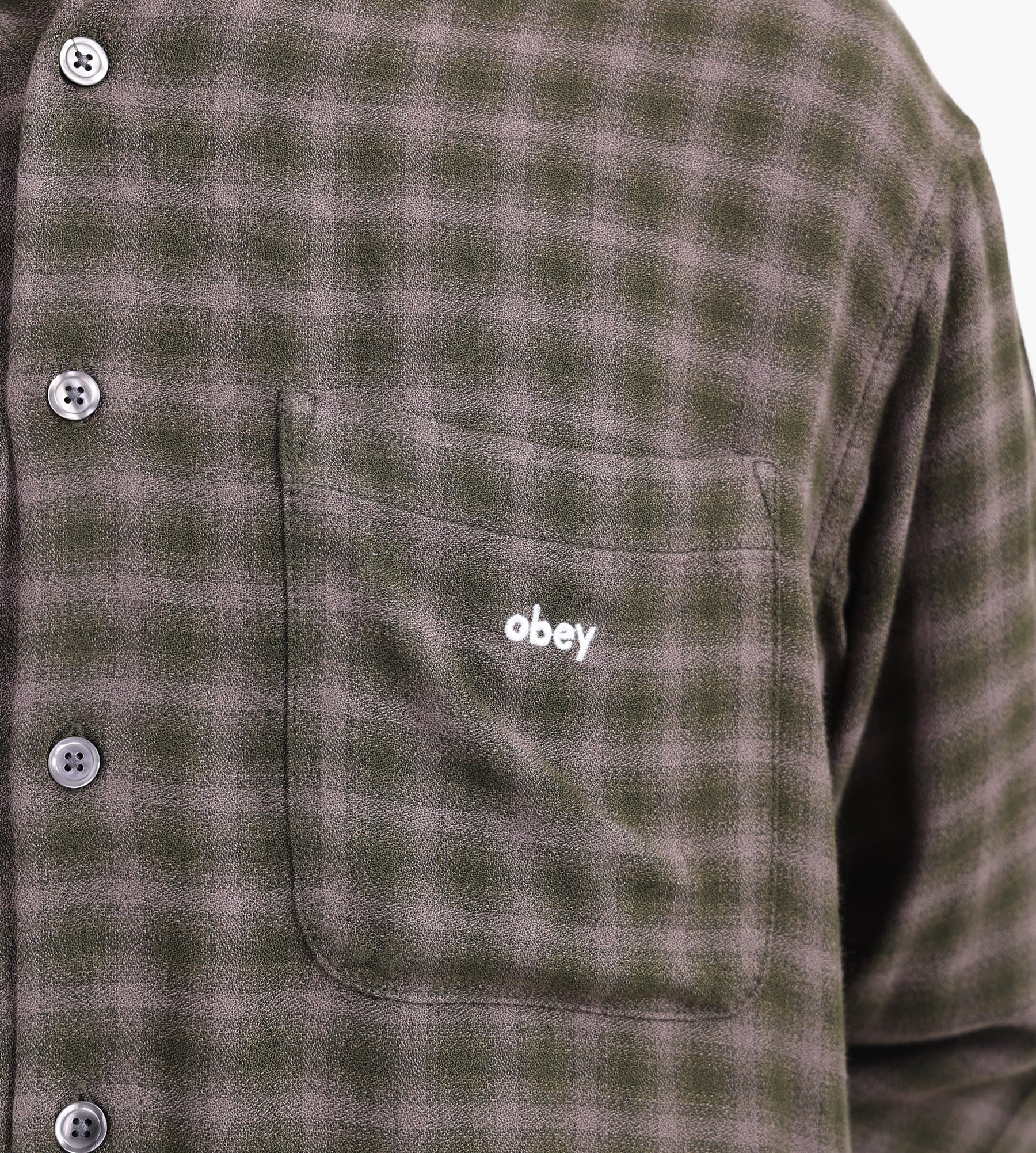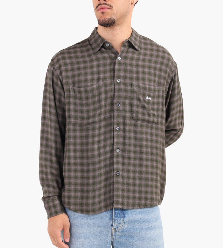 The Obey Clarence Woven Shirt in Kombu Green is crafted from a soft, breathable fabric, offering a relaxed yet polished silhouette. The woven texture adds depth to the understated color, while a classic collar and button-front closure anchor its refined design.