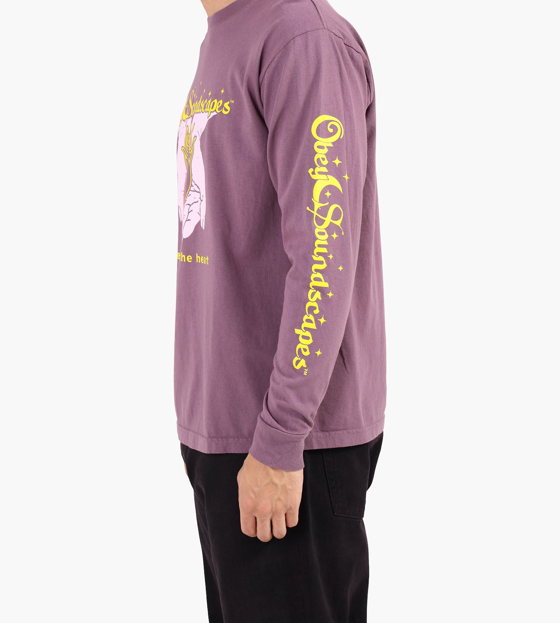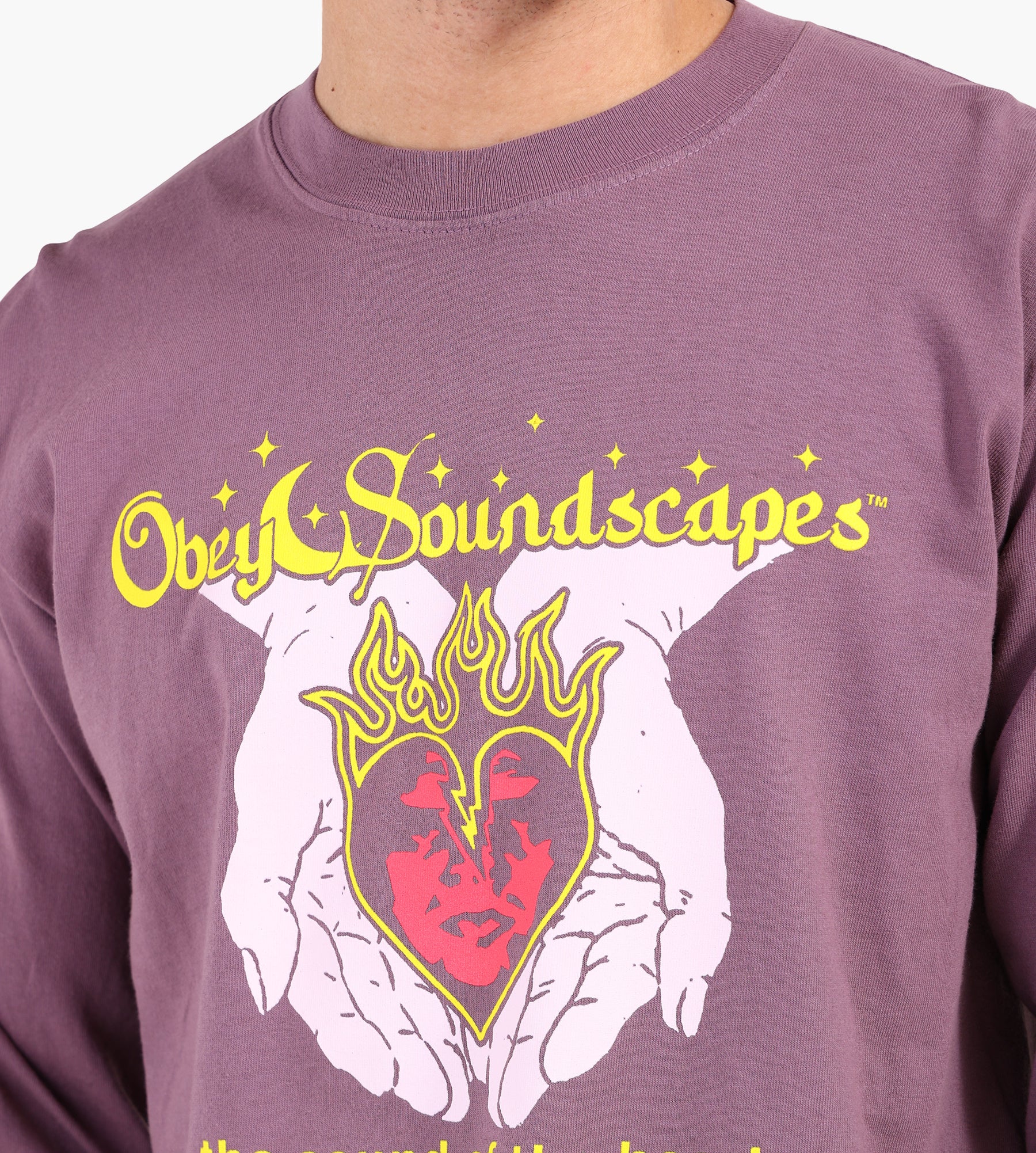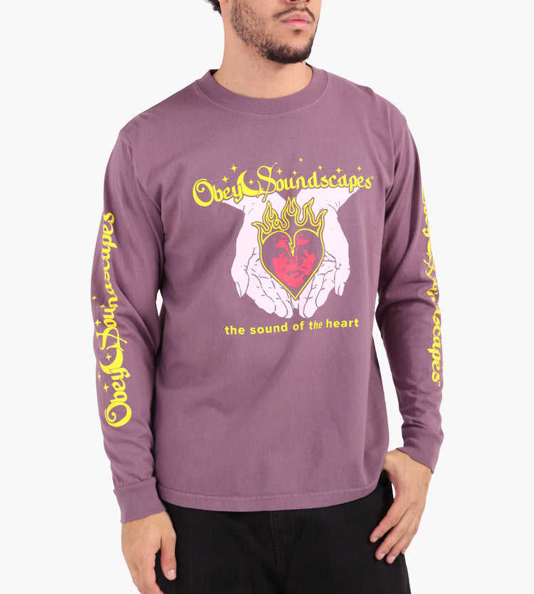 The Obey Soundscapes Long Sleeve Tee in Pigment Plum Perfect is crafted from 100% cotton, offering a soft yet durable feel with an 8 oz weight. Its pigment-dyed finish enhances the rich purple tone, while a graphic print featuring hands holding a flaming heart and bold yellow text adds an artistic edge. Long sleeves and a classic crew neck anchor the design, balancing bold visuals with everyday wearability.
