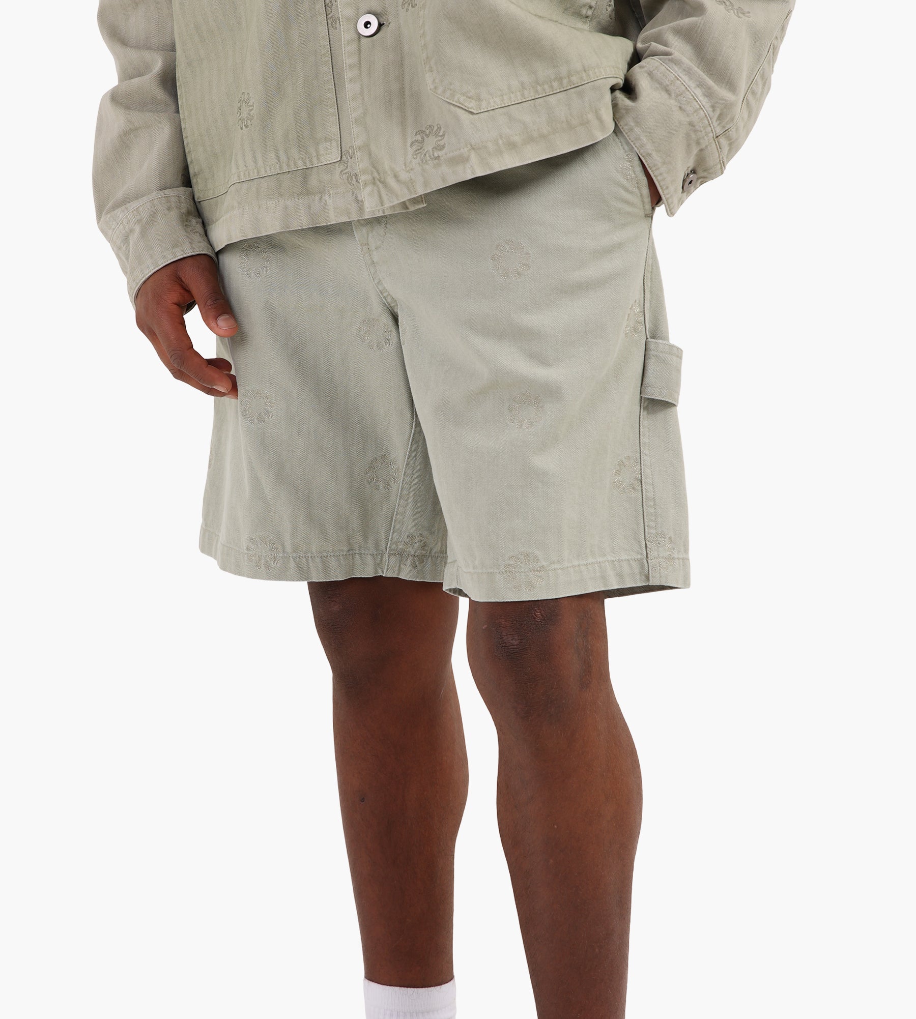 The OLAF Embro Sun Carpenter Shorts in Sage Green reinterpret workwear aesthetics with a refined edge. Likely crafted from a durable cotton or cotton-blend fabric, these shorts deliver a breathable yet robust foundation for everyday wear. Signature embroidery adds a subtle visual accent, while the carpenter-style design nods to utilitarian roots with functional detailing.