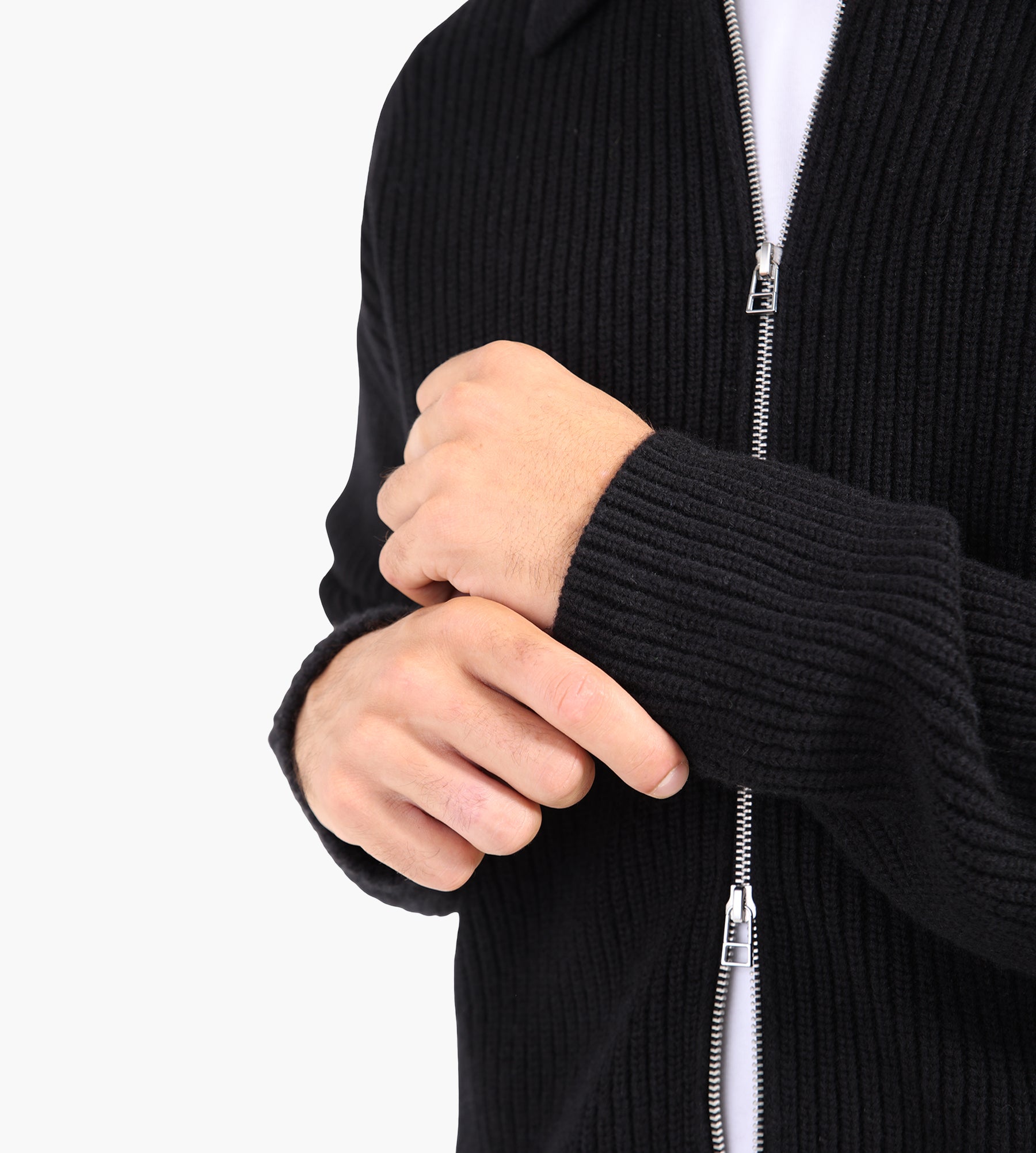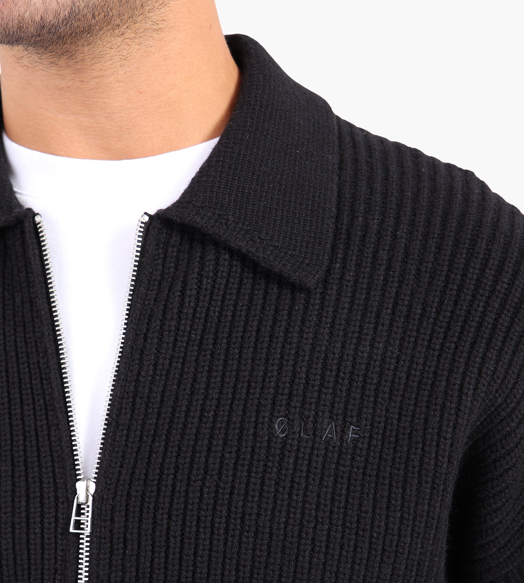 The OLAF Knitted Zip Cardigan in Black is crafted from a premium knitted fabric, offering a tactile balance of warmth and breathability. The sleek black colorway and minimalist zip-front closure make it an adaptable layer for any setting, whether paired with tailored trousers or casual denim.