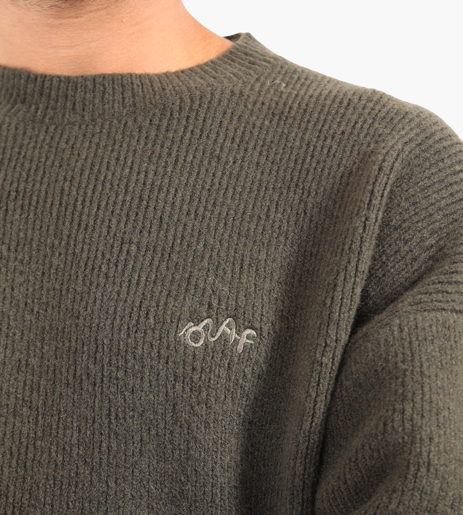 The OLAF Signature Knitted Crewneck in Olive Night blends 54% polyester, 38% acrylic, 5% wool, and 3% elastane for a soft yet structured feel. Its minimalist Scandinavian-inspired design is anchored by a refined knitted texture and a discreet Olaf logo on the chest, offering subtle sophistication. The boxy fit enhances layering potential while maintaining a relaxed silhouette.