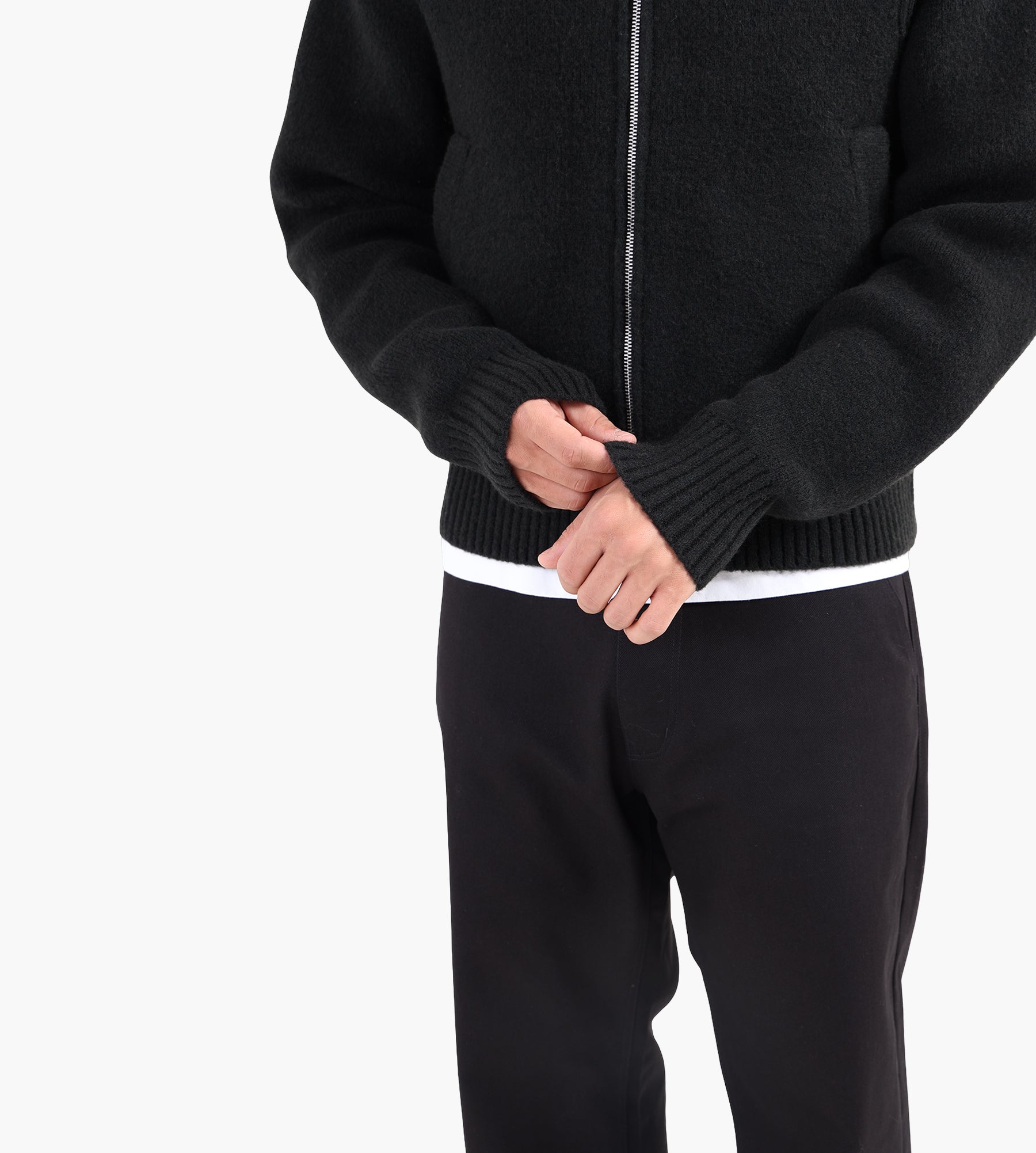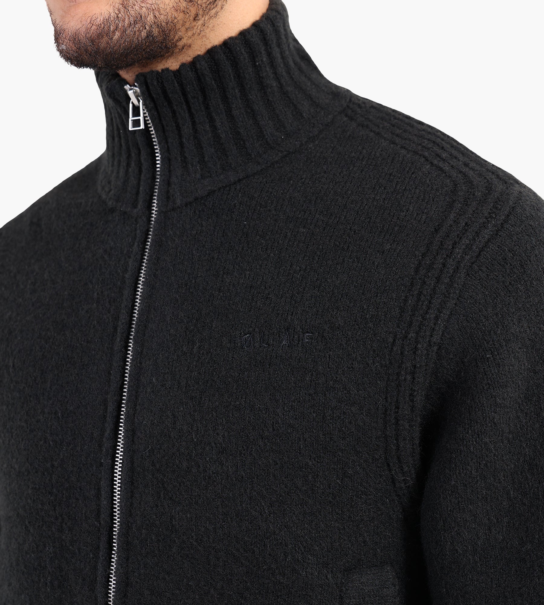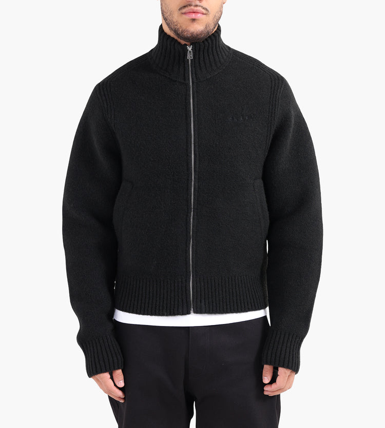 The OLAF Zip-Through Knitted Mock Neck in Black is crafted from a premium knit blend, offering a soft yet structured texture that balances comfort and durability. The deep black finish enhances its versatility, while the mock neck and zip-through design add a refined, functional edge for transitional layering.