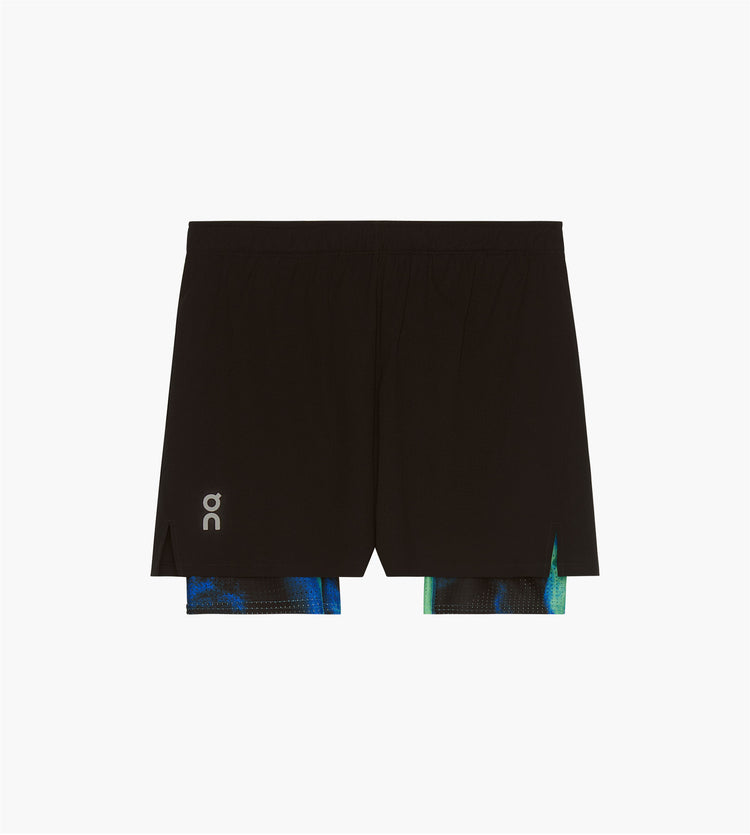 The On Men's Pace Shorts in Black/Horizon combine CleanCloud® polyester with a 2-in-1 design for performance-focused functionality. The outer shorts feature a lightweight, crepe-like stretch material, while the inner tights use breathable mesh for enhanced coverage and airflow. An elastic waistband with adjustable cords ensures a secure fit, adapting effortlessly to every stride.