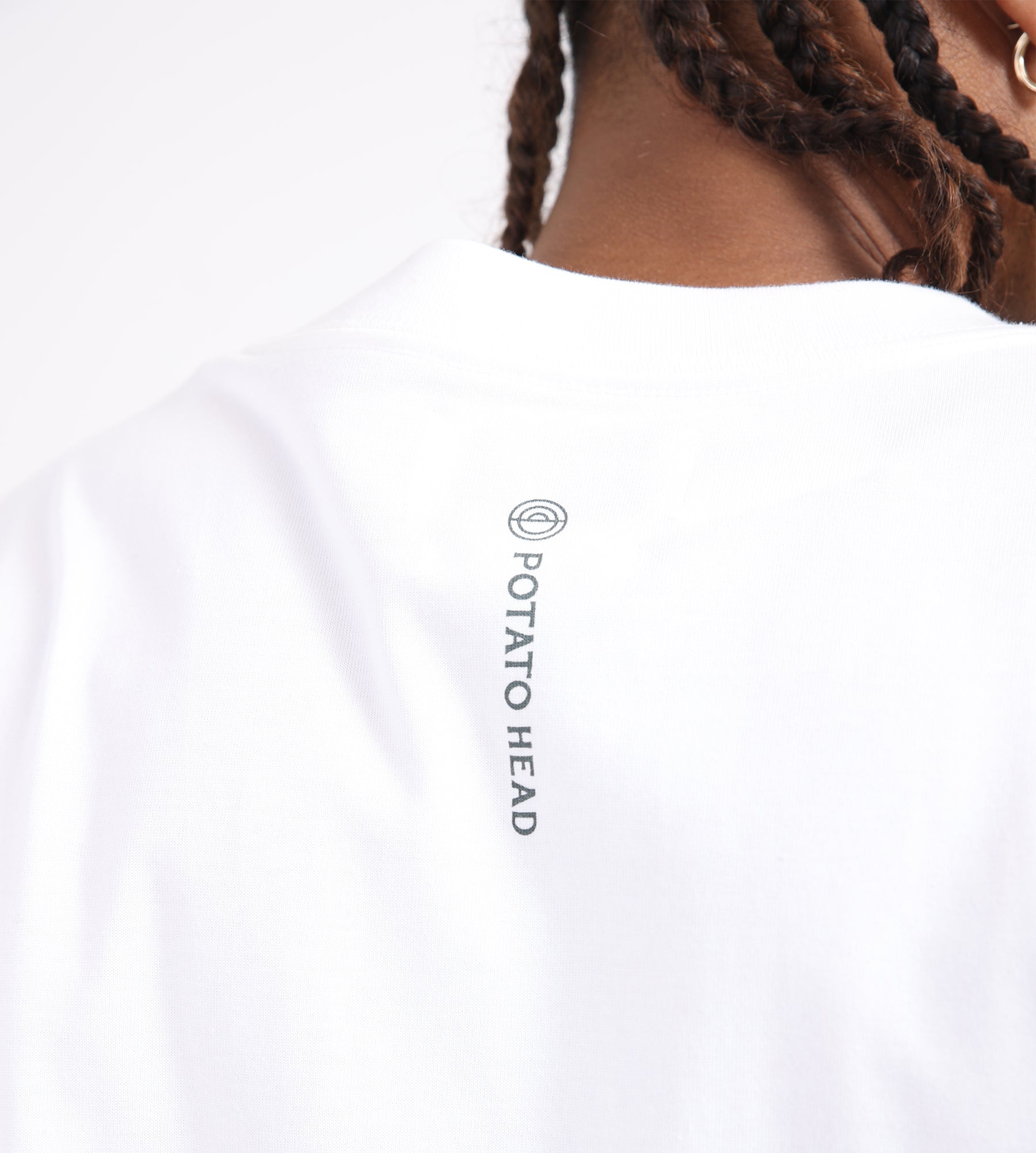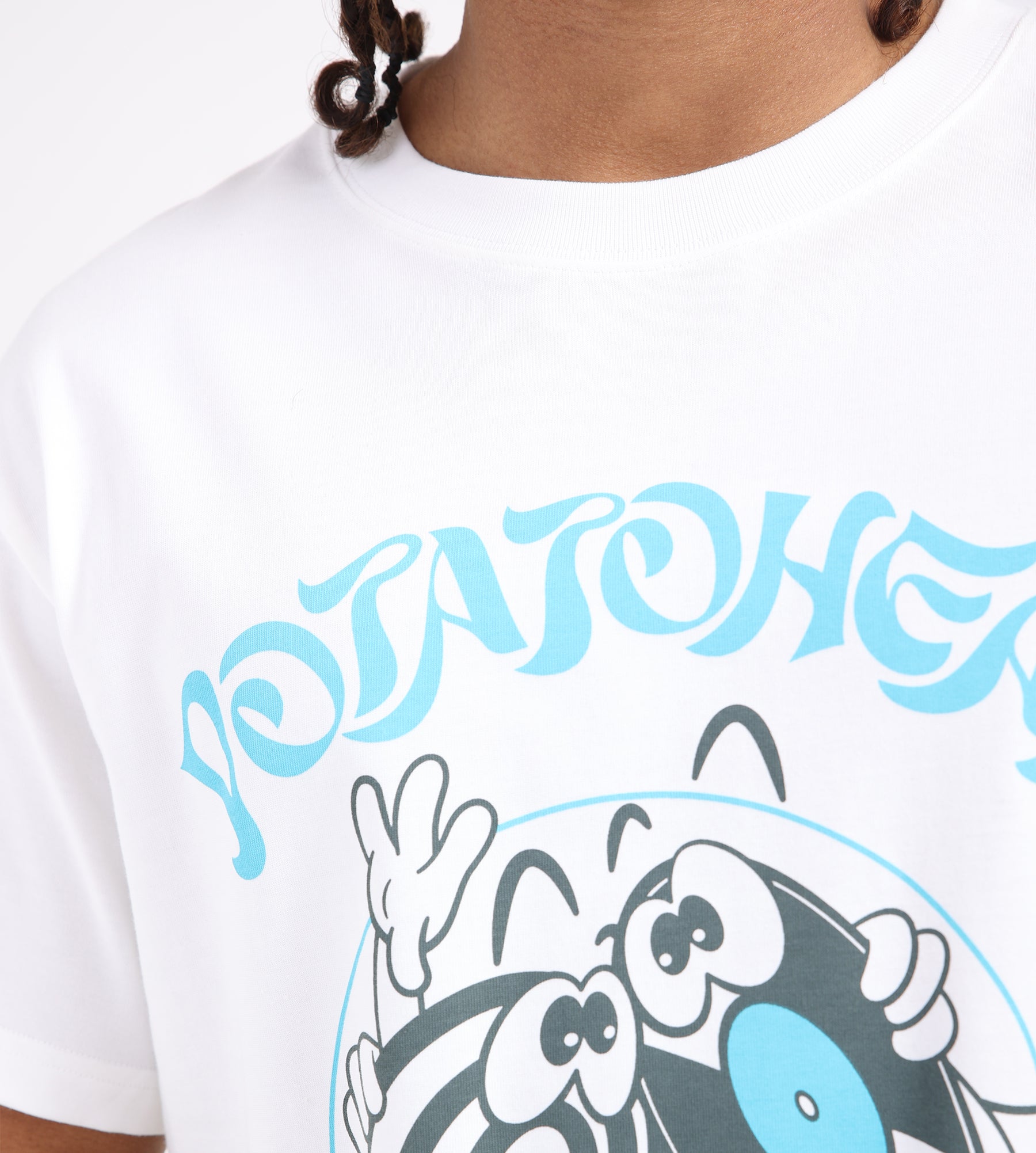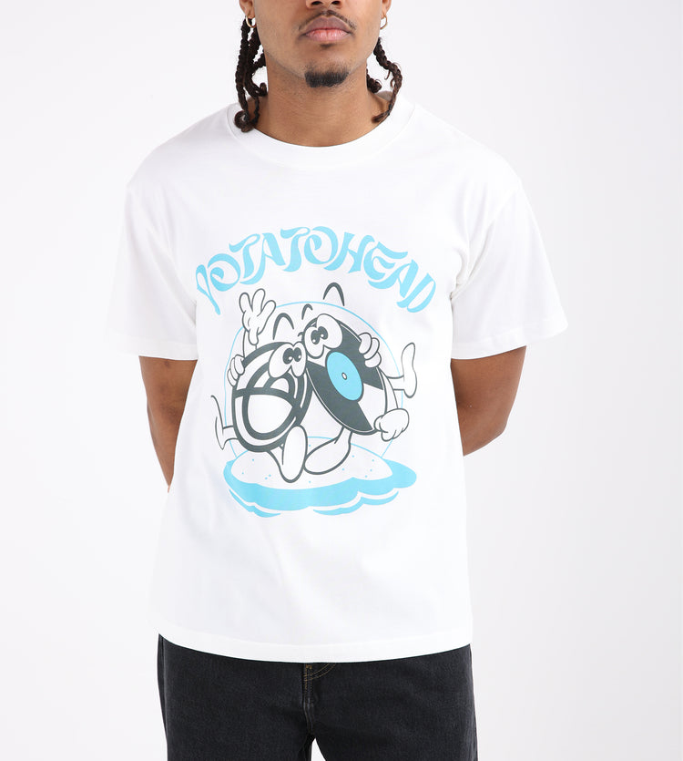 The Potato Head Bli Made Printed T-Shirt in white is crafted from 100% organic cotton, offering a soft, breathable layer for everyday wear. A screen-printed graphic of the 'Bli Made' character, inspired by the iconic Potato Head logo, adds a playful yet understated touch to this minimalist piece.