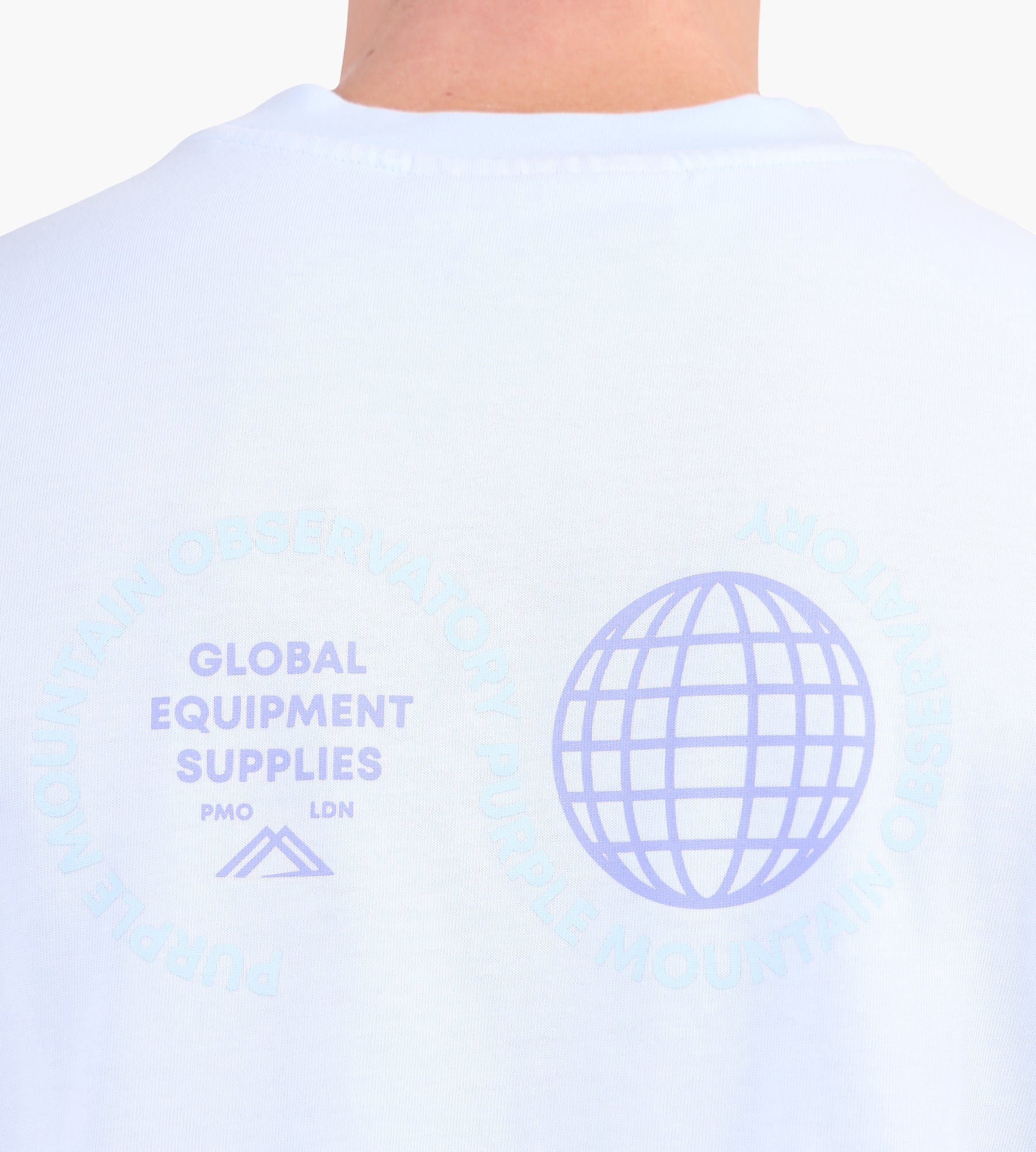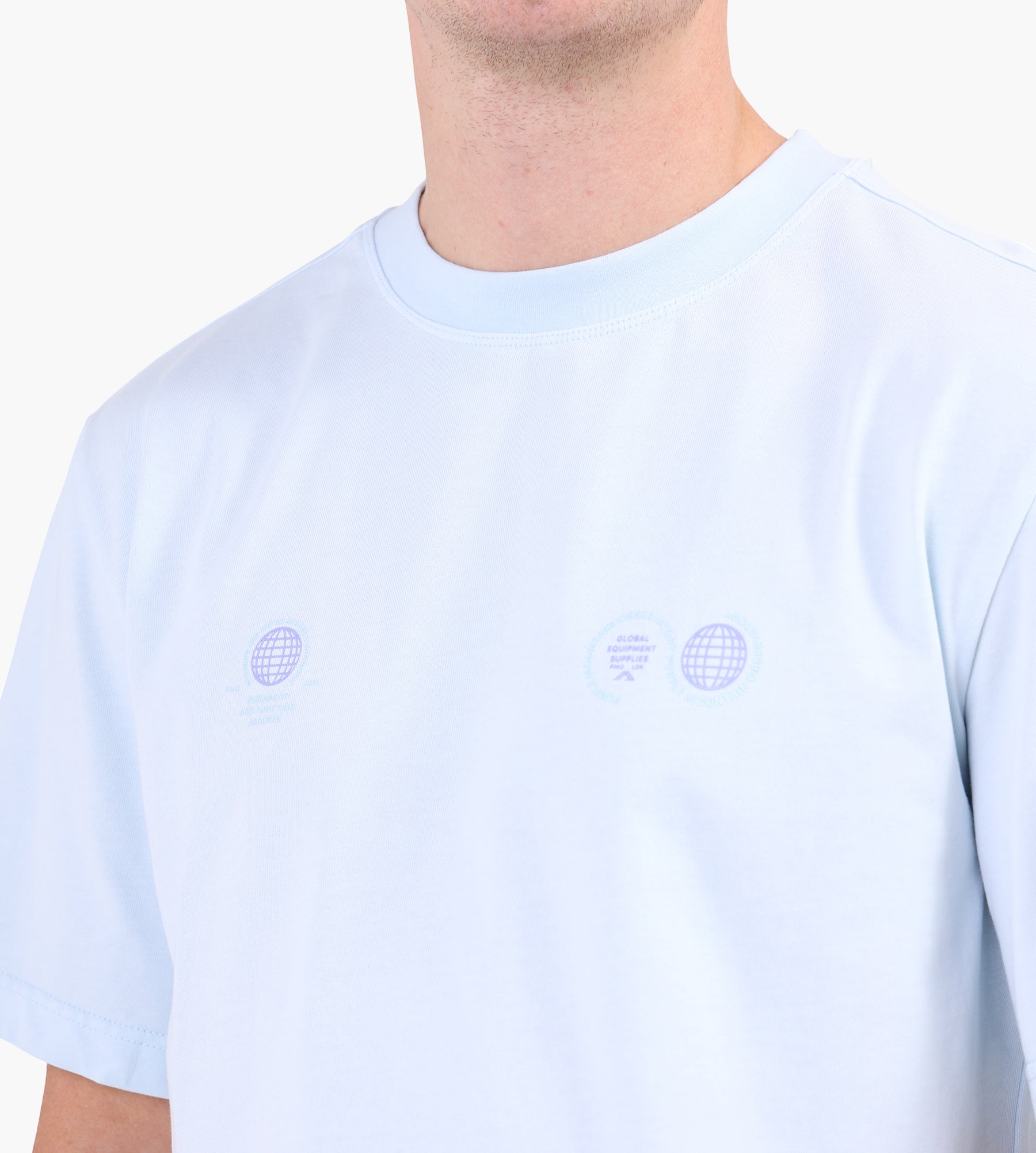 The Purple Mountain Observatory Globe T-Shirt in Sky Blue is crafted from 100% cotton, offering a soft and breathable foundation for everyday wear. A flexible rib knit collar enhances comfort, while the straight-cut hem ensures a clean, versatile silhouette. Printed graphics on the front and back reflect the brand's mountaineering heritage and technical design ethos.