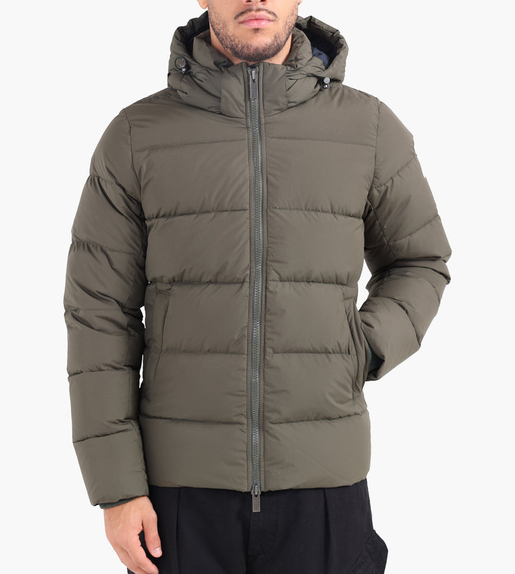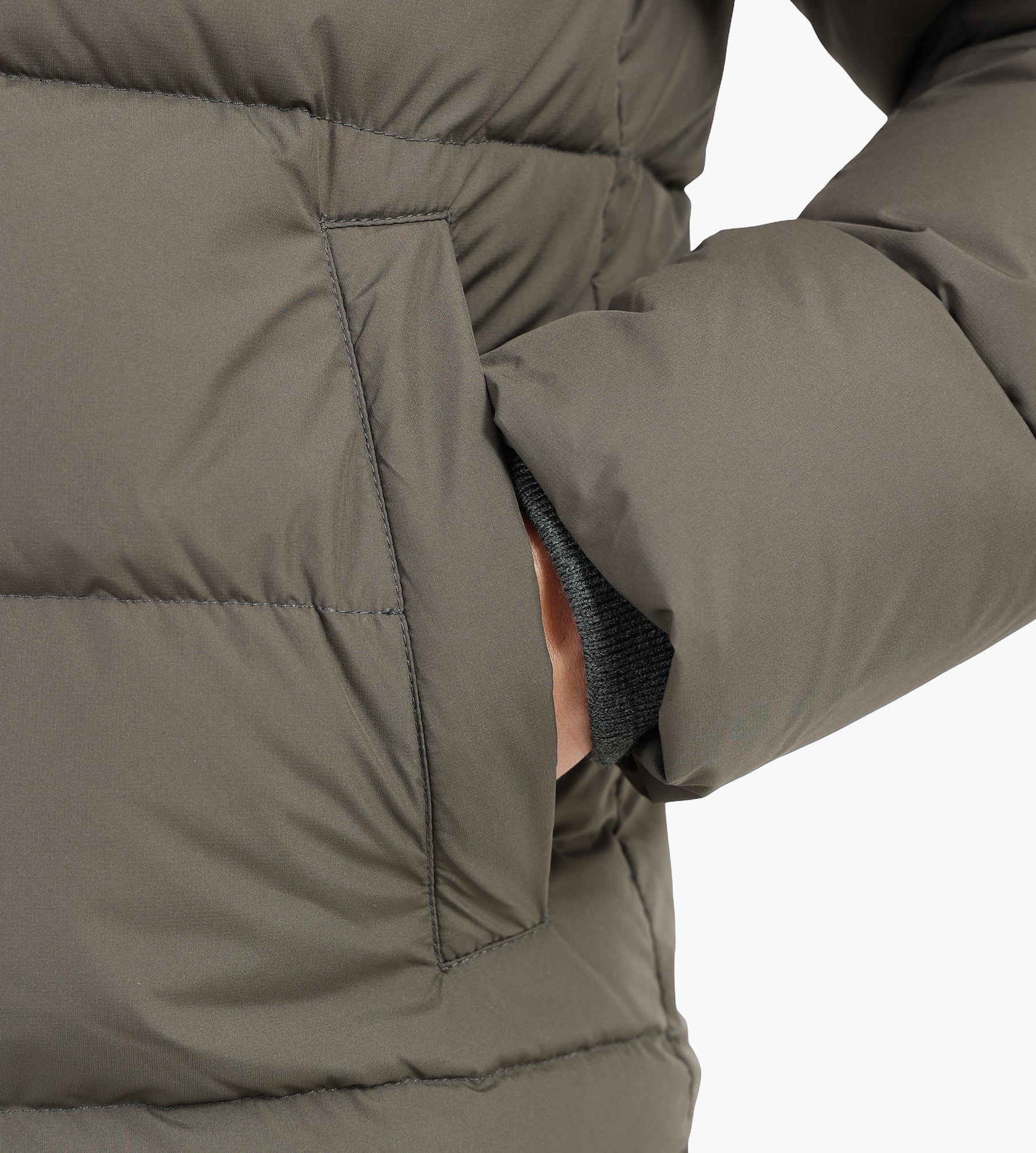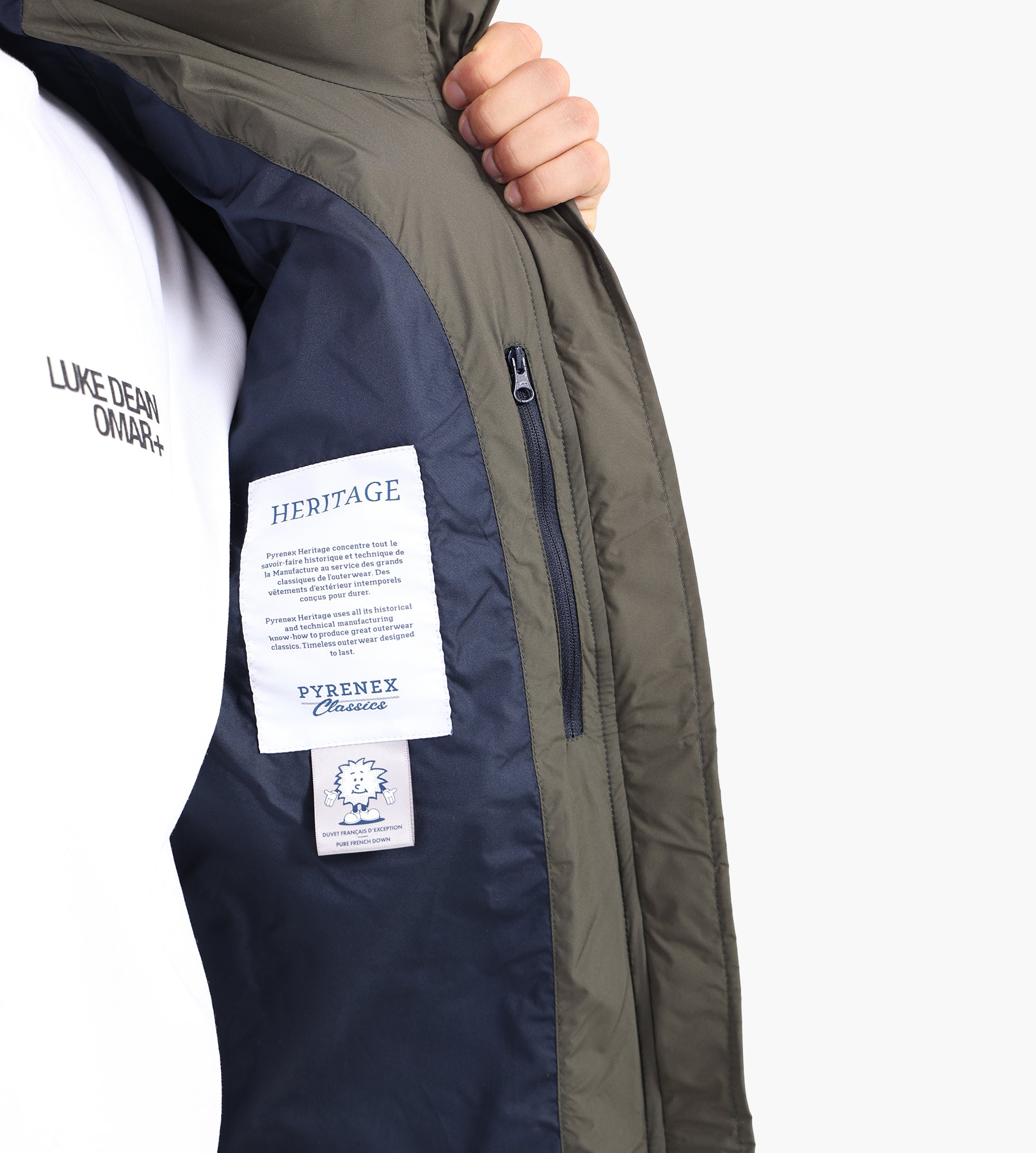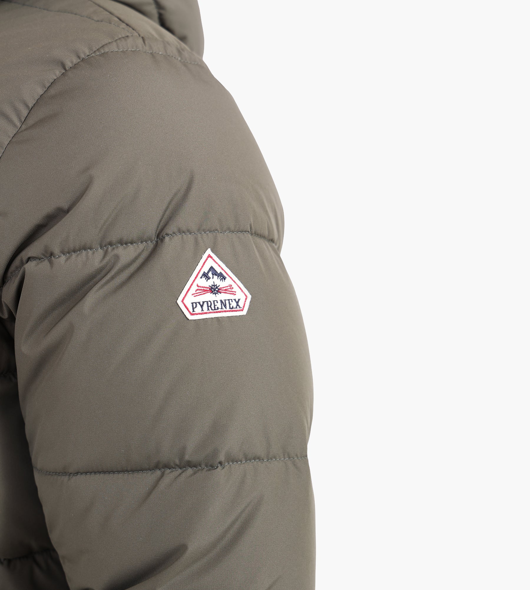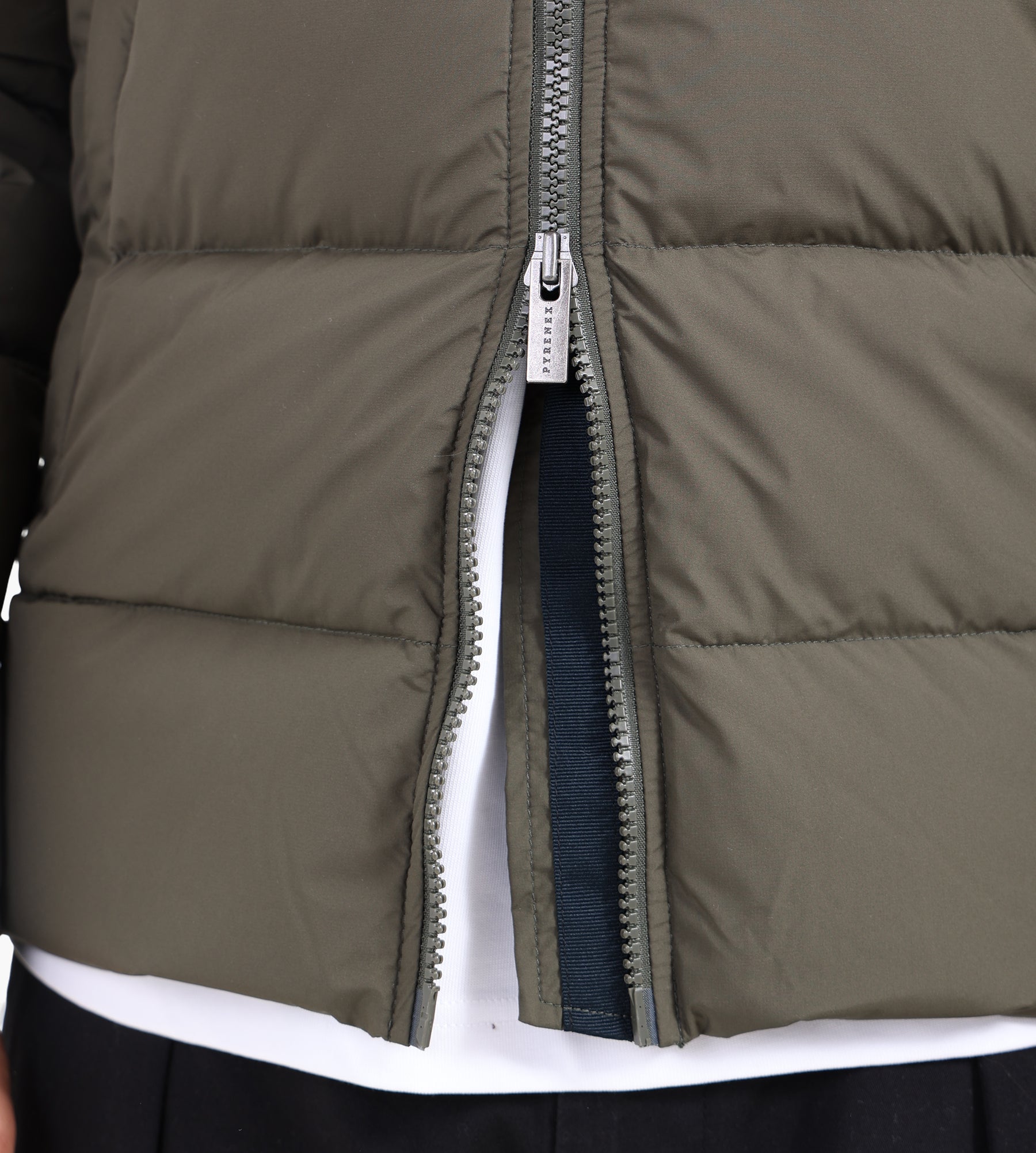 The Pyrenex Spoutnic Down Jacket in Deep Khaki is crafted from 100% polyester mini ripstop fabric, offering a waterproof and windproof barrier with a refined matte finish. Filled with 90% French duck down and 10% feather (750 fill power), it delivers exceptional warmth while remaining lightweight. The jacket features a removable hood for adaptable wear, making it a versatile layer for shifting conditions.