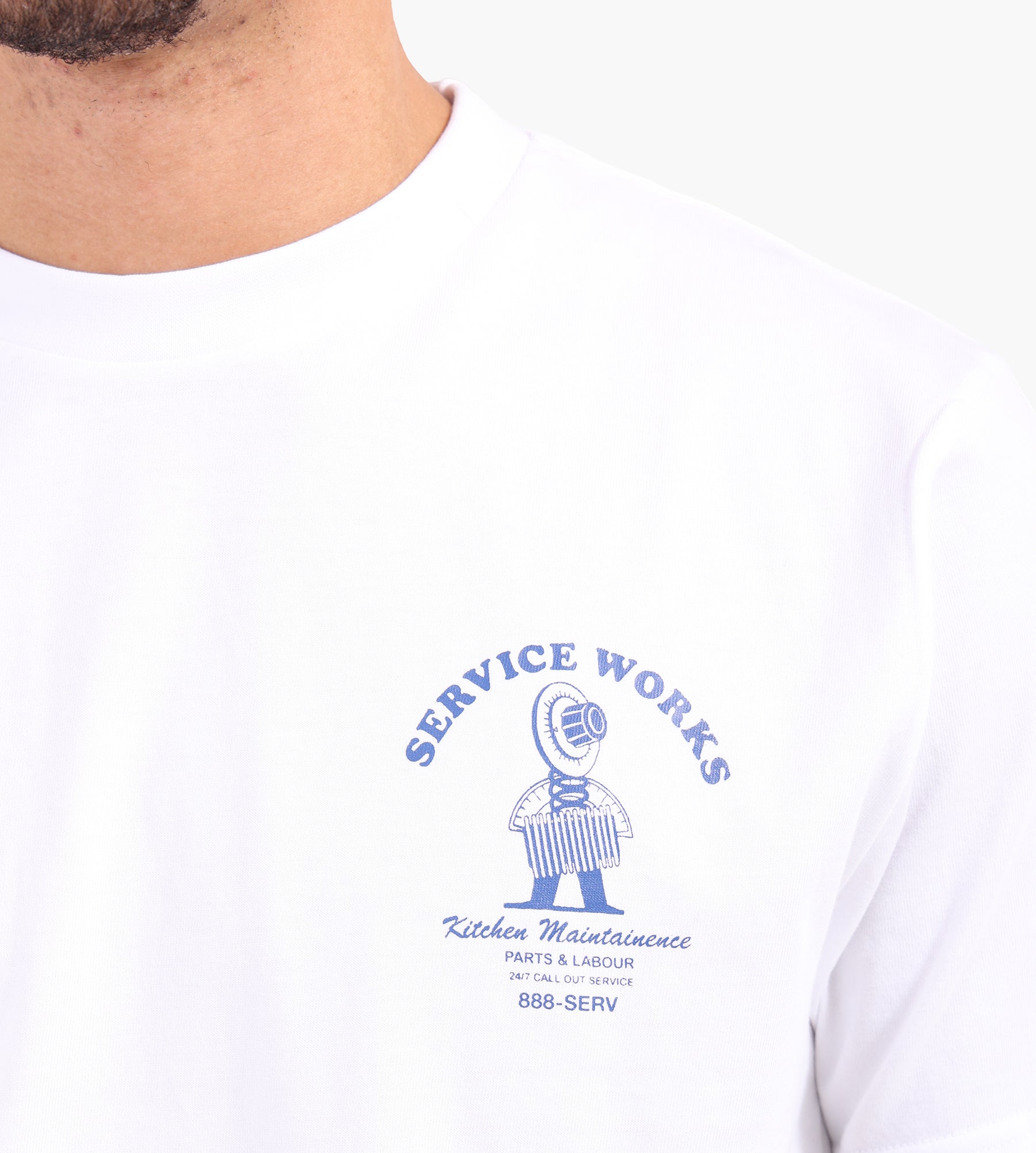 The Service Works Maintenance Tee in White offers a clean, understated silhouette, perfect for everyday layering or standalone wear. While the material isn't specified, its breathable construction and crisp white finish suggest effortless comfort and versatility.