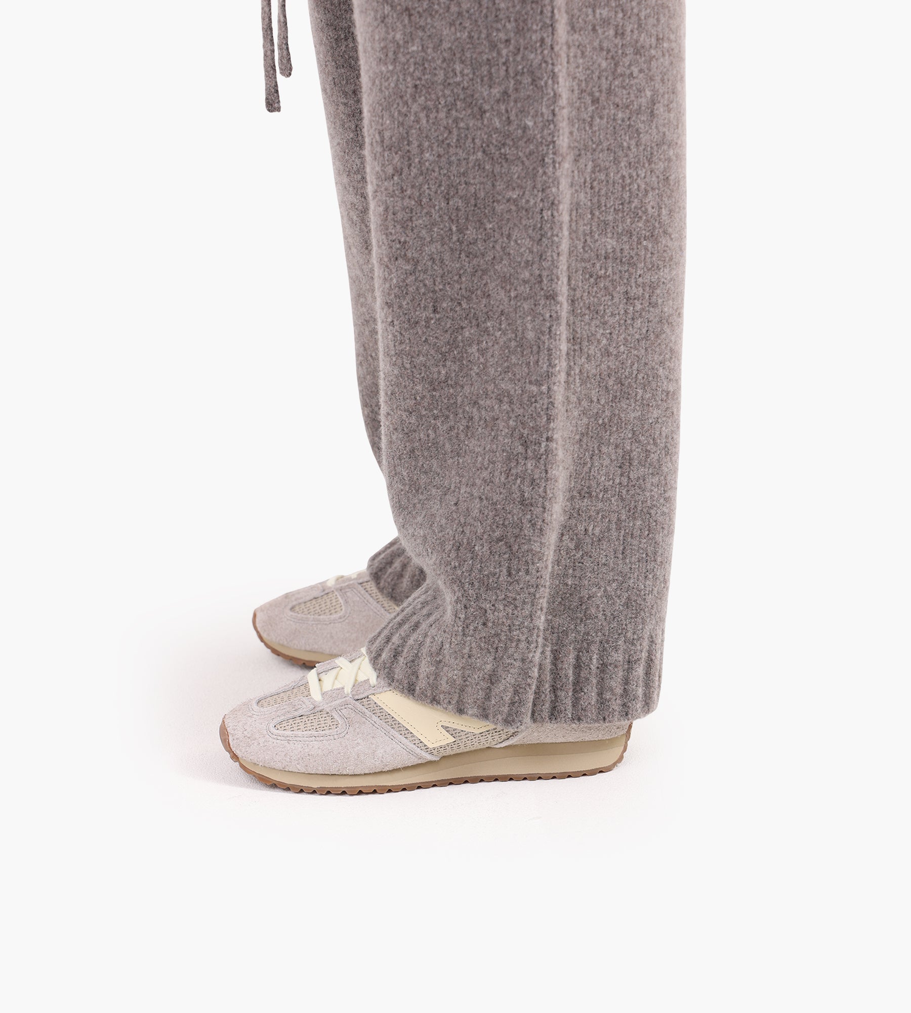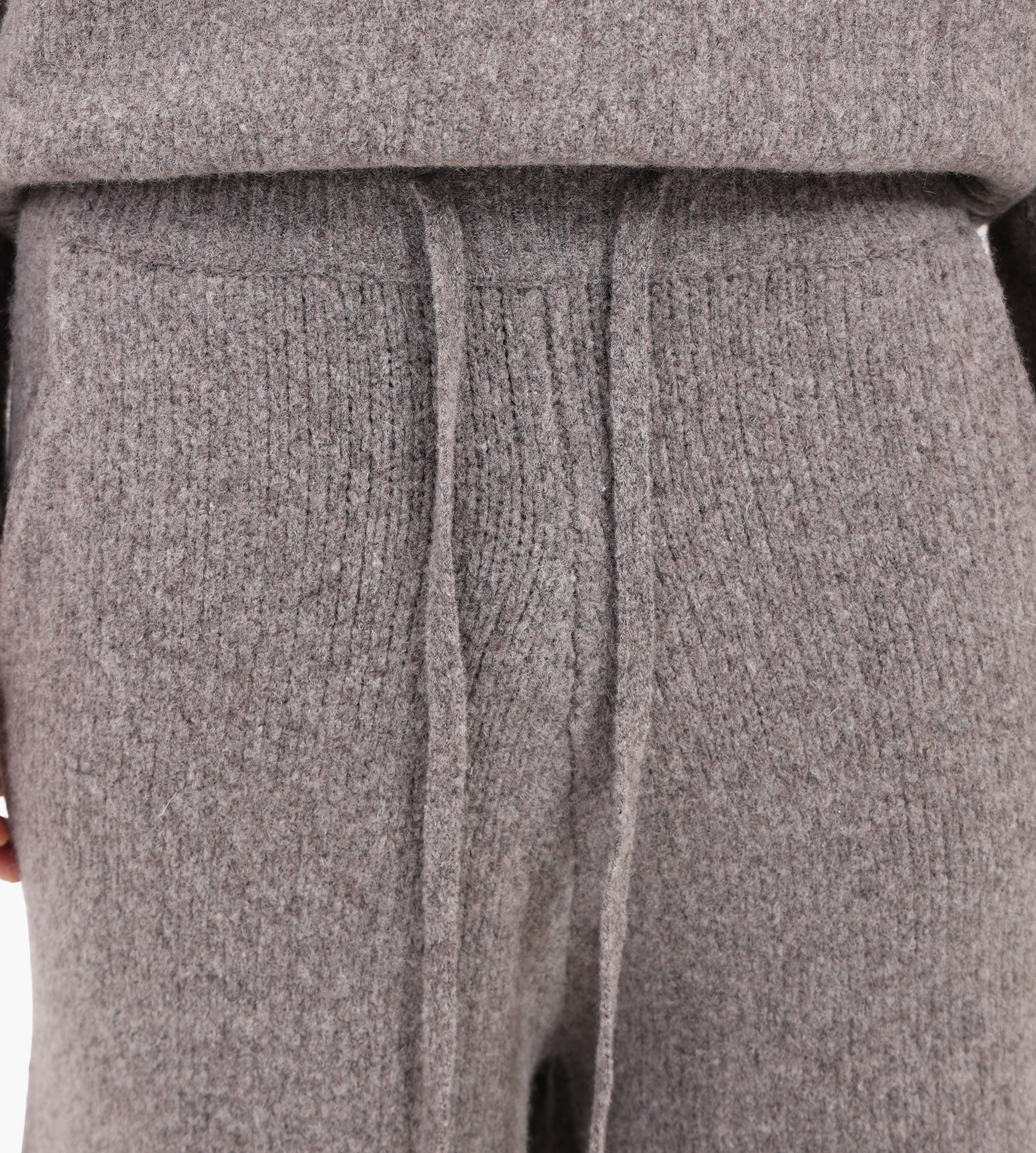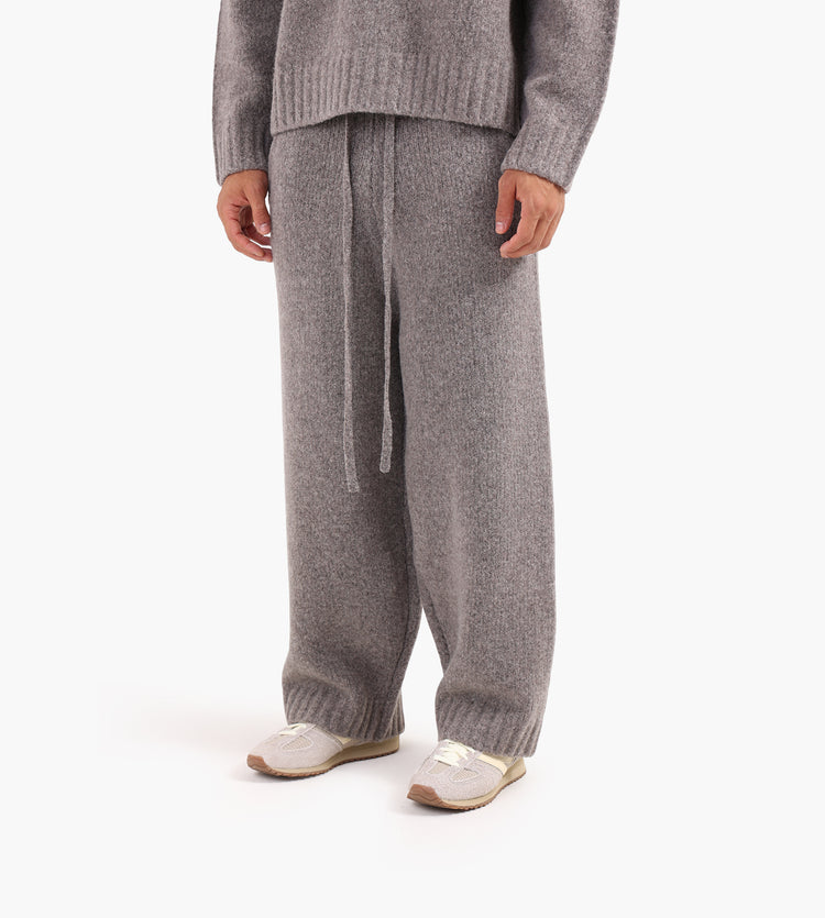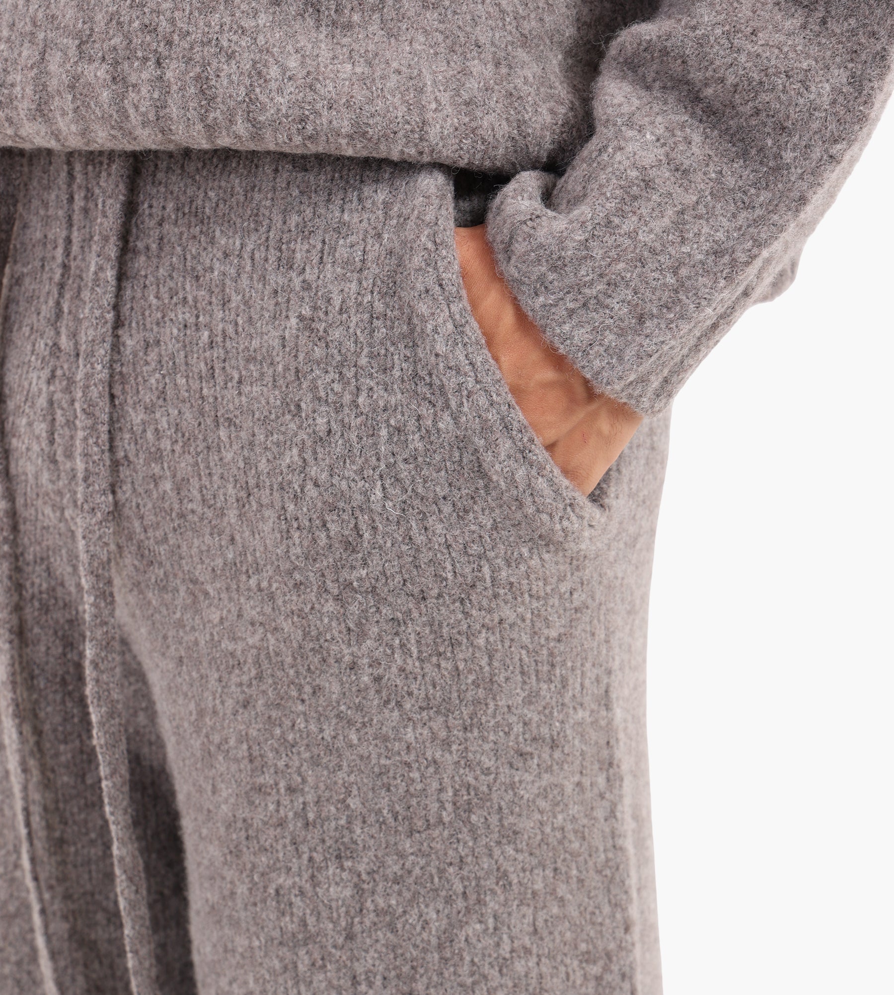 Designed for effortless wear, the ribbed elastic waistband with extended knit drawstring ties ensures a secure yet adjustable fit. Side pockets at the hips provide practical storage, making these wool knit trousers ideal for lounging or casual outings. The soft, breathable wool delivers comfort with a cozy, weighty feel.