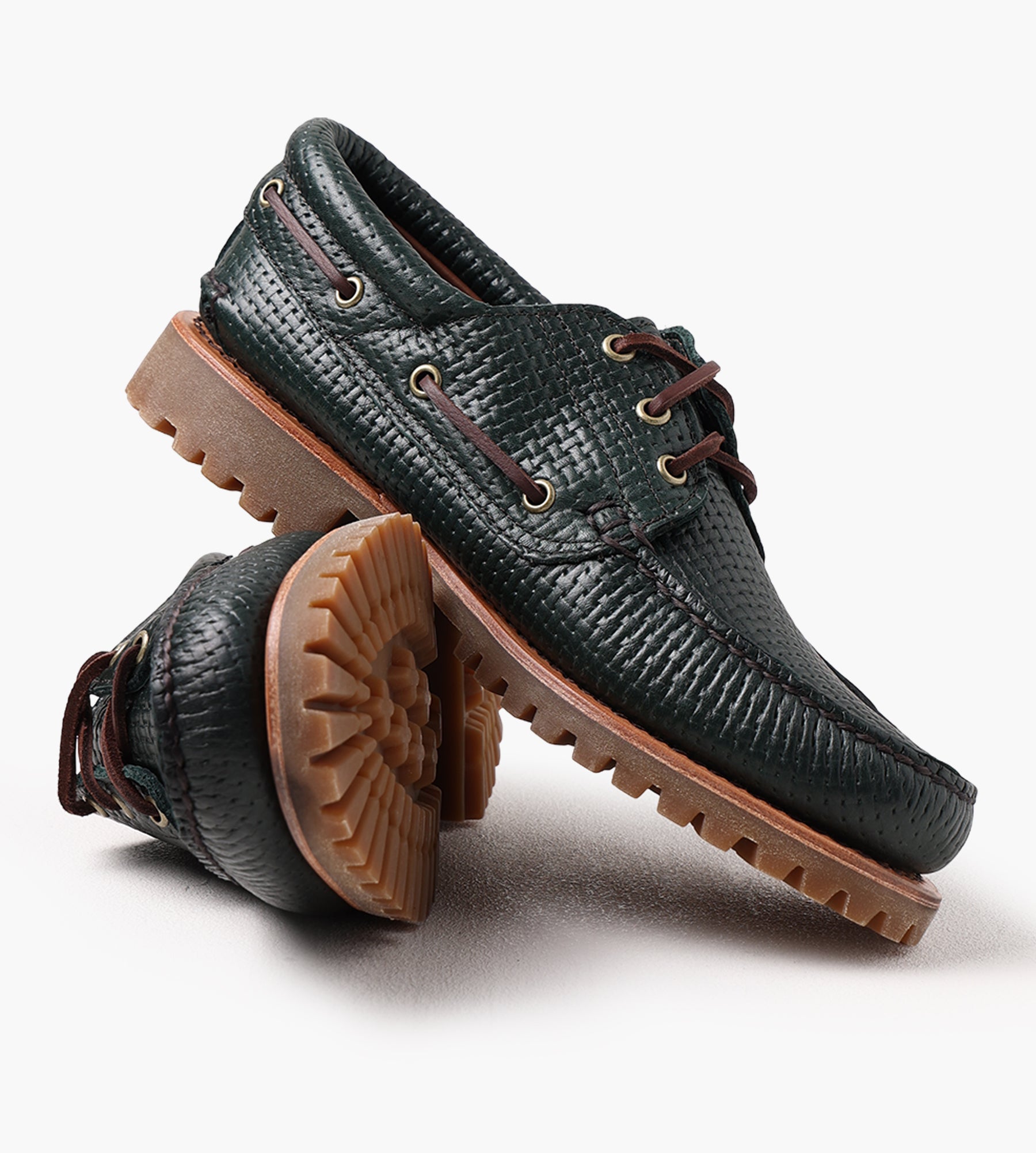 The Timberland® Authentic 3-Eye Lug Handsewn Boat Shoe in Green is crafted from premium Timberland® leather, delivering a rich texture and enduring quality. Traditional handsewn construction reinforces its durability, while the leather midsole and lining enhance both structure and comfort.