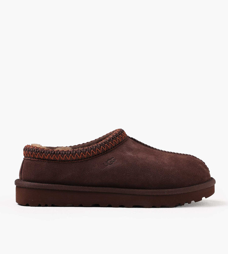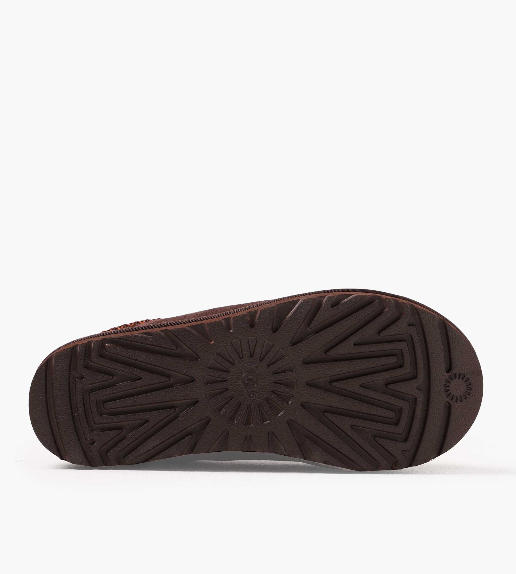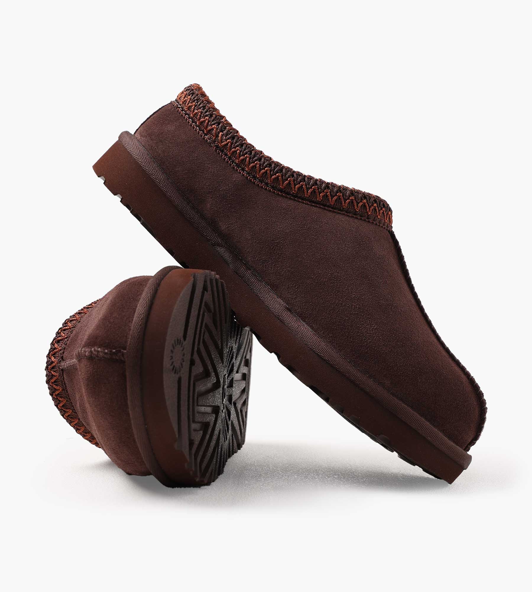 The UGG Tasman II Slipper in Rocky Oak combines a suede upper with a plush 17mm sheepskin lining for a balance of durability and softness. Its signature UGGbraid collar, crafted from 100% recycled polyester fibers, adds a refined touch, while the lightweight EVA outsole ensures reliable traction for indoor and outdoor wear.