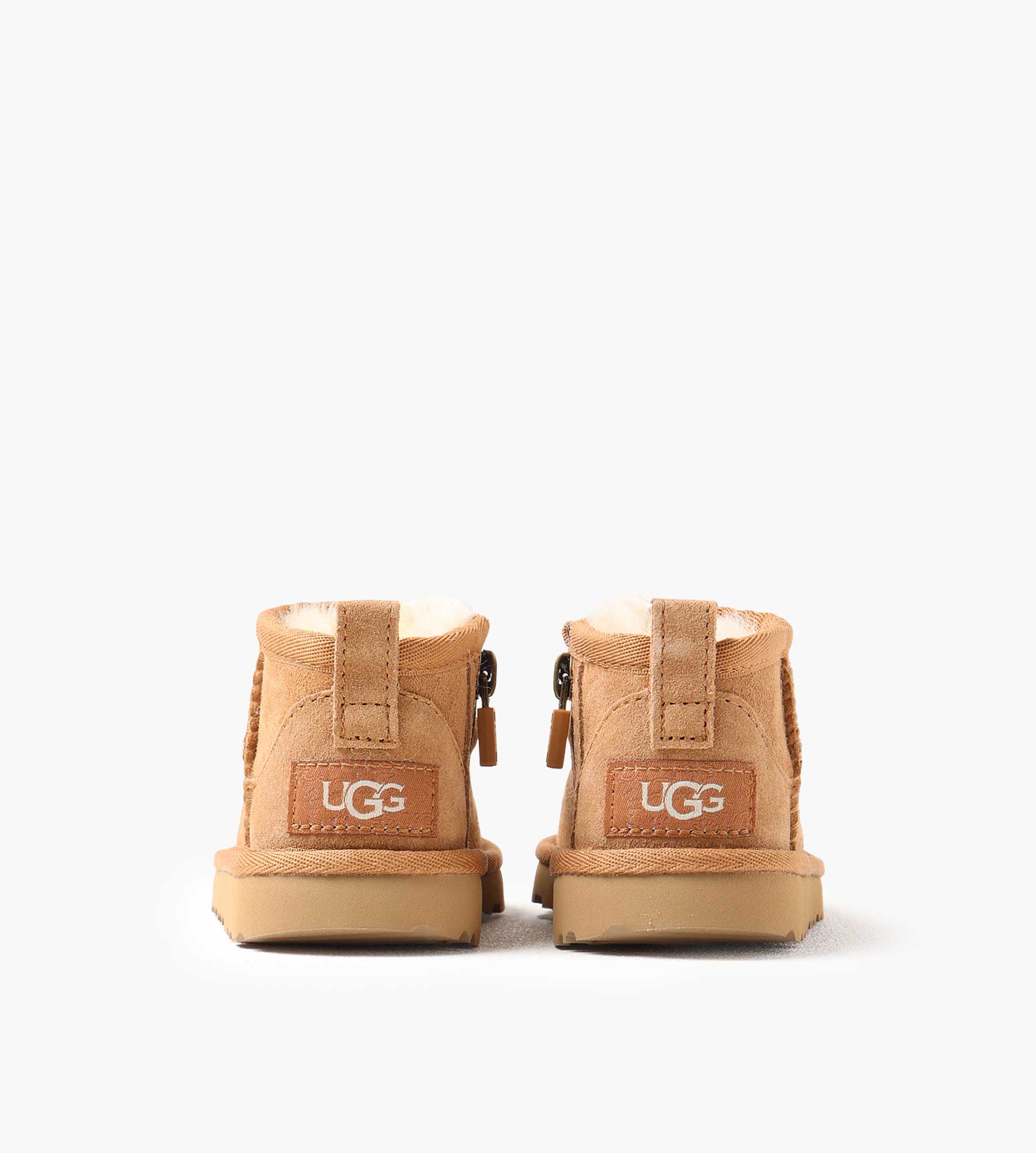 The UGG Classic Ultra Mini Boots in Chestnut are crafted from premium sheepskin, offering a plush feel and natural warmth. The low-profile silhouette is designed for easy slip-on wear, making them a versatile addition to any footwear rotation.