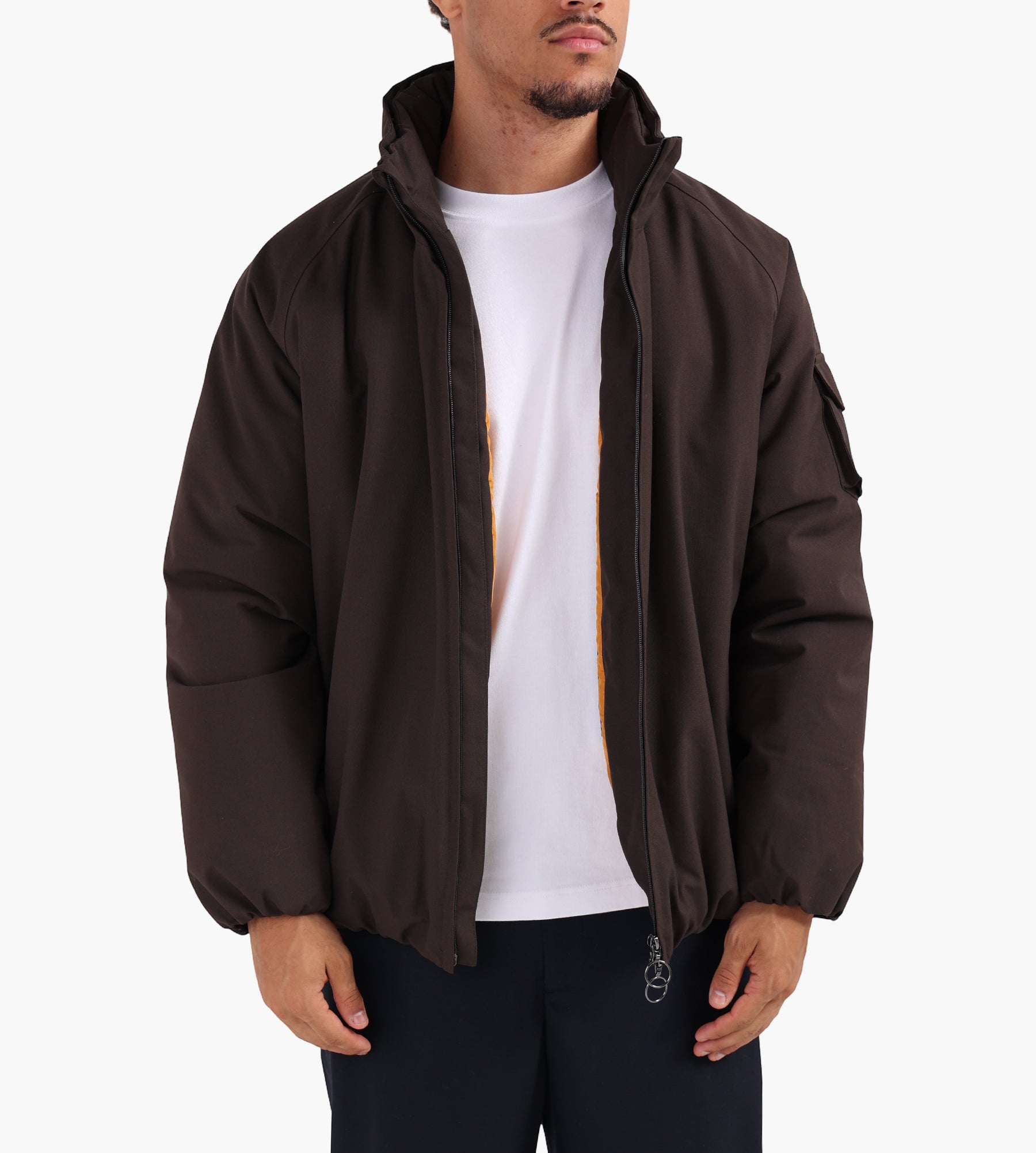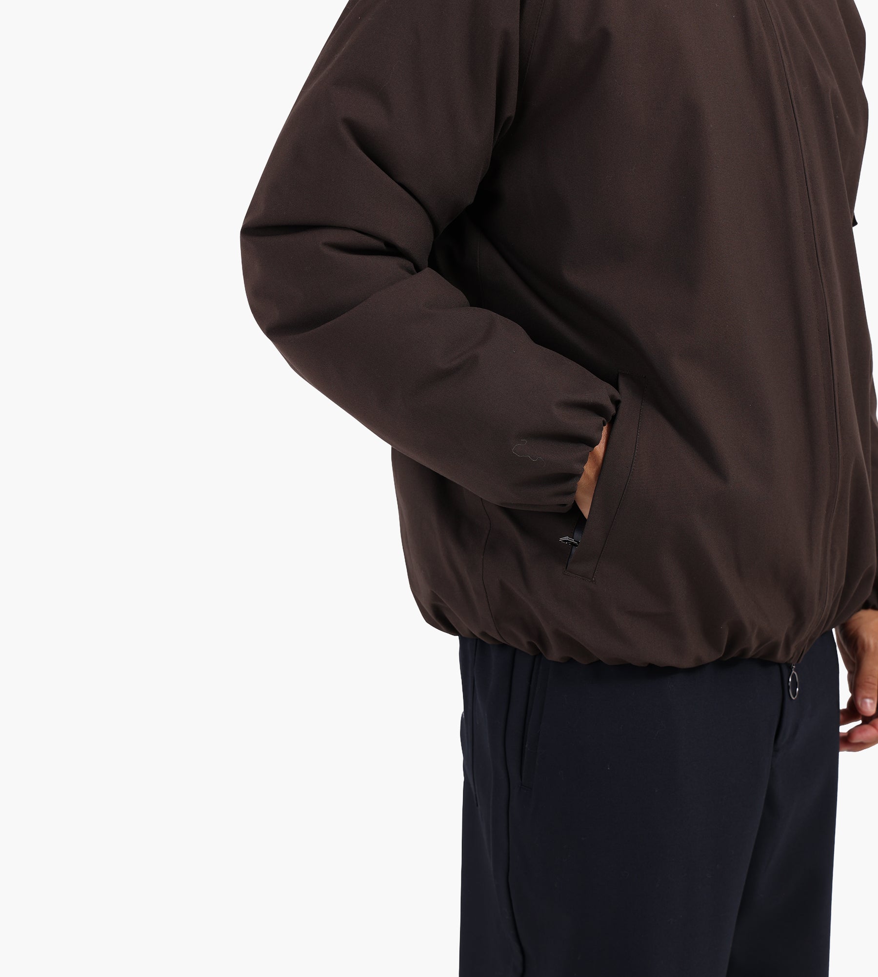 Recycled polyester insulation provides warmth down to minus 10 degrees Celsius, while taped seams and a waterzip front closure further shield against the elements. A hidden hood with adjustment regulators and adjustable hem cords add versatility, making it an adaptable winter coat for both urban and outdoor settings.