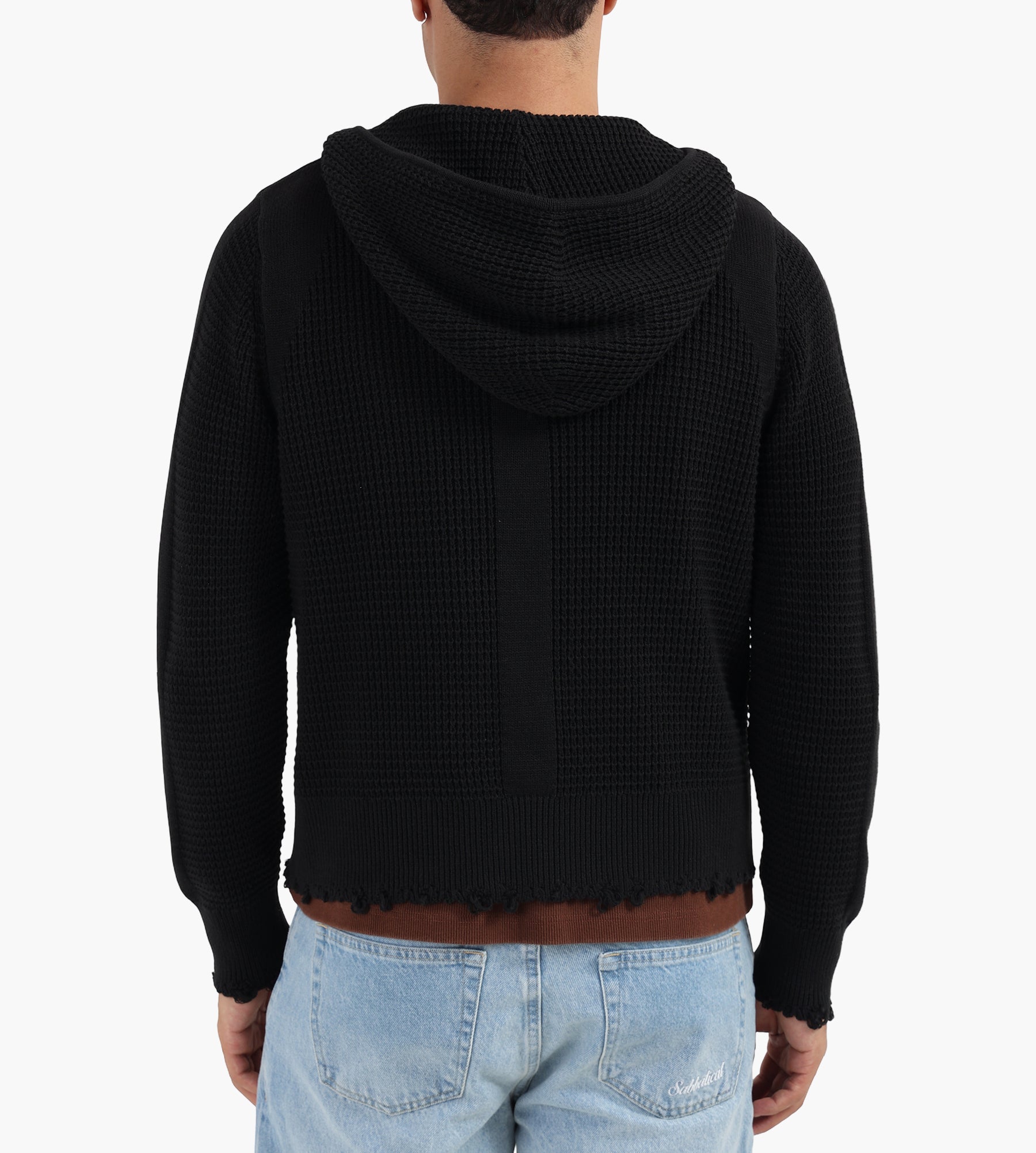 The Won Hundred Glasgow Knit Hood in black is crafted from 100% cotton, offering a breathable yet substantial layer with a refined texture. Distressed edges and plain knit details at the shoulders lend subtle character, while the special cross-stitch accents highlight the brand's dedication to craftsmanship.