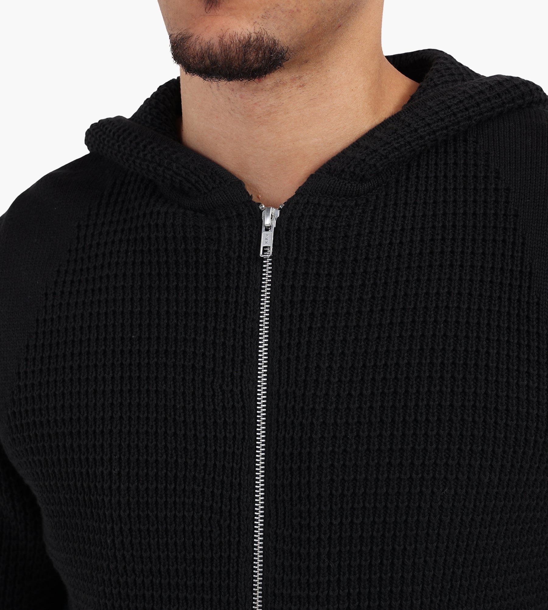 A two-way metal zipper adds versatility, allowing for adjustable styling and airflow, whether layered over a tee or under a heavier coat. With its true-to-size fit, this cotton knit hoodie provides a comfortable drape that merges utility with understated elegance.