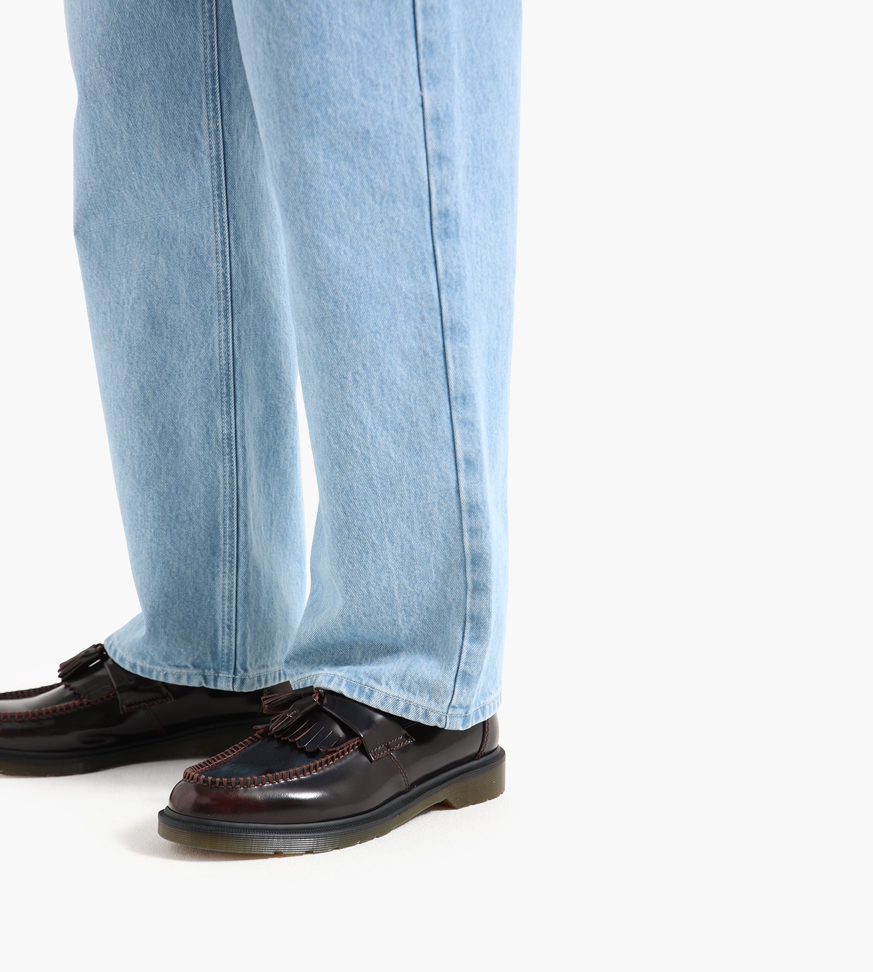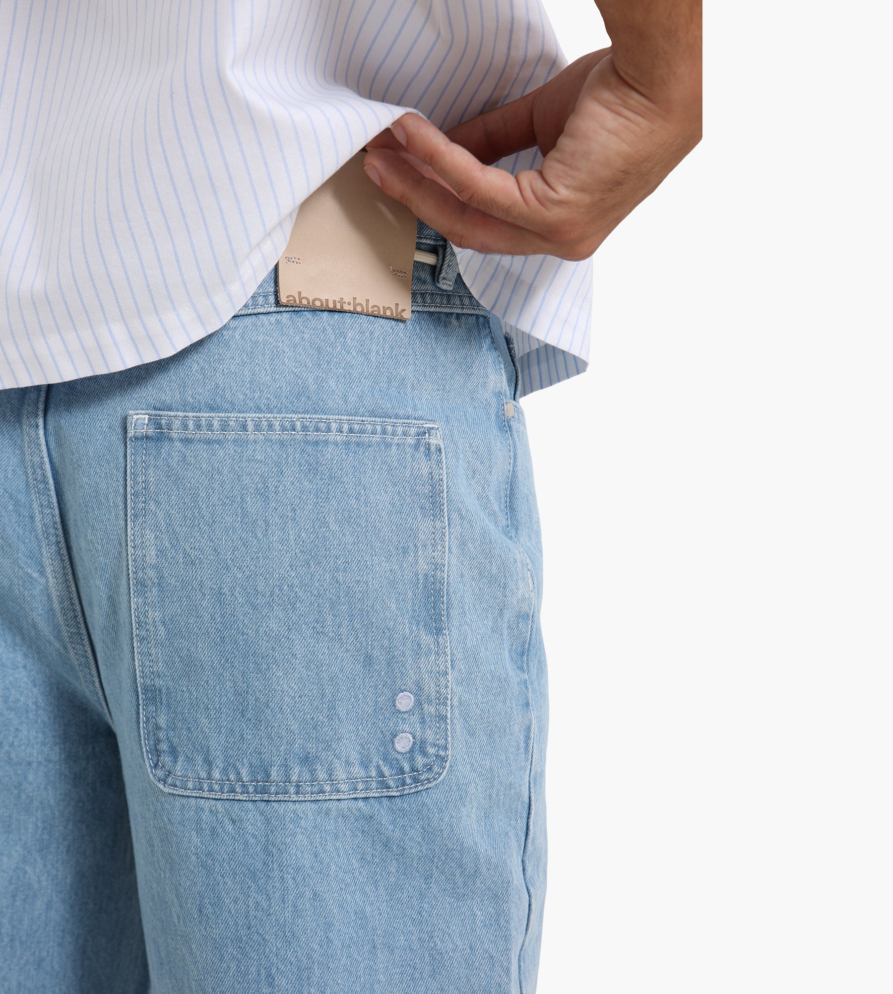 Crafted from 100% cotton 14oz mid-weight denim, the about:blank Relaxed Denim Jean in Light Blue Wash offers a soft yet substantial feel. The baggy silhouette and shoelace belt underscore its laid-back aesthetic, while subtle embroidered detailing on the back pocket and a leather Jacron patch add understated character. Designed with multiple pockets and a button-and-zip closure, it balances utility with a clean, modern finish.
