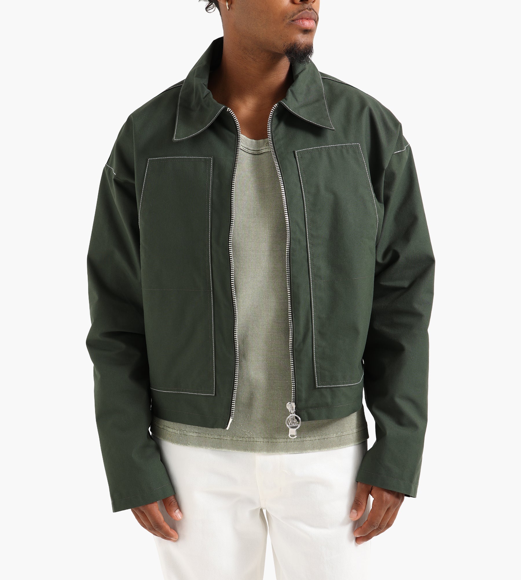 The Utility Jacket in Green Ecru blends rugged functionality with casual style. Designed with durable materials and practical details, it’s perfect for everyday wear and outdoor adventures alike.