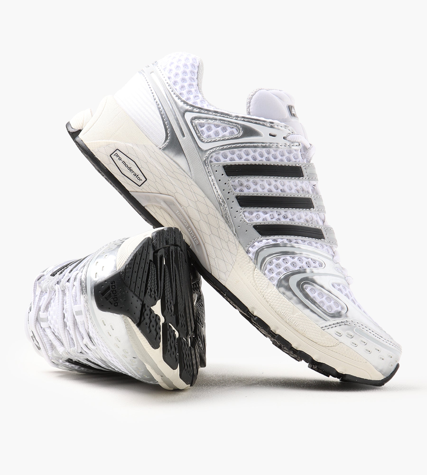 The Adidas Adistar Control 5 in Silver Metallic/Gray One/Core Black combines an open mesh upper with metallic silver accents for breathability and a sleek, retro-inspired aesthetic. Synthetic 3-Stripes anchor the design, while a cushioned EVA midsole pairs with Adiprene+ in the forefoot to deliver a smooth, responsive ride.