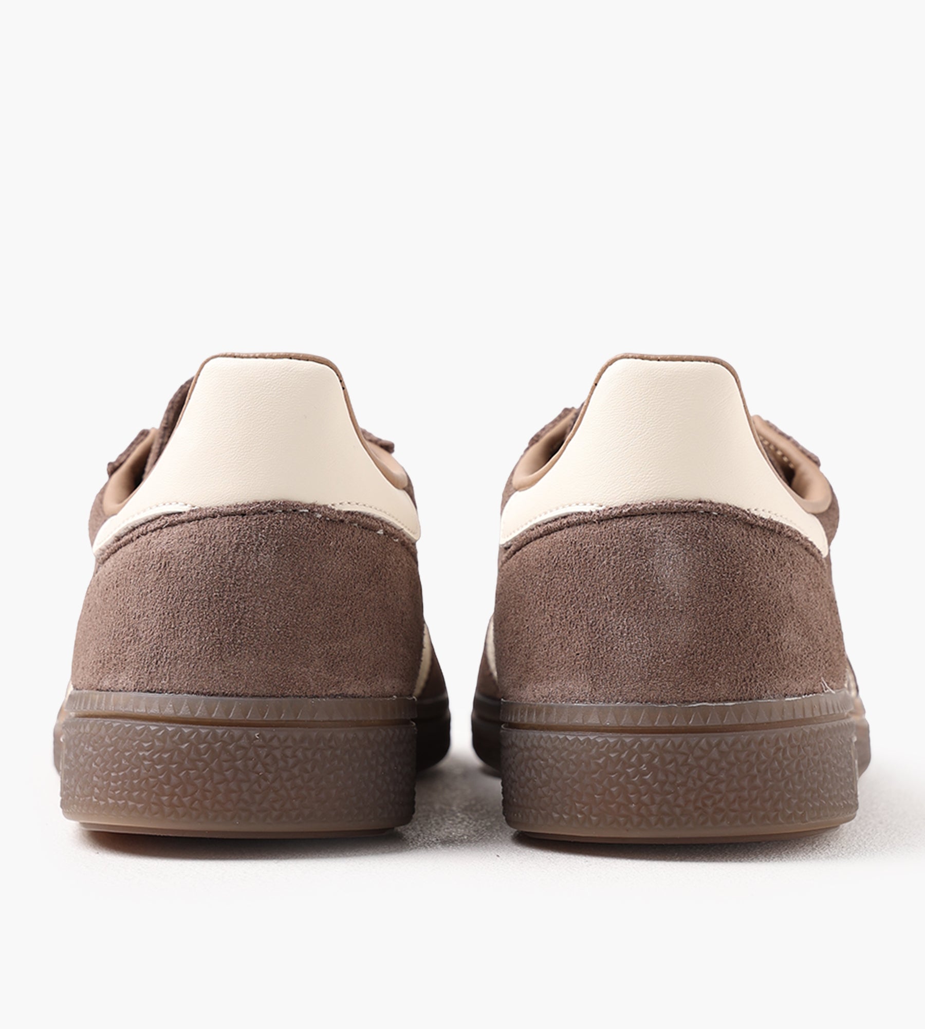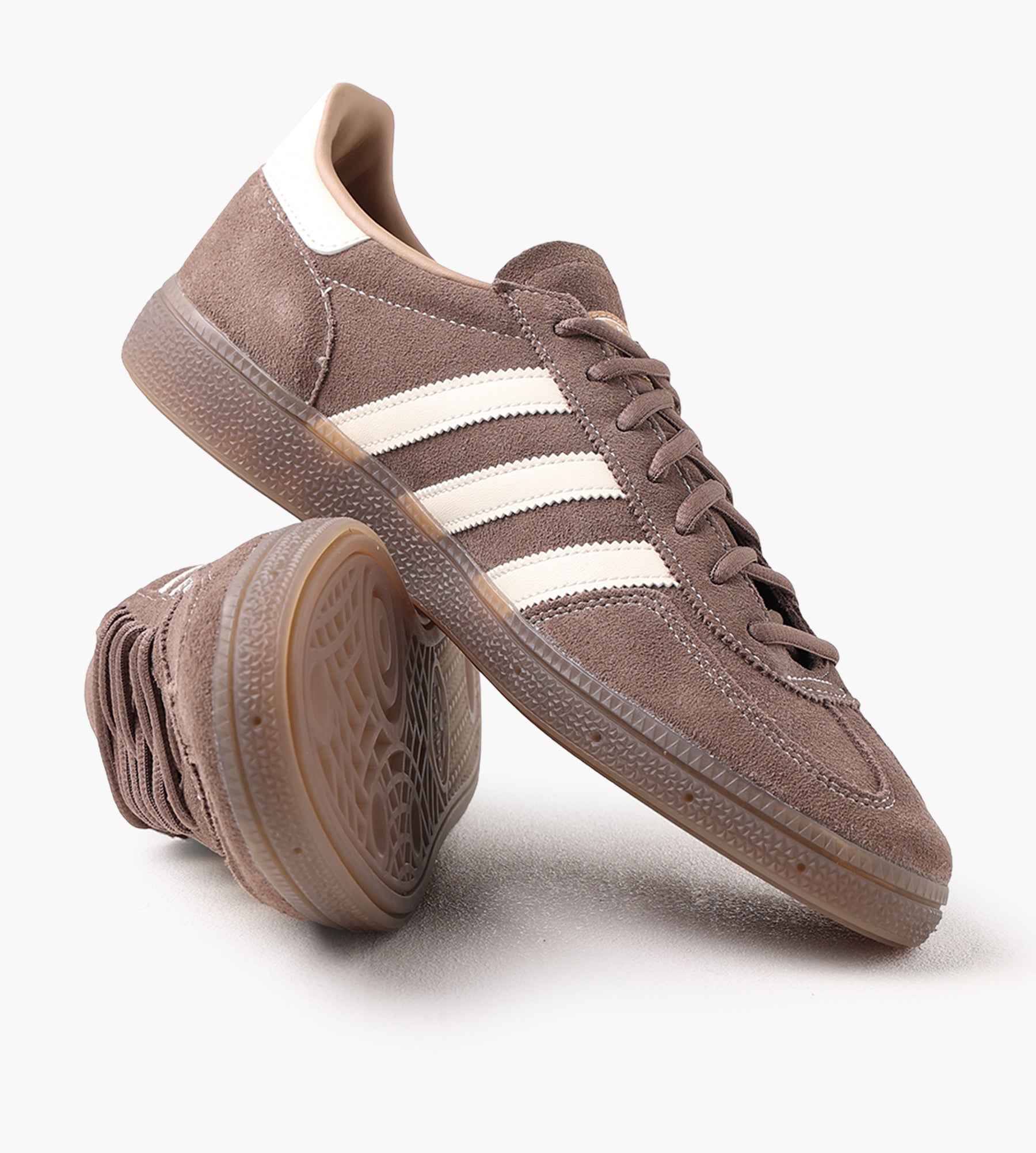 The adidas Handball Spezial in Earth Strata and Off White reimagines a '70s indoor sports classic with a supple suede upper. A tonal T-shaped toebox and serrated 3-Stripes logo nod to its heritage, while metallic "SPEZIAL" lettering adds a refined finish. The gum rubber outsole anchors the design, offering reliable grip and a timeless aesthetic.