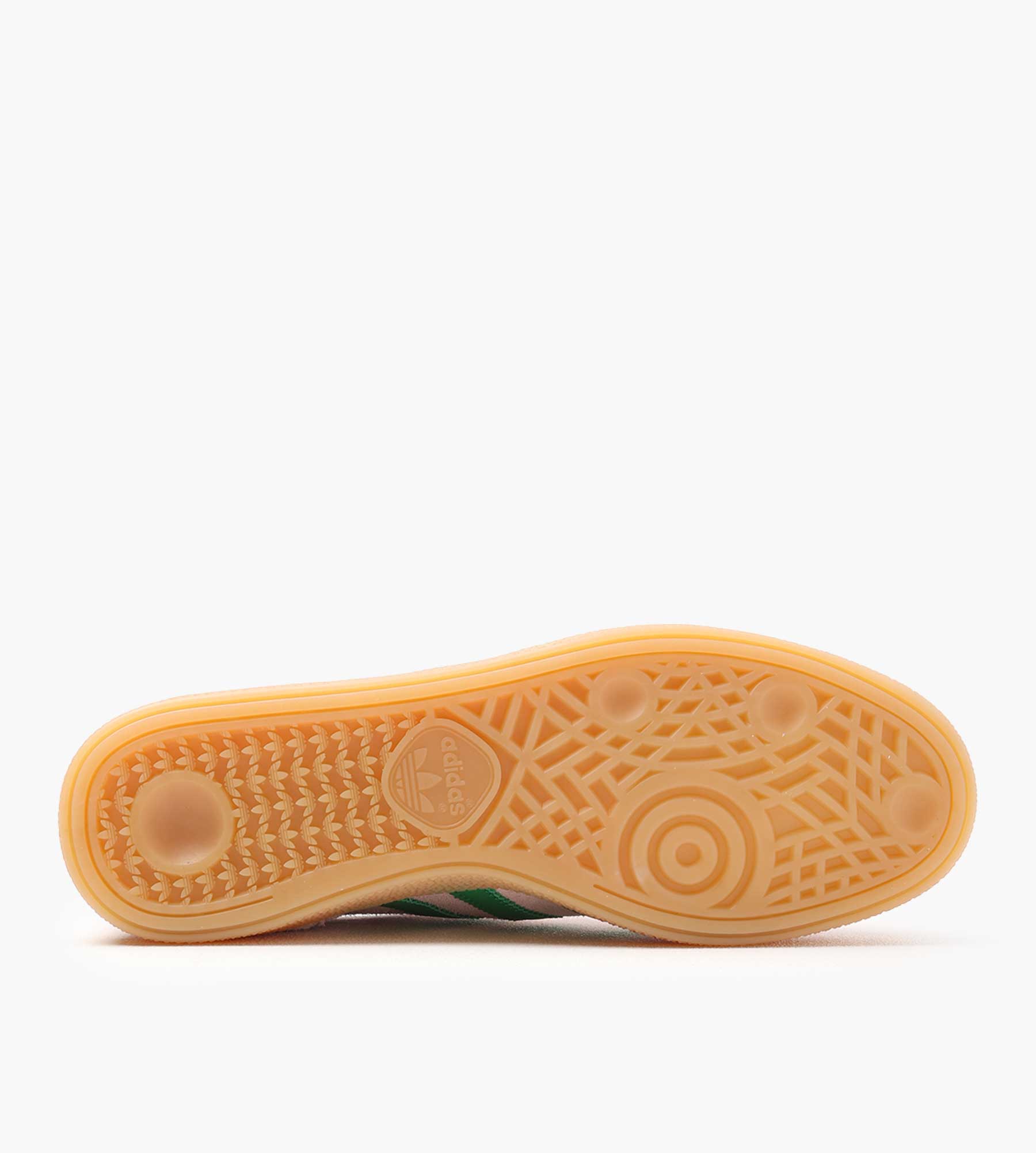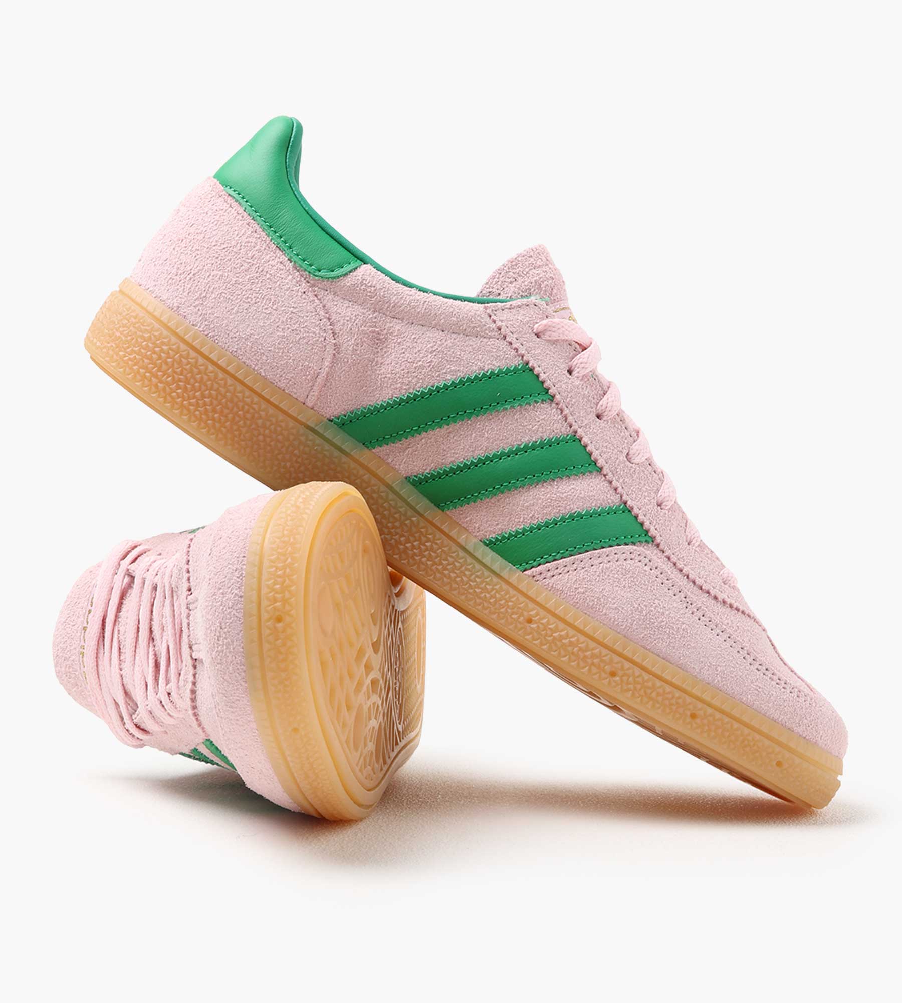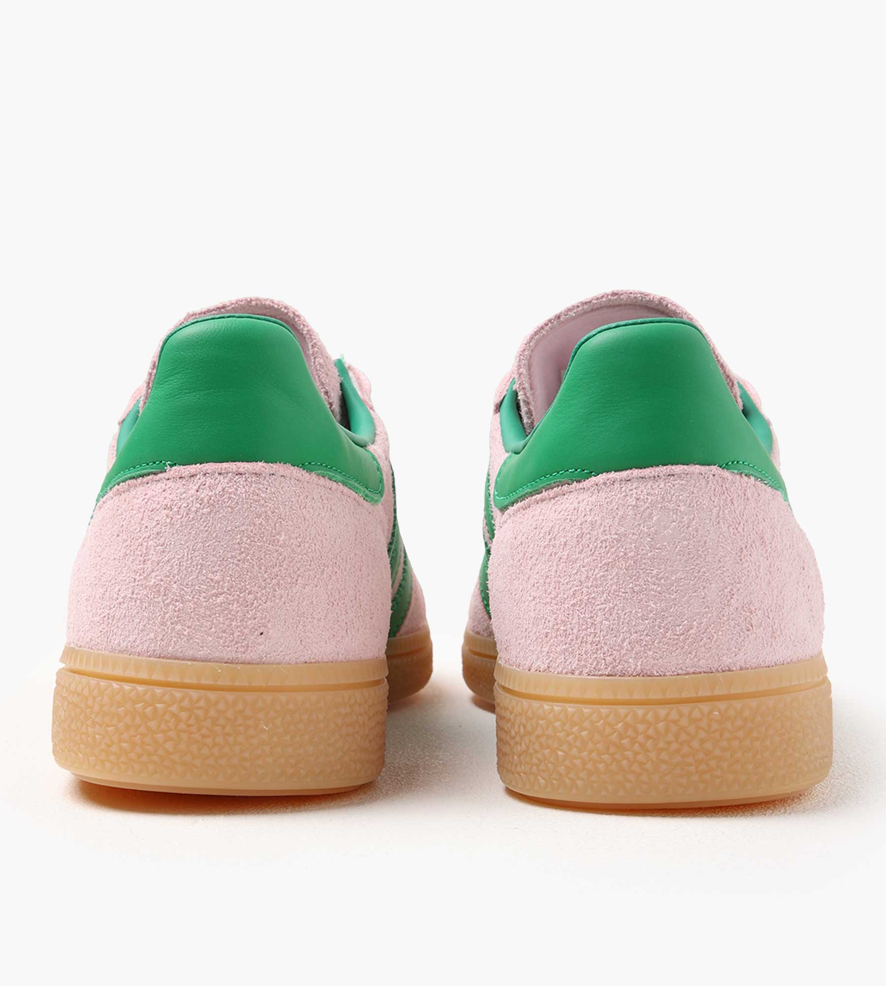 The Adidas Handball Spezial sneakers in Clear Pink, Green, and Gold Metallic pay homage to the brand's rich heritage in indoor sportswear. Crafted with a premium suede upper, the design delivers a tactile finish that enhances the retro-inspired aesthetic. Subtle metallic accents and the iconic three stripes anchor the look in timeless Adidas identity.
