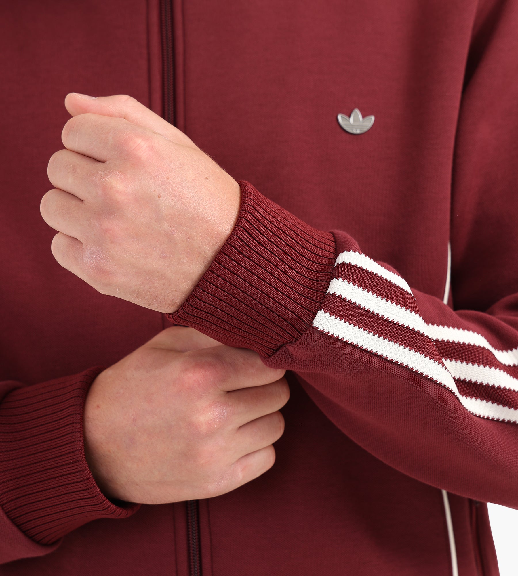 The Adidas Originals Track Top Premium in Shadow Red is crafted from a refined blend of 54% cotton, 43% recycled PET, and 3% elastane. This composition ensures a soft, breathable feel while incorporating sustainable materials. Designed with a sleek, slim-fit silhouette, it contours to the body for a streamlined look, ideal for layering or standalone wear.