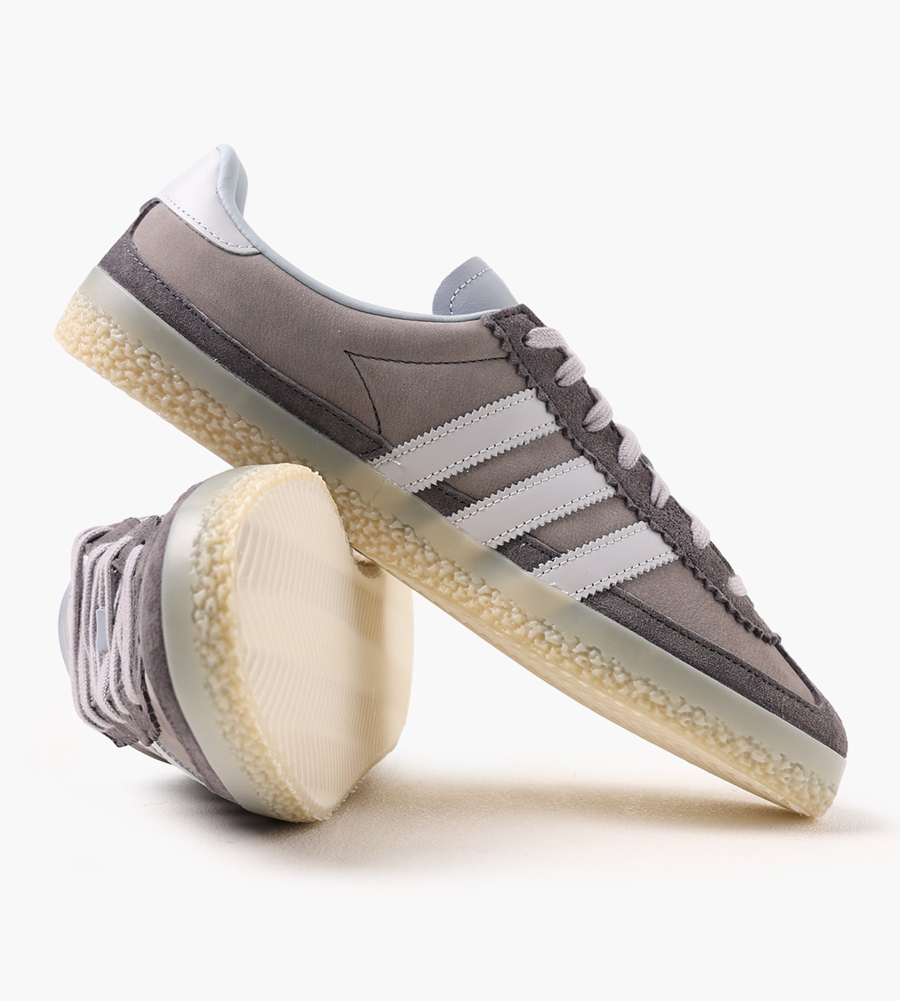 The adidas Roelee SPZL F.C. in Light Gray/Gray Six/Light Solid Gray combines textured leather with suede overlays, creating a refined yet durable upper. Serrated leather 3-Stripes and light blue leather accents on the tongue, back tab, and stripes pay homage to archival design codes, inspired by the adidas Madeira model. A semi-translucent gum outsole anchors the look with a nod to classic Gazelle soles.