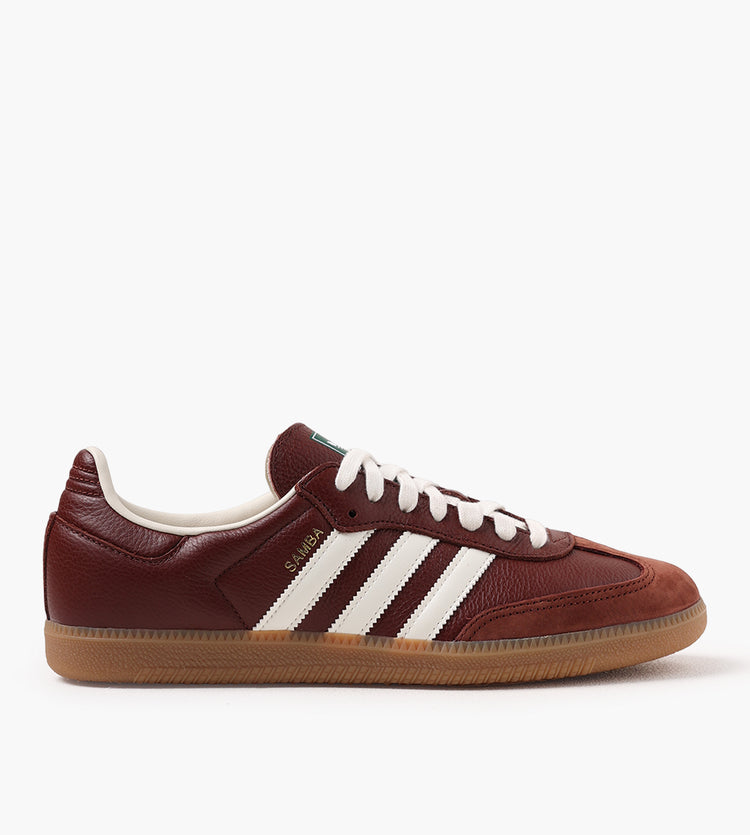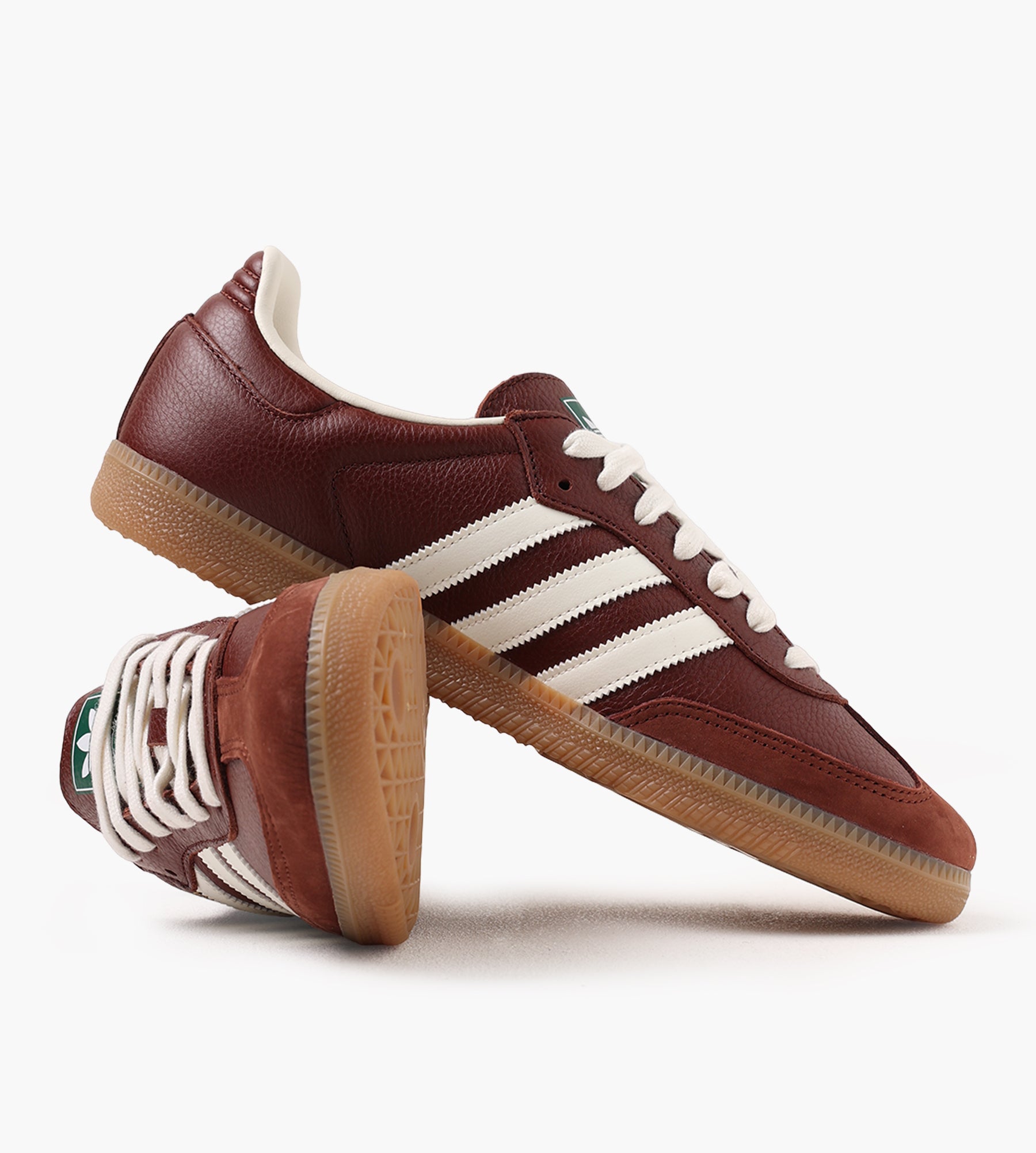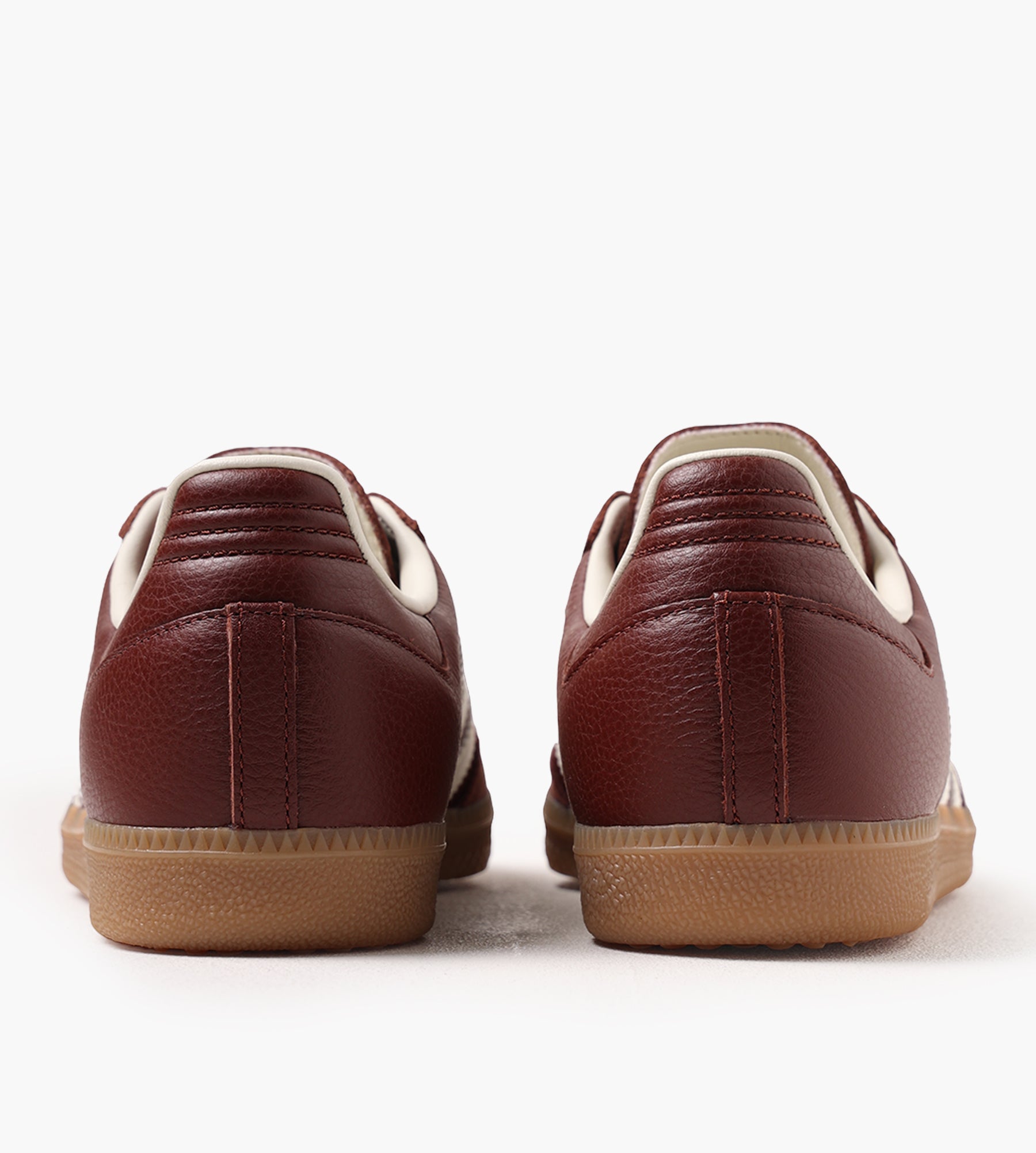 The Adidas Samba OG in Fox Brown, Off-White, and Gum4 redefines a heritage silhouette with premium materials. A full-grain leather upper is accented by soft suede overlays, delivering both durability and texture. The gum rubber outsole anchors the design with reliable grip and a classic finish, while the low-profile construction maintains its iconic shape.