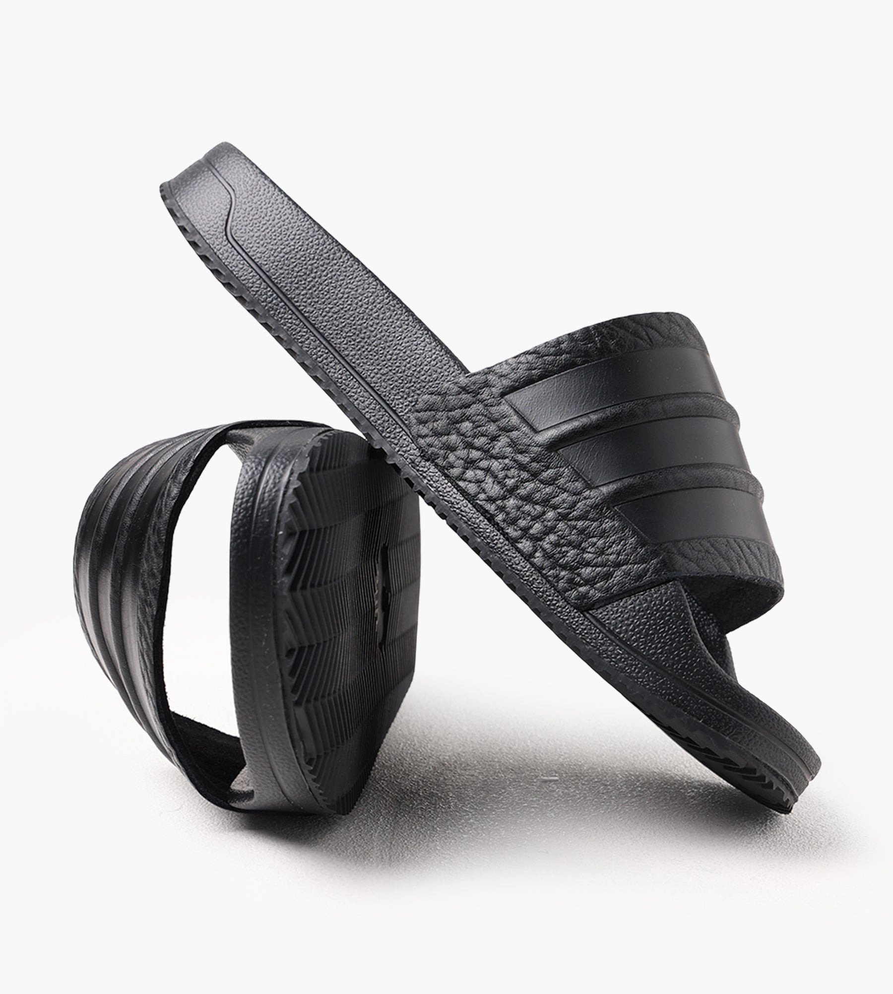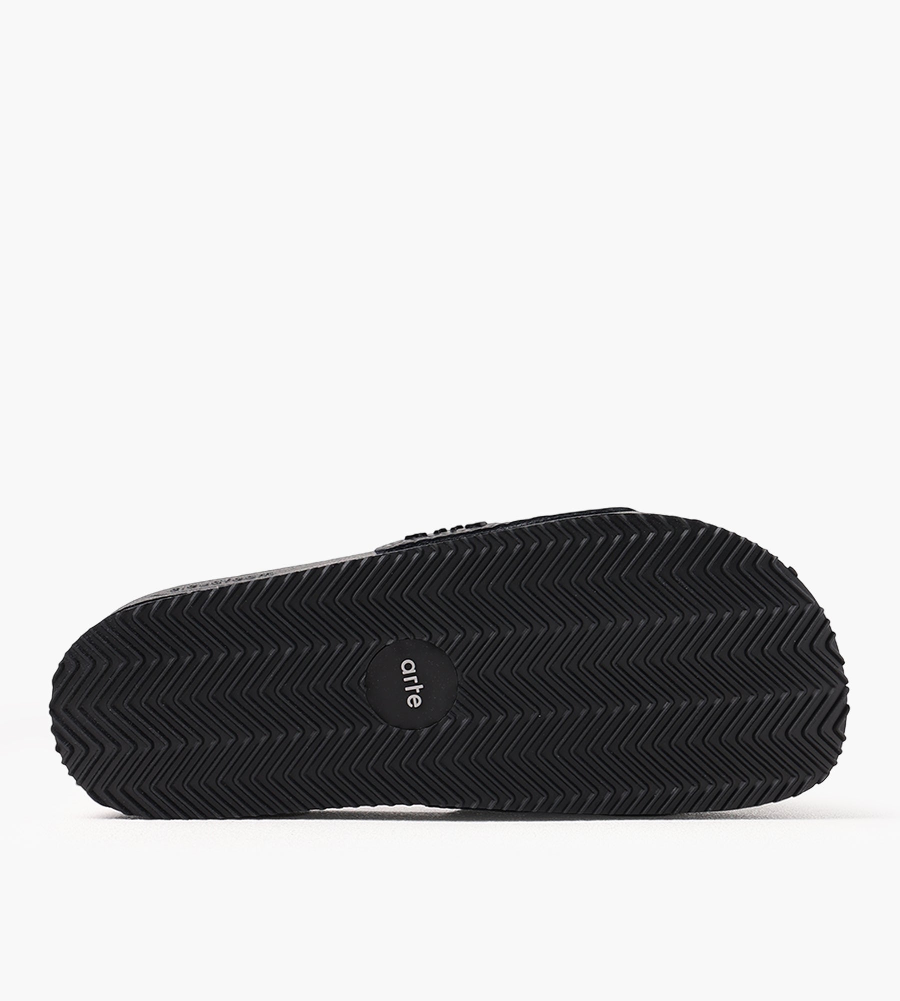 The Arte Antwerp x adidas Adilette slides in Core Black redefine casual footwear with a premium leather upper, offering a sleek, monochromatic finish. Signature adidas 3-Stripes branding pairs seamlessly with the Arte logo, underscoring the collaboration's attention to detail and cultural narrative. Ergonomically designed, the slides feature a Cloudfoam footbed that cushions every step, while the quick-drying materials make them practical for both water-based activities and everyday wear.