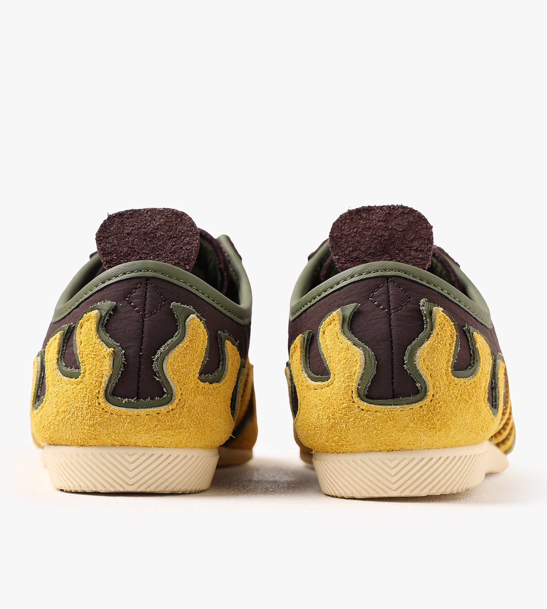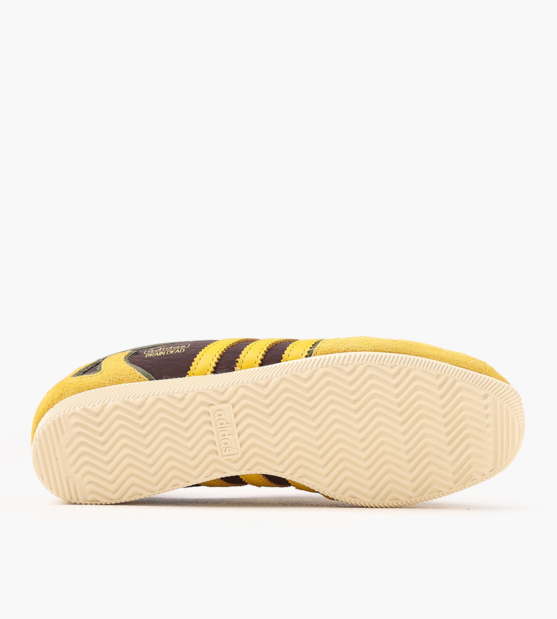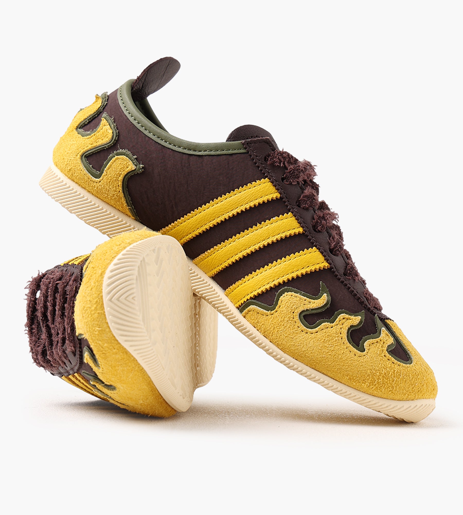 The Adidas x Brain Dead Japan Lo sneakers in Shadow Brown and Hazy Yellow reinterpret classic low-top silhouettes with a bold, collaborative edge. Crafted from premium leather and suede, the design balances texture and durability, anchored by Adidas' signature 3-Stripe detailing and Trefoil logos for unmistakable identity.