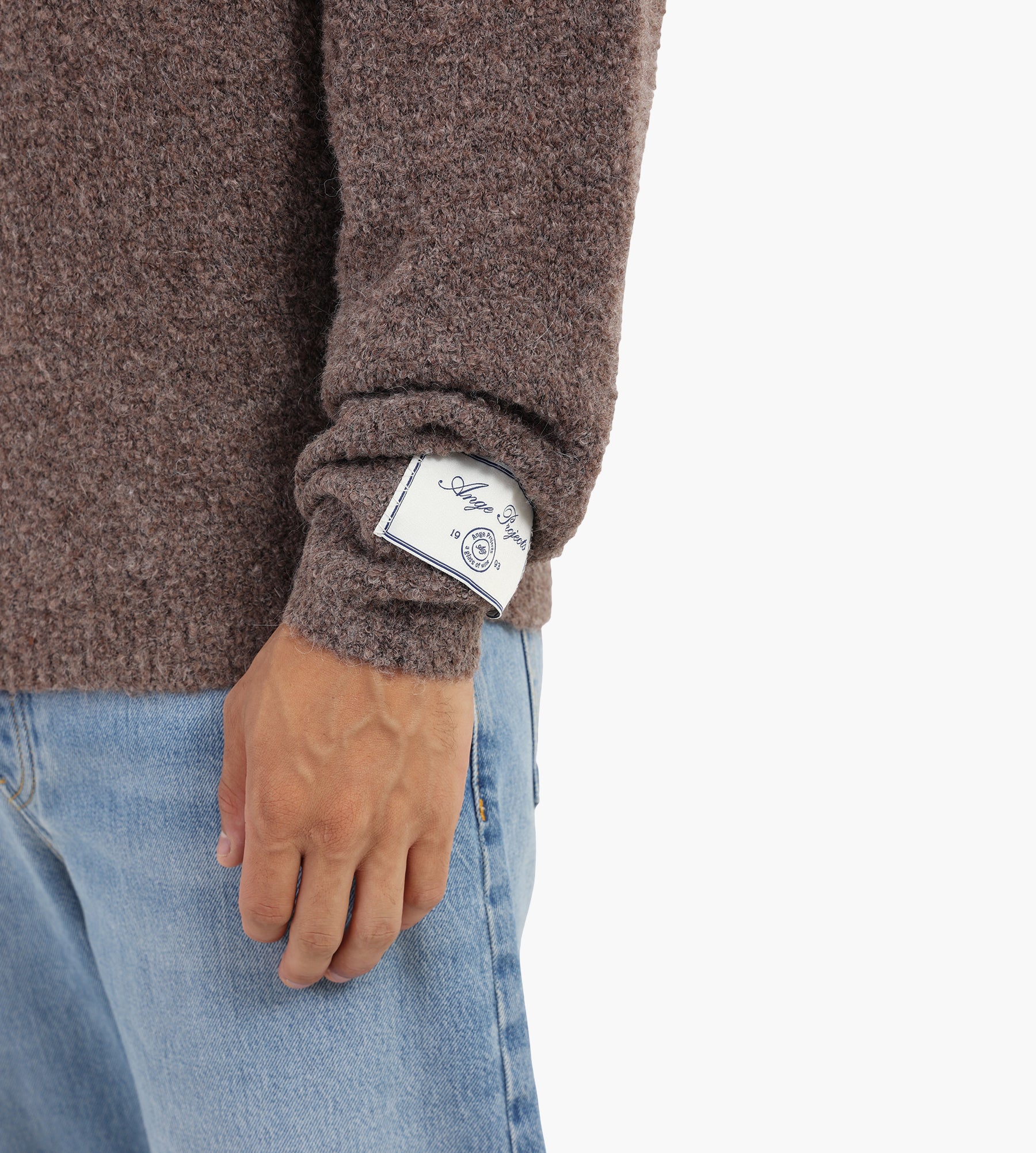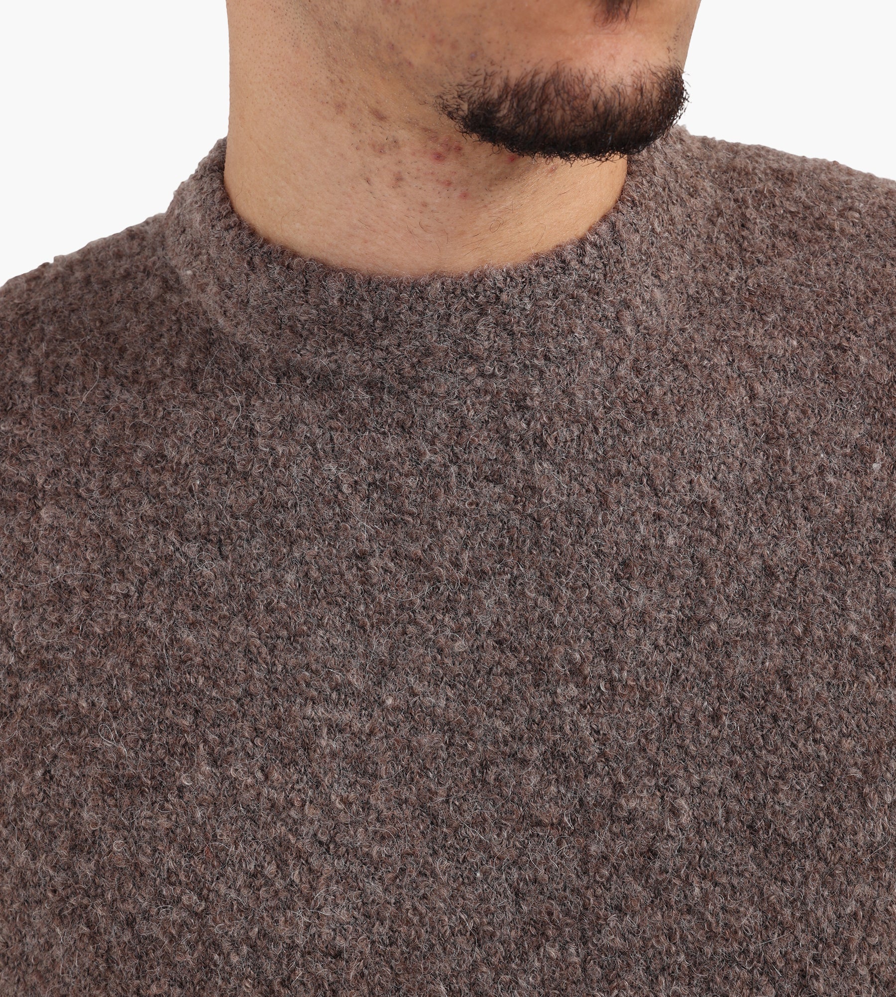 The Ange Projects Bouclé Knit Sweater in Soft Fawn combines a 72% acrylic and 23% wool blend for a lightweight yet cozy feel. The ultra-soft textured bouclé yarn adds depth, while ribbed details along the edges refine the silhouette. A scoop neckline complements the understated crew neck style, creating a versatile piece for layering or standalone wear.