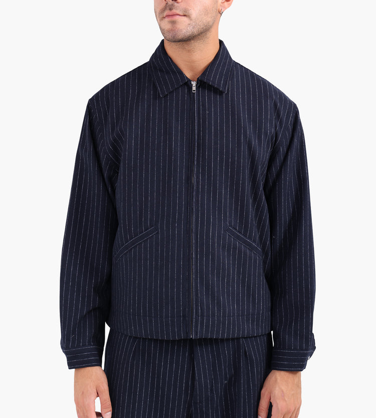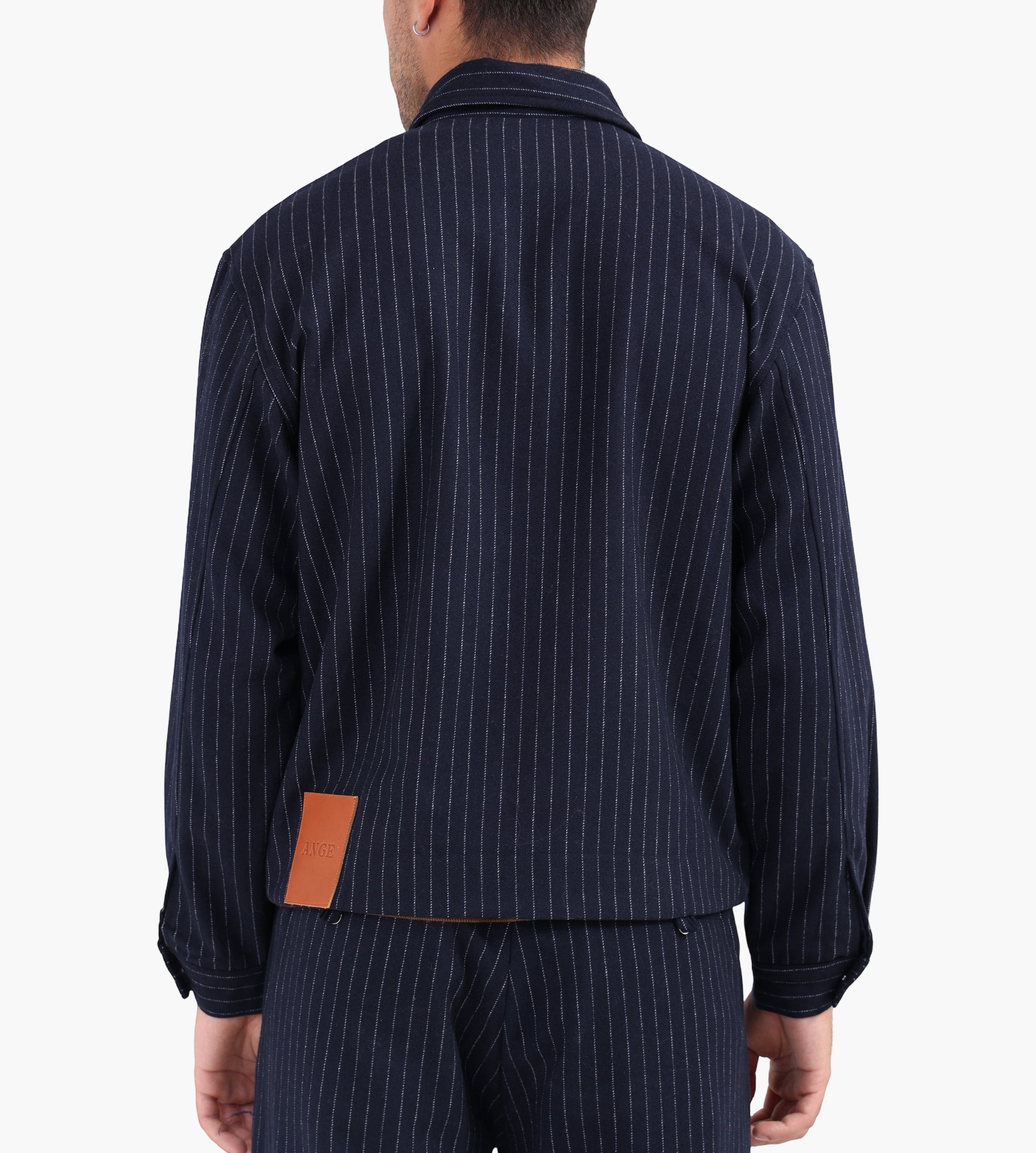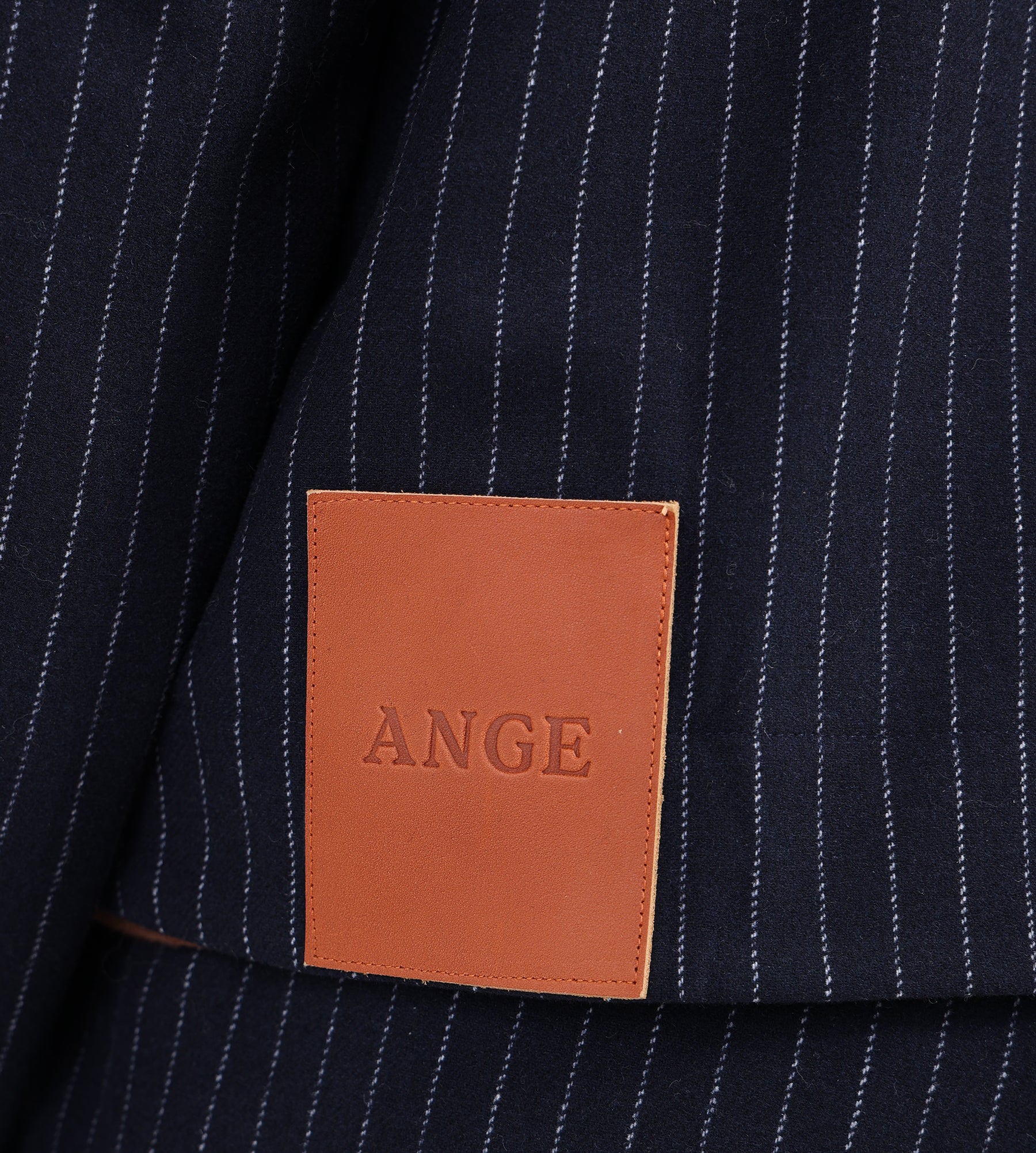 The Ange Projects Pinstripe Wool Blend Jacket in Navy combines a refined pinstripe design with a premium wool blend, offering a balance of structure and comfort. Its single-breasted button-up closure and notched lapel deliver a timeless silhouette, while the smooth lining ensures effortless layering.