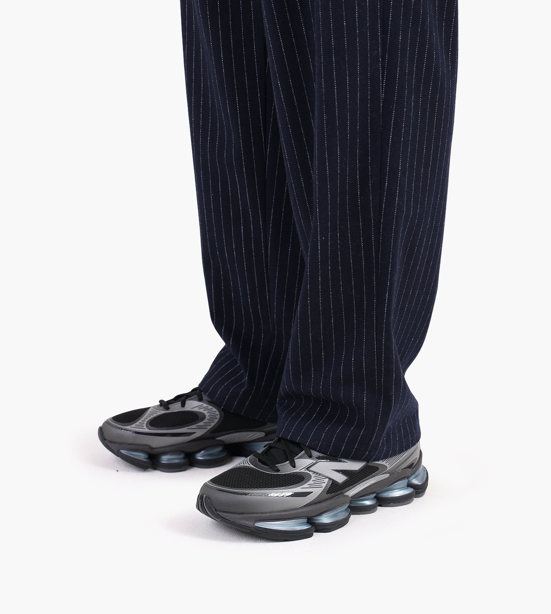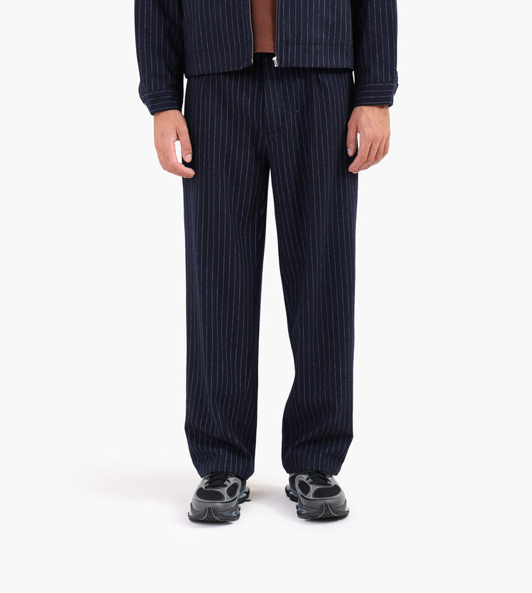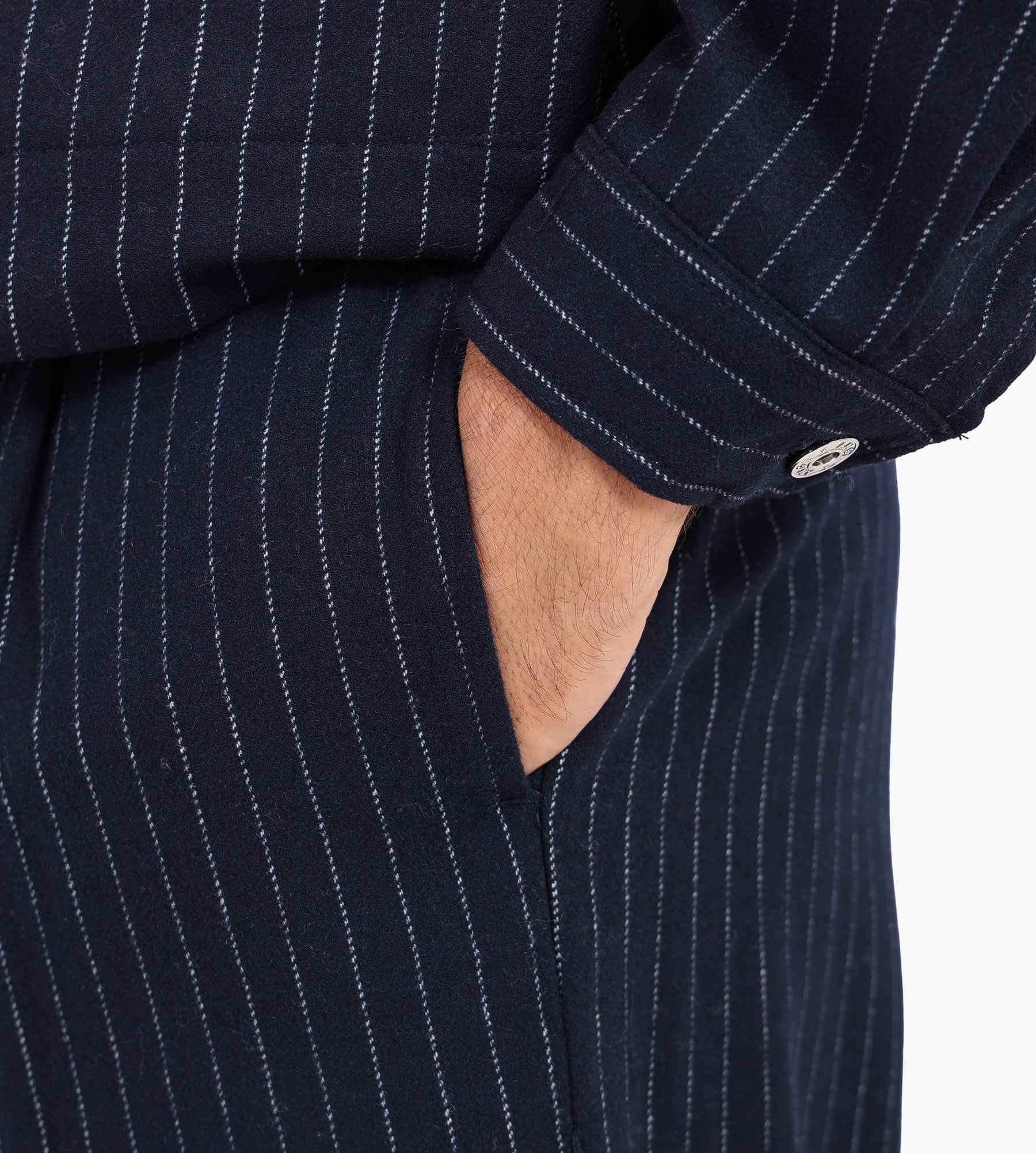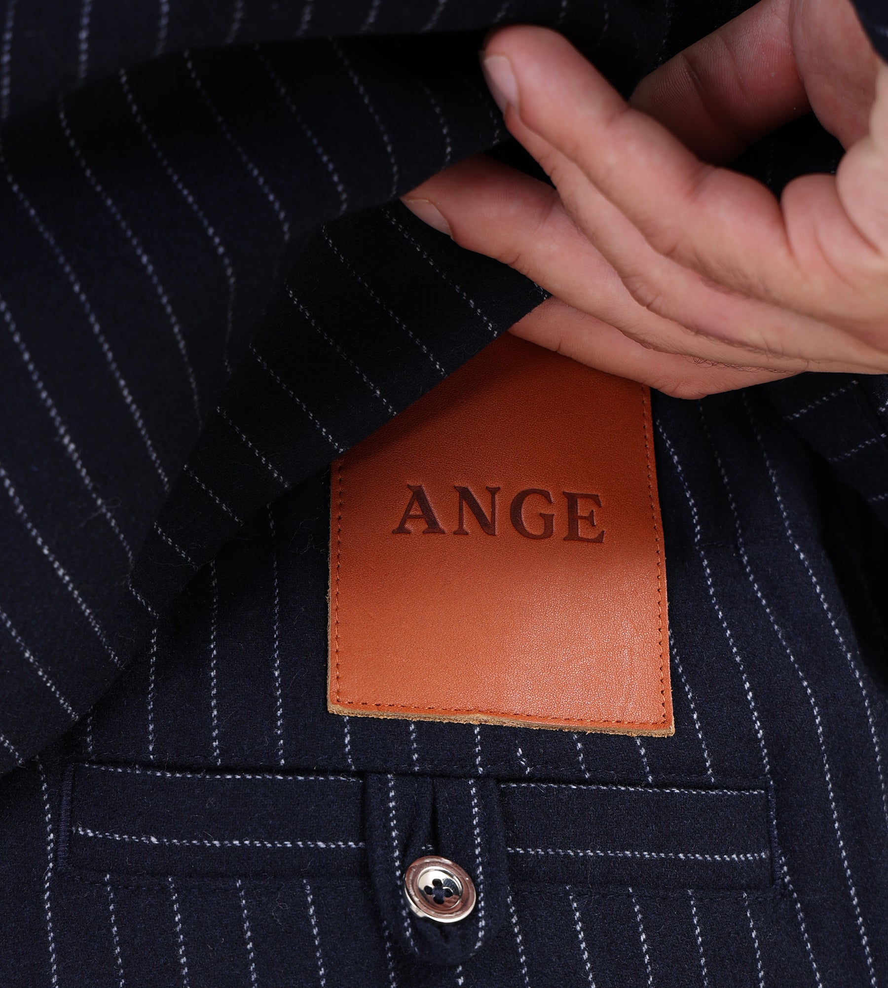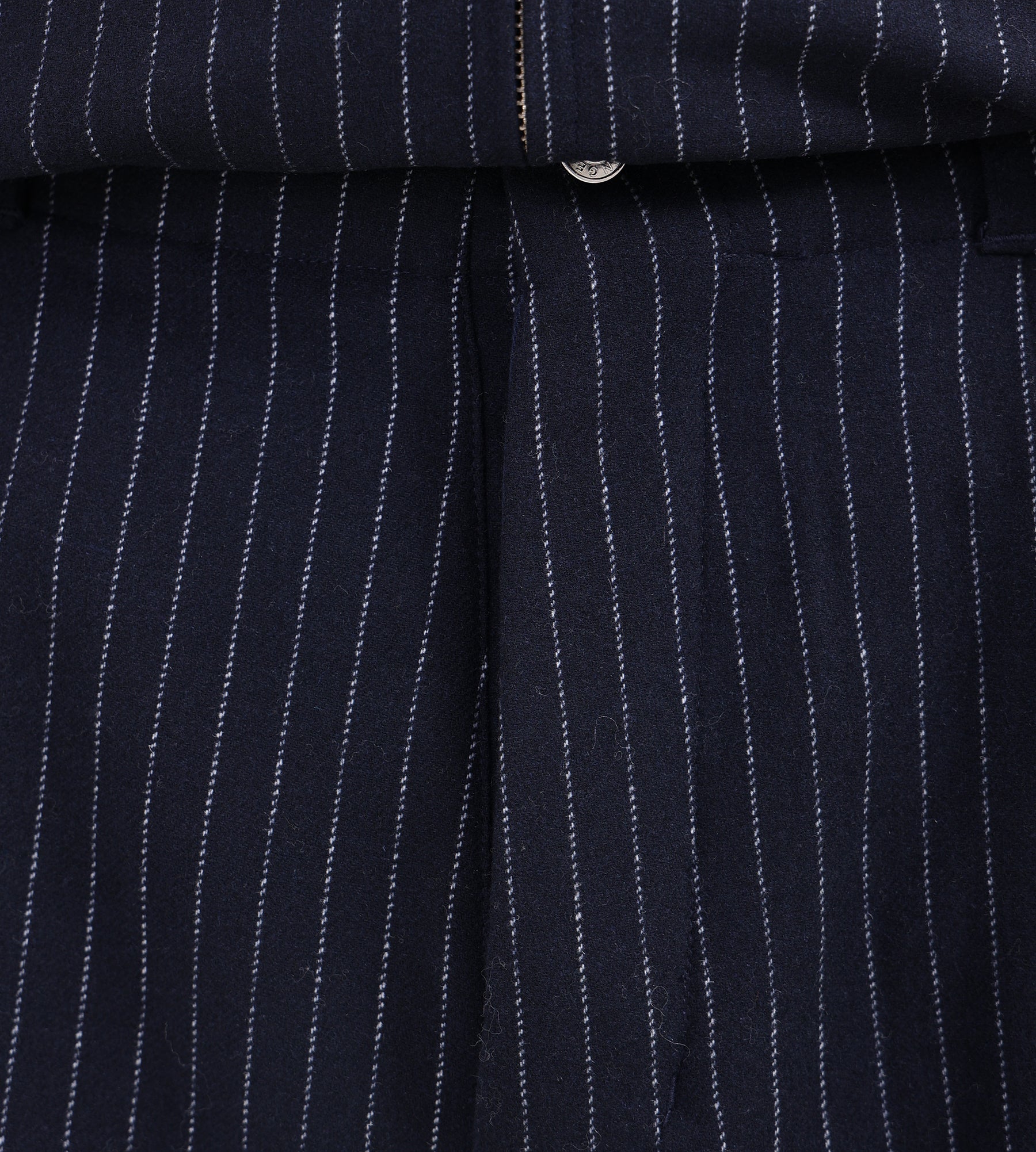 Ange Projects Pinstripe Wool Trousers in Navy Blue are crafted from a premium blend of 55% wool, 30% polyester, 10% nylon, and 5% other fibers. The Italian striped fabric lends a refined texture, while the vertical pinstripe design enhances the slimline silhouette. A hook-and-bar fastening anchors the design with a tailored finish, ideal for formal or professional settings.