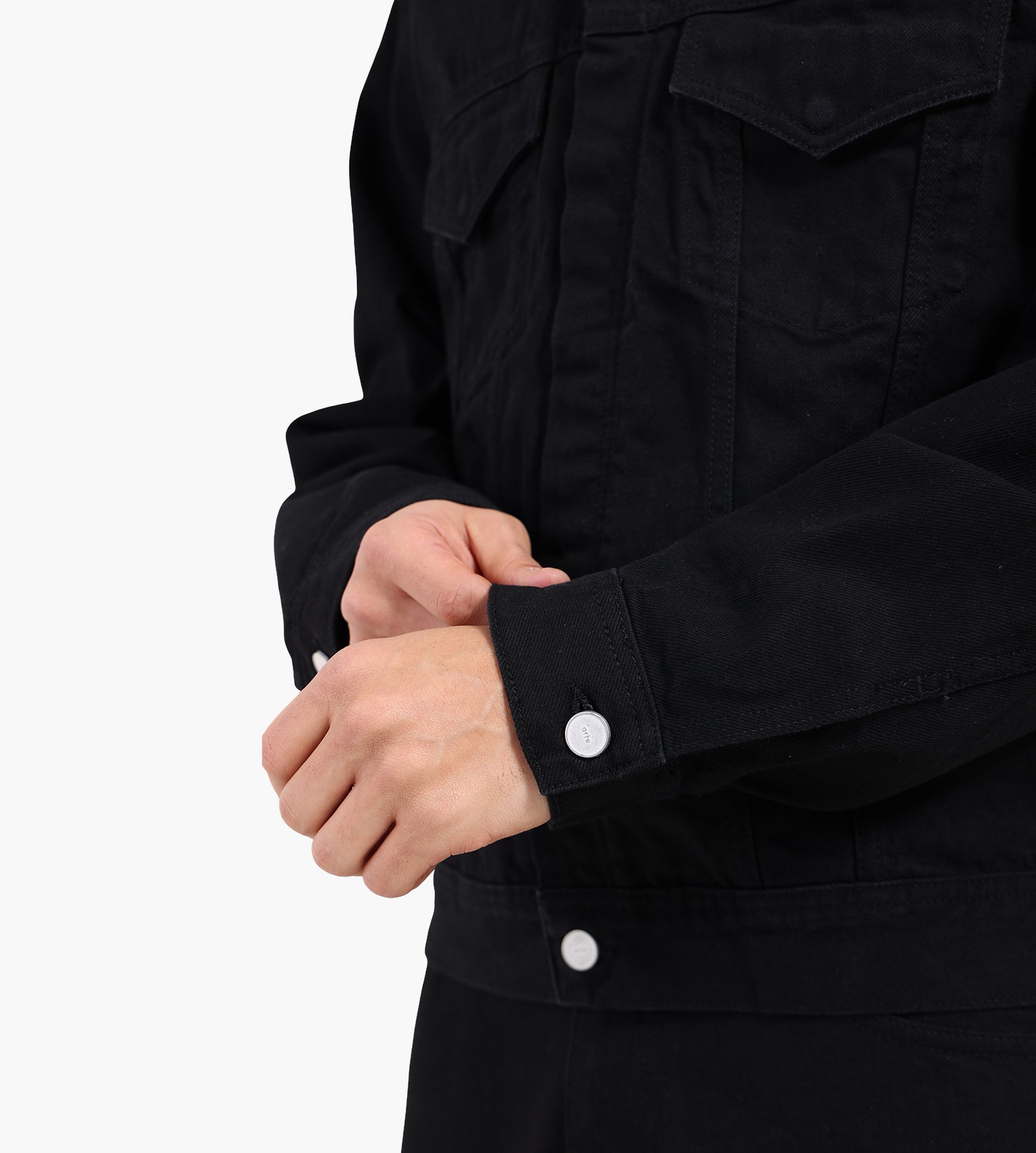 The Arte Antwerp Circle Logo Jeans Jacket in Black is crafted from 100% cotton, offering a structured yet comfortable fit. Its premium denim construction anchors the piece, ensuring durability and versatility for everyday layering. A hidden button placket refines the silhouette, while the black colorway lends a timeless edge.