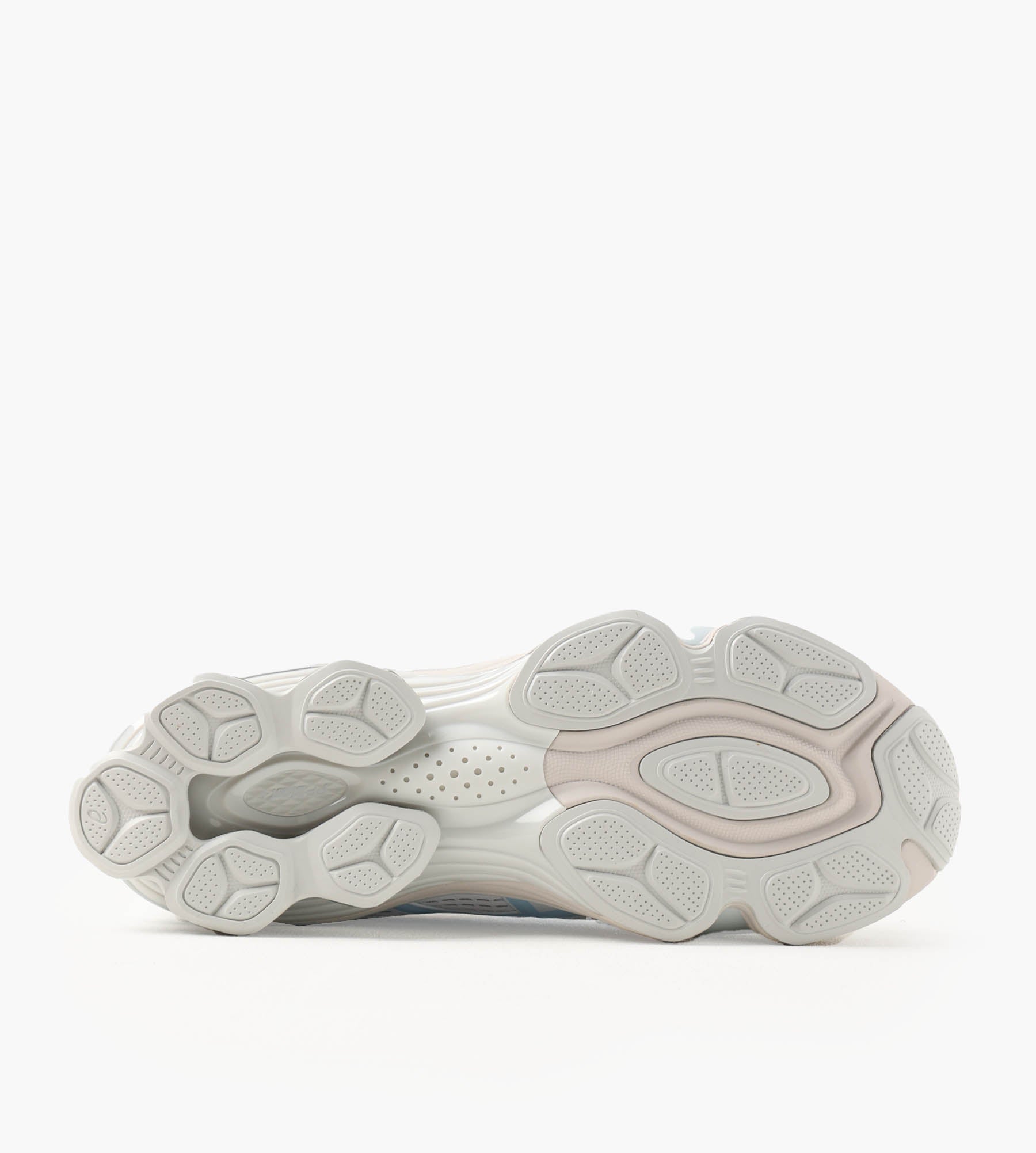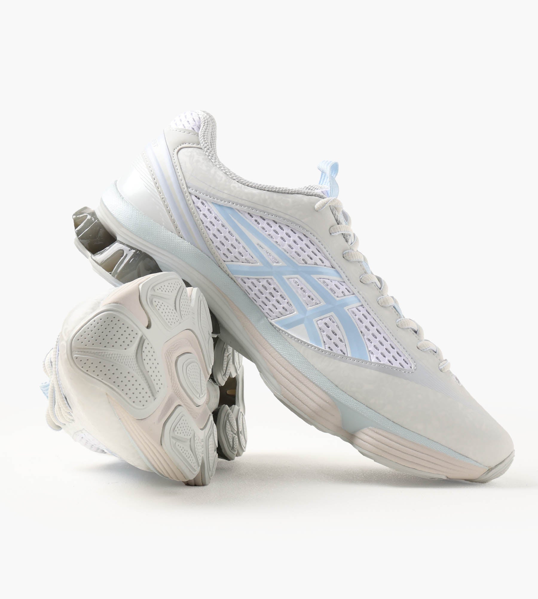 The ASICS US6-S GEL-KINETIC FLUENT in Glacier Gray/Soft Sky merges technical design with artistic influence for a modern sportstyle sneaker. Featuring a two-tone mesh upper with gradation spray details, the shoe showcases innovative welding and eyelet construction. At least 20% of the synthetic leather in the upper is made from recycled materials, reflecting a commitment to sustainability.