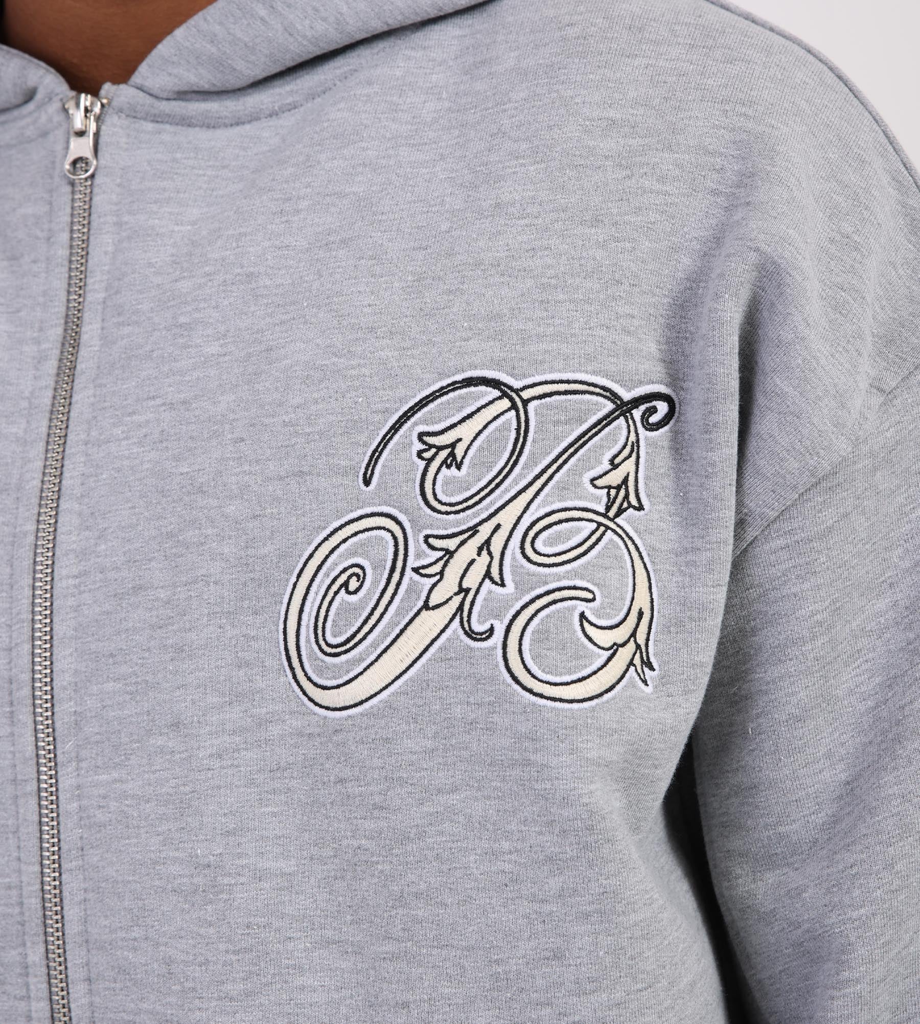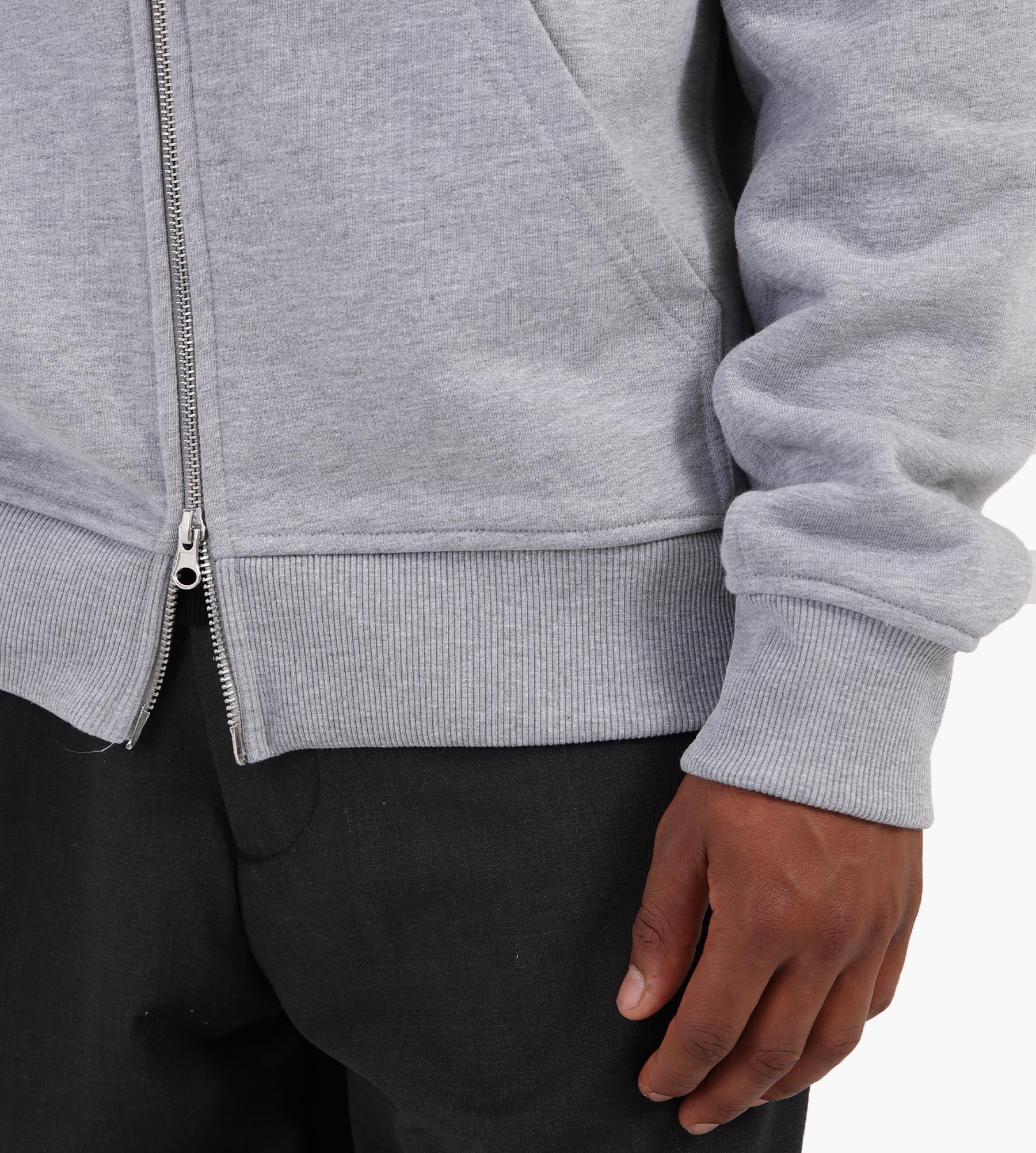 This is the Baskèts Botanical Zip Hoodie Ash Grey, cut from 460gsm organic cotton. It features embroidered artwork inspired by summer days in Vondelpark, finished in a regular fit with side panels and a practical two-way zipper.