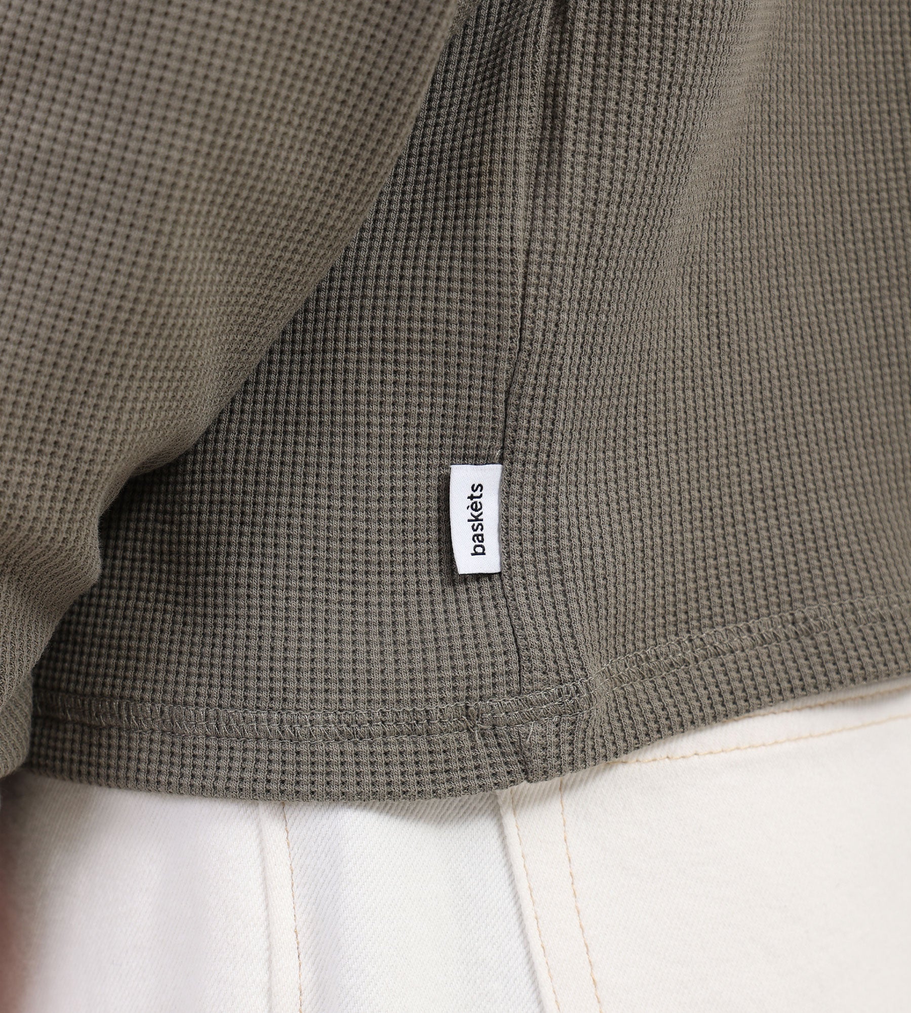 The Baskèts Grid Waffle Longsleeve in Khaki Green blends design with thoughtful detailing for a refined casual look. Crafted with a soft waffle knit, it delivers lightweight warmth, while the small side tab adds a signature touch. Its relaxed silhouette makes it versatile for layering or wearing alone, perfect for everyday wear or street-inspired styling.