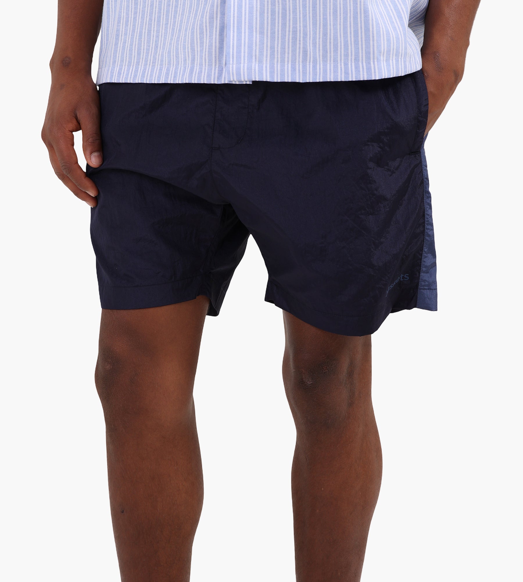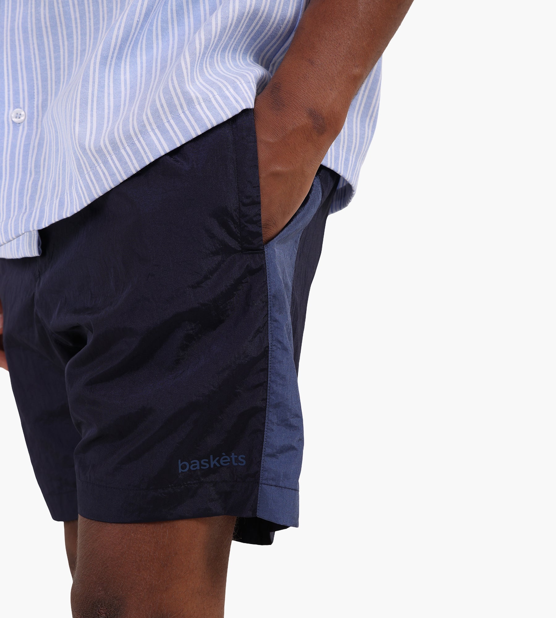 These are the Baskèts Swim Shorts, featuring front pockets, a back pocket with zip, and an elasticated waistband with matching drawstring. Finished with an embroidered logo, contrast side panels, and a relaxed fit.