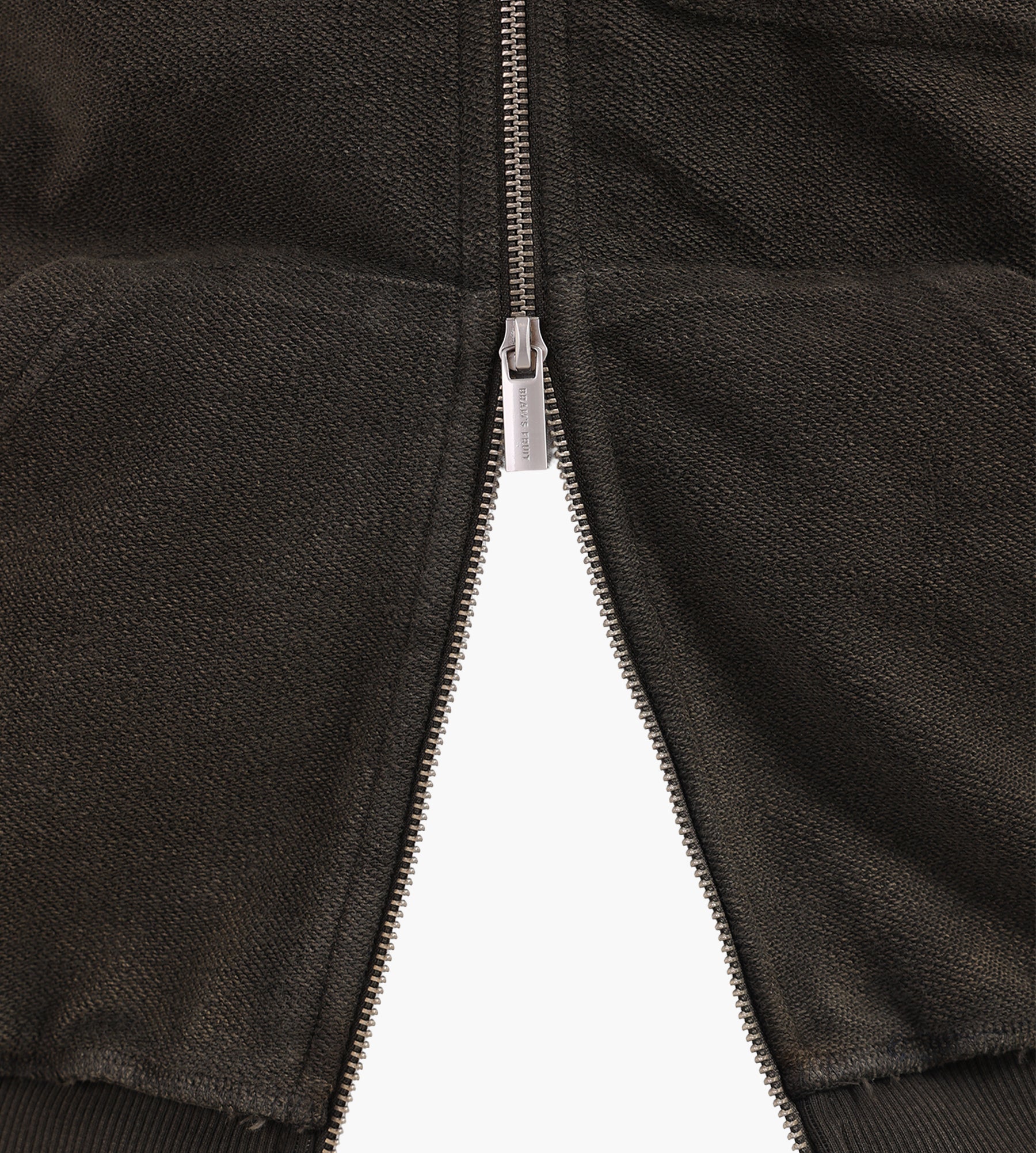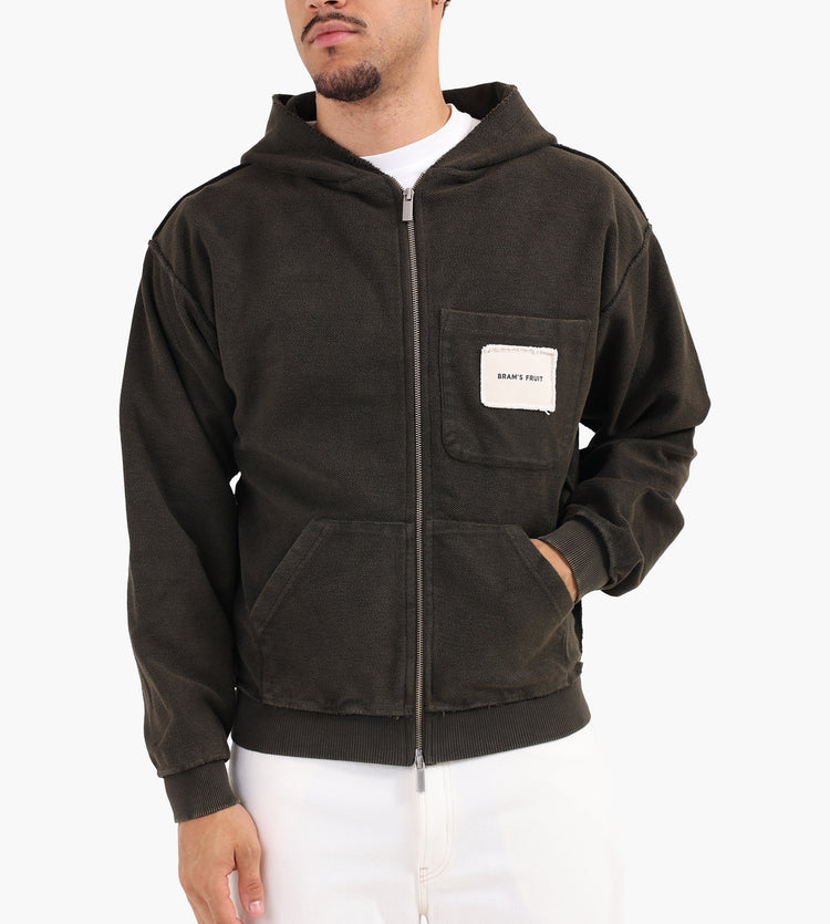 The Bram's Fruit Chest Pocket Zipper Hoodie in Washed Charcoal is crafted from 600 GSM premium cotton, offering a substantial weight and a soft, washed texture. A distressed canvas logo patch adds a rugged touch, while the double-branded zipper enhances functionality and visual appeal.