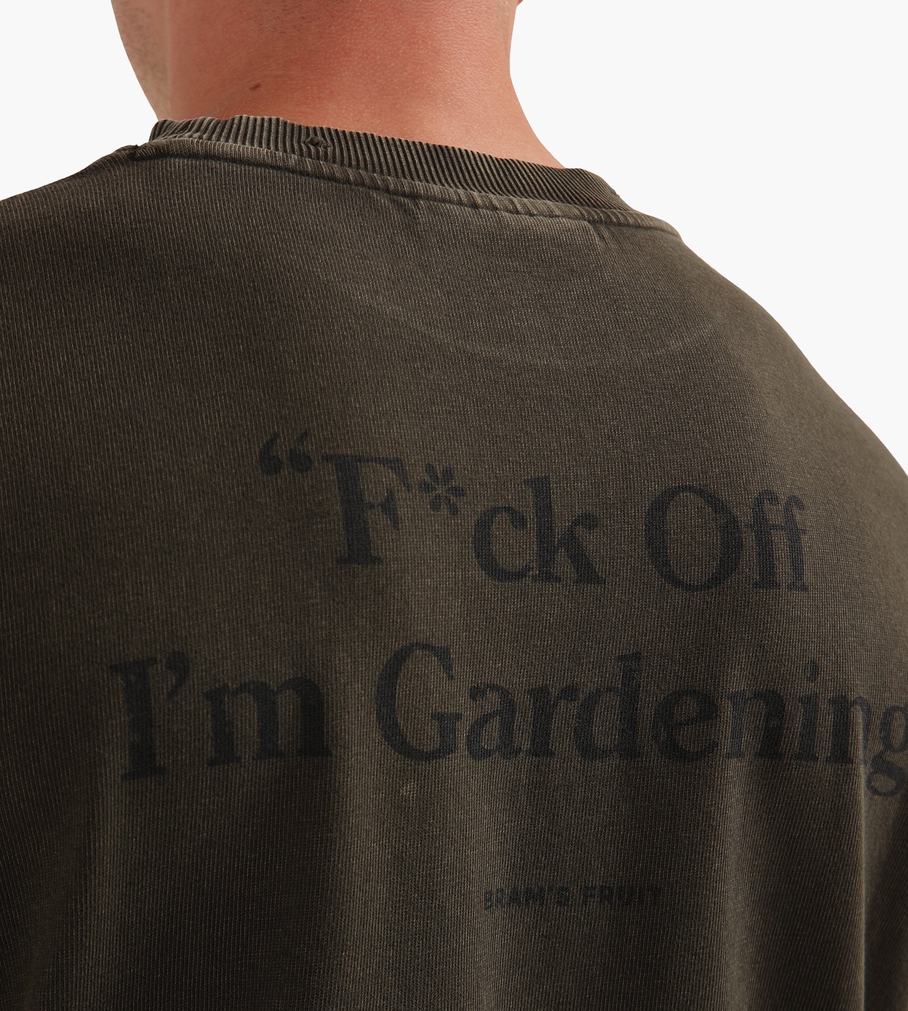 The Bram's Fruit "F*ck Off I'm Gardening" T-Shirt in Washed Charcoal is crafted from 100% premium cotton, delivering a substantial 270 GSM weight for a soft yet durable hand feel. The distressed ribbed crewneck and relaxed fit enhance comfort, while subtle fading lends a lived-in character that complements its irreverent tone.