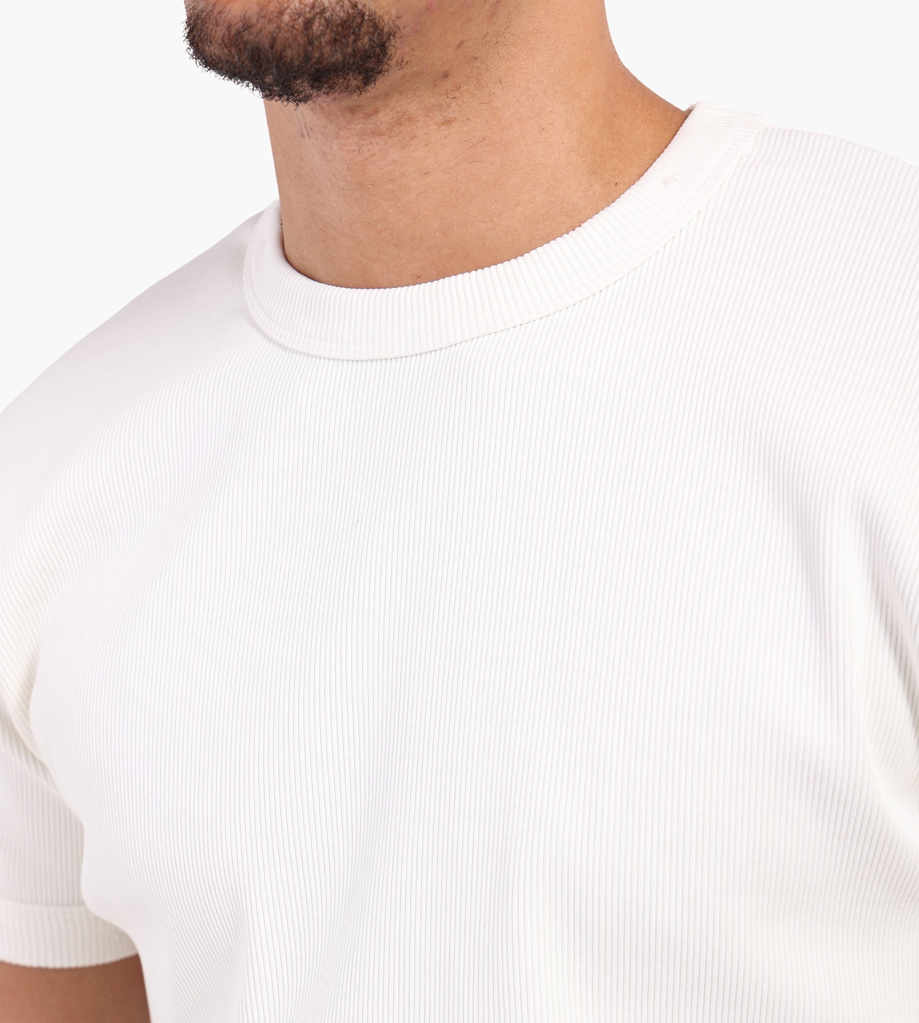 Whether paired with denim for casual outings or styled under structured outerwear, the ribbed detailing adds depth to the clean silhouette. The relaxed fit enhances comfort, while the distressed accents lend understated character to an essential wardrobe piece.