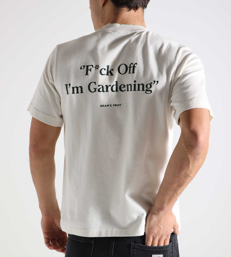 The "F*ck Off I'm Gardening" T-Shirt by Bram's Fruit is crafted from 270 GSM premium washed cotton, delivering a substantial yet breathable feel. The white base serves as the perfect canvas for the screen-printed distressed artwork, while a ribbed crewneck with subtle distressing anchors the design in casual, lived-in appeal.