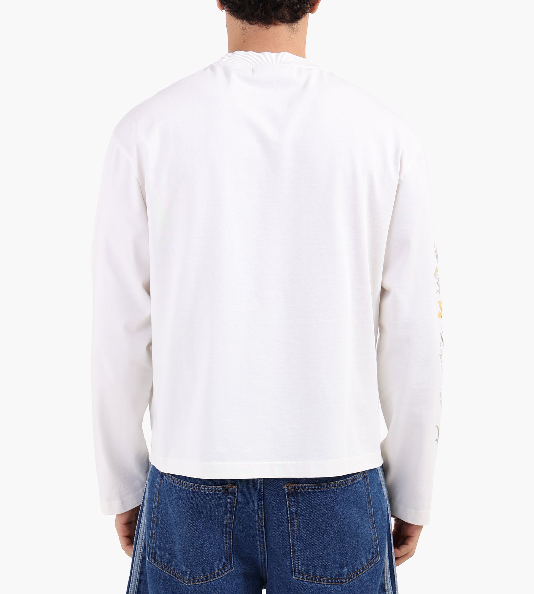 The Bram's Fruit Robin Longsleeve in White is crafted from 300 GSM cotton jersey, offering a substantial yet breathable feel ideal for everyday wear. The ribbed crewneck anchors the design, ensuring durability and a clean neckline that frames the piece. Printed artwork spans the front and sleeve, adding a bold visual element to the otherwise minimalist silhouette.