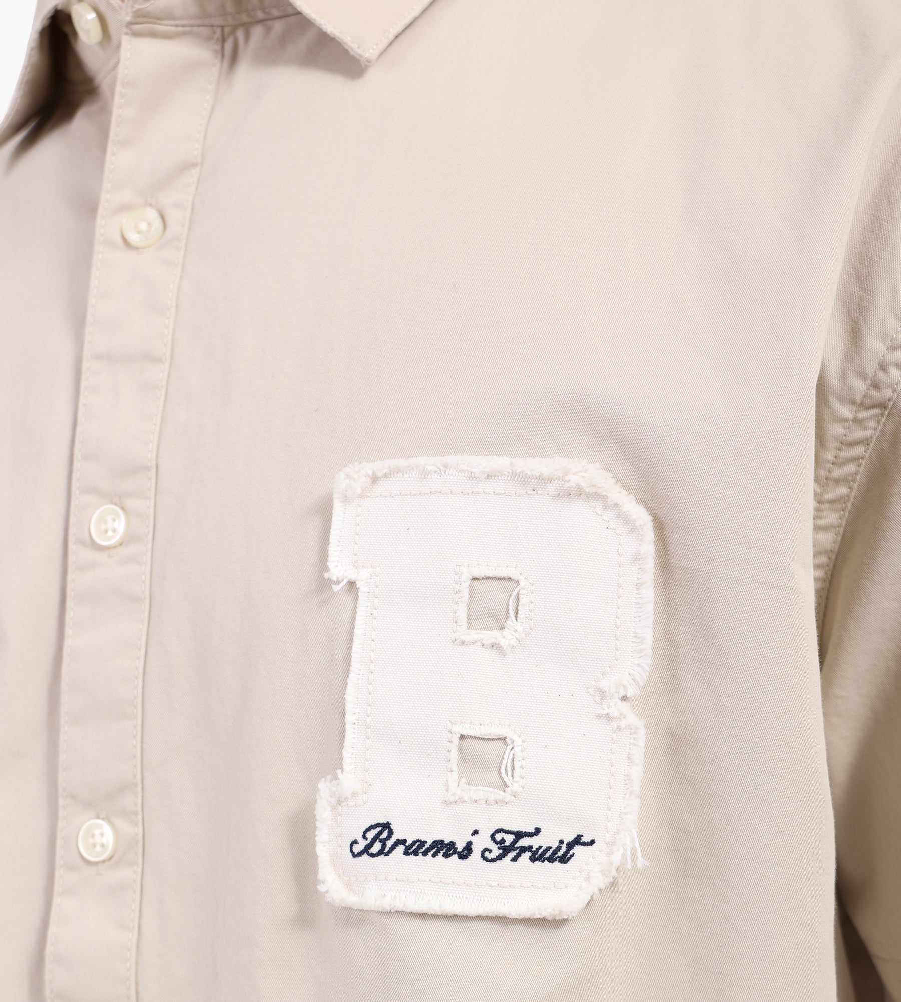 A varsity-inspired patch with embroidered script logo adds texture and depth, while custom pearl off-white buttons and a rounded hem elevate the shirt's classic silhouette. Perfect for layering or wearing on its own, this versatile piece delivers understated comfort with a touch of vintage flair.