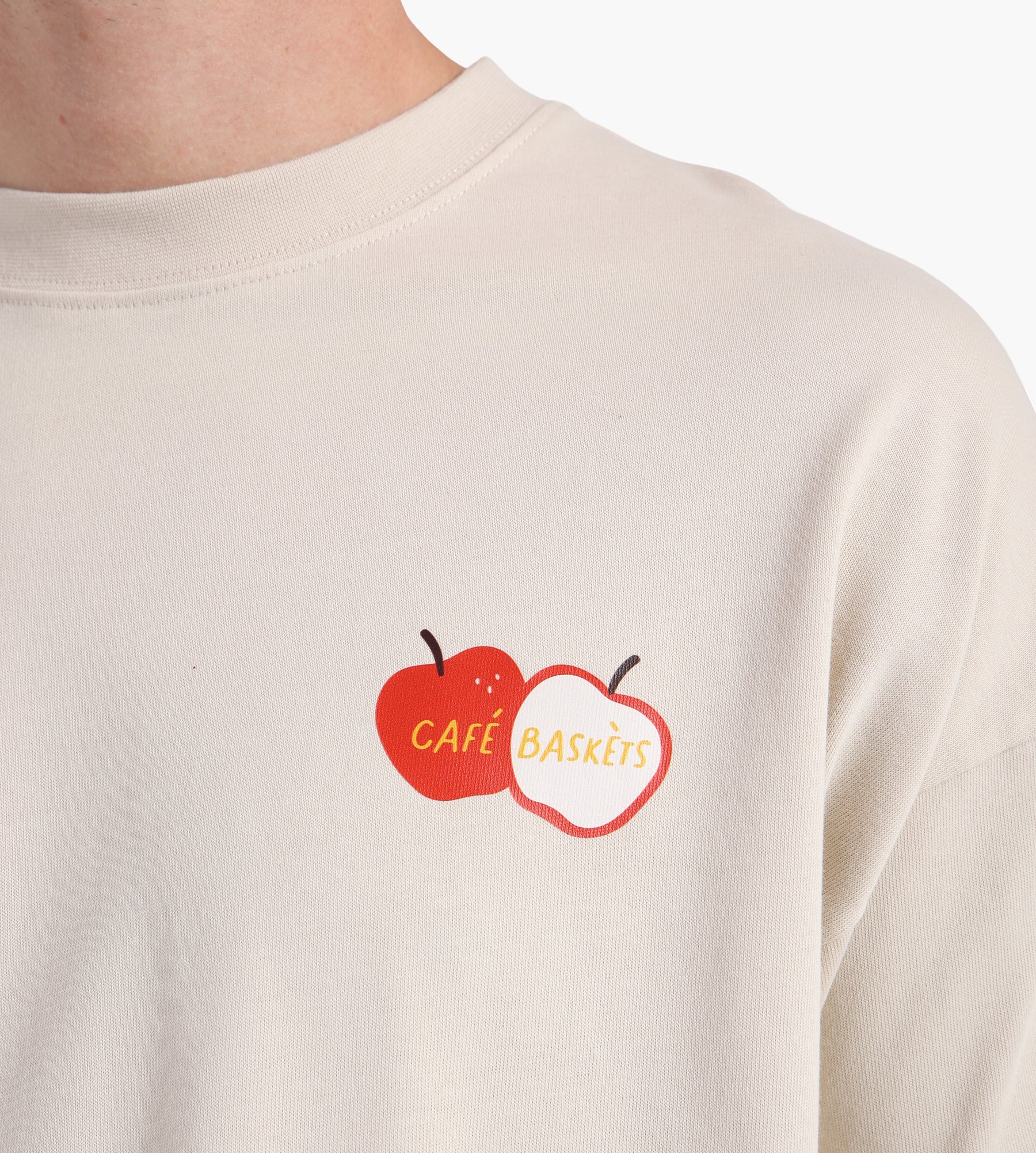 This is our Cafè Baskèts Bon Apple Tee in Tofu, cut from 260gsm organic cotton. It features a printed chest logo and a seasonal back graphic inspired by the Vondelpark, finished in our familiar relaxed fit.