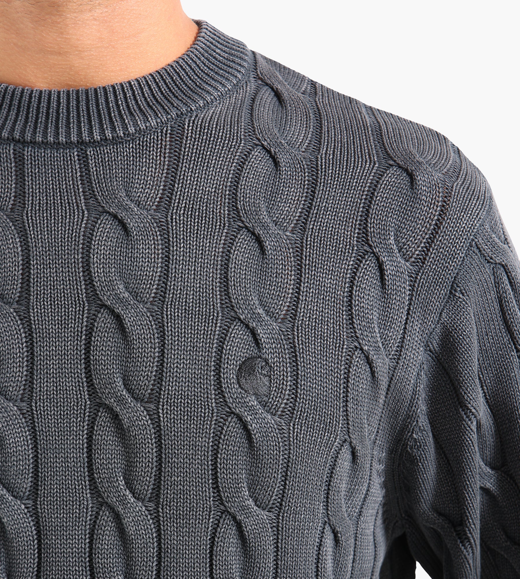The Carhartt WIP Carter Knit Cardigan in Black is crafted from 100% cotton, offering a midweight cable-knit texture that feels substantial yet breathable. Its garment-dyed finish enhances the depth of color while delivering a softer hand, making it a refined layering piece for cooler days. A 7-gauge construction ensures durability without compromising on comfort.
