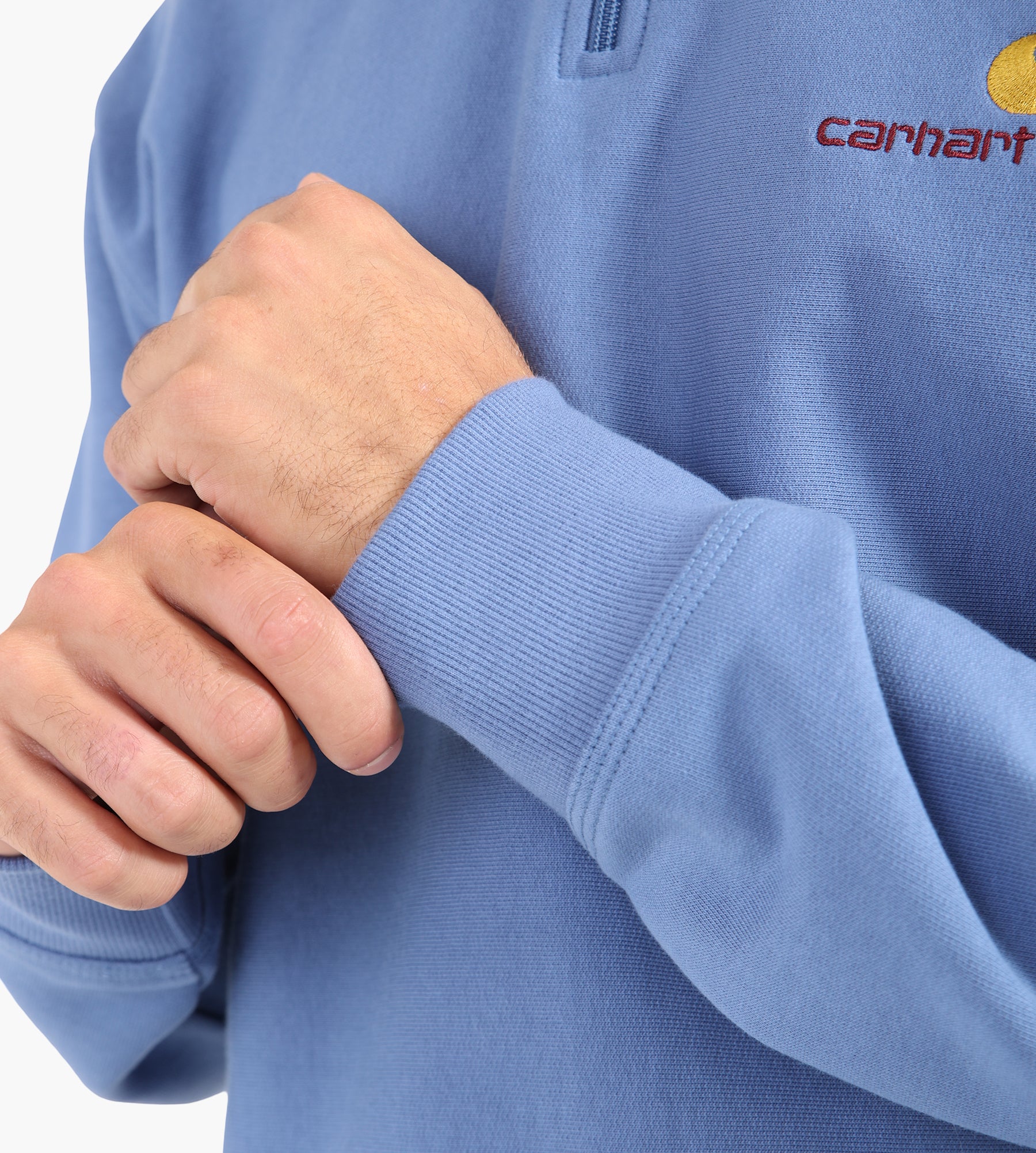 The Carhartt WIP Half Zip American Script Sweatshirt in Sorrent is crafted from a robust 12.3 oz cotton-polyester blend, offering a balance of durability and comfort. Brushed for extra softness, the fabric enhances warmth while maintaining breathability, making it an ideal layer for transitional weather or cooler days. The deep Sorrent hue is garment dyed, lending a rich, dimensional finish that evolves with wear.