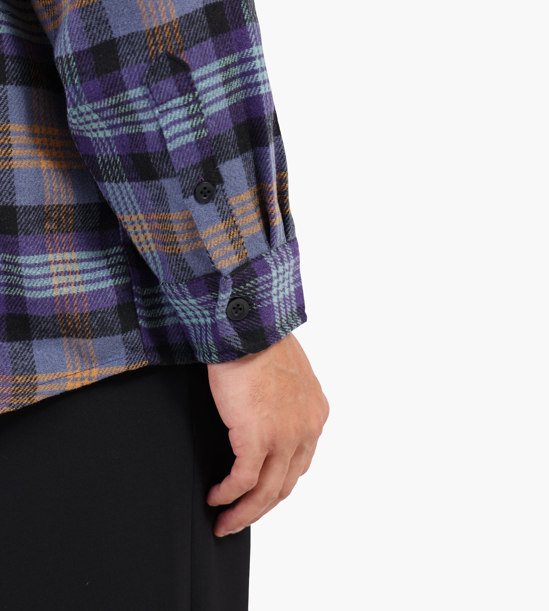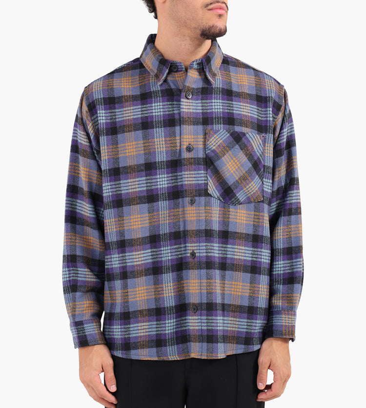 The Carhartt WIP Long Sleeve Dern Shirt in Dern Check, Lakers combines heritage-inspired design with modern utility. Crafted from a heavyweight blend of 80% polyester and 20% wool, the yarn-dyed herringbone fabric is garment-washed for a soft, broken-in feel. Its bold violet and orange check pattern nods to classic workwear aesthetics, while the loose fit enhances comfort and layering potential.