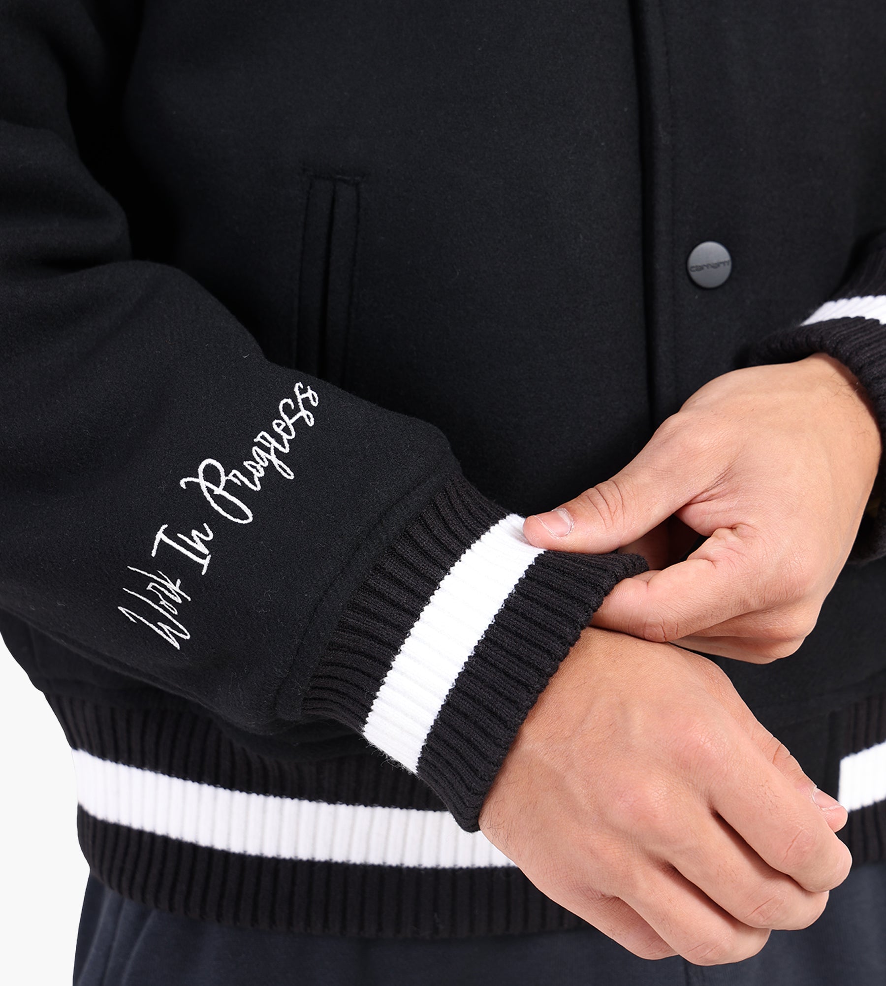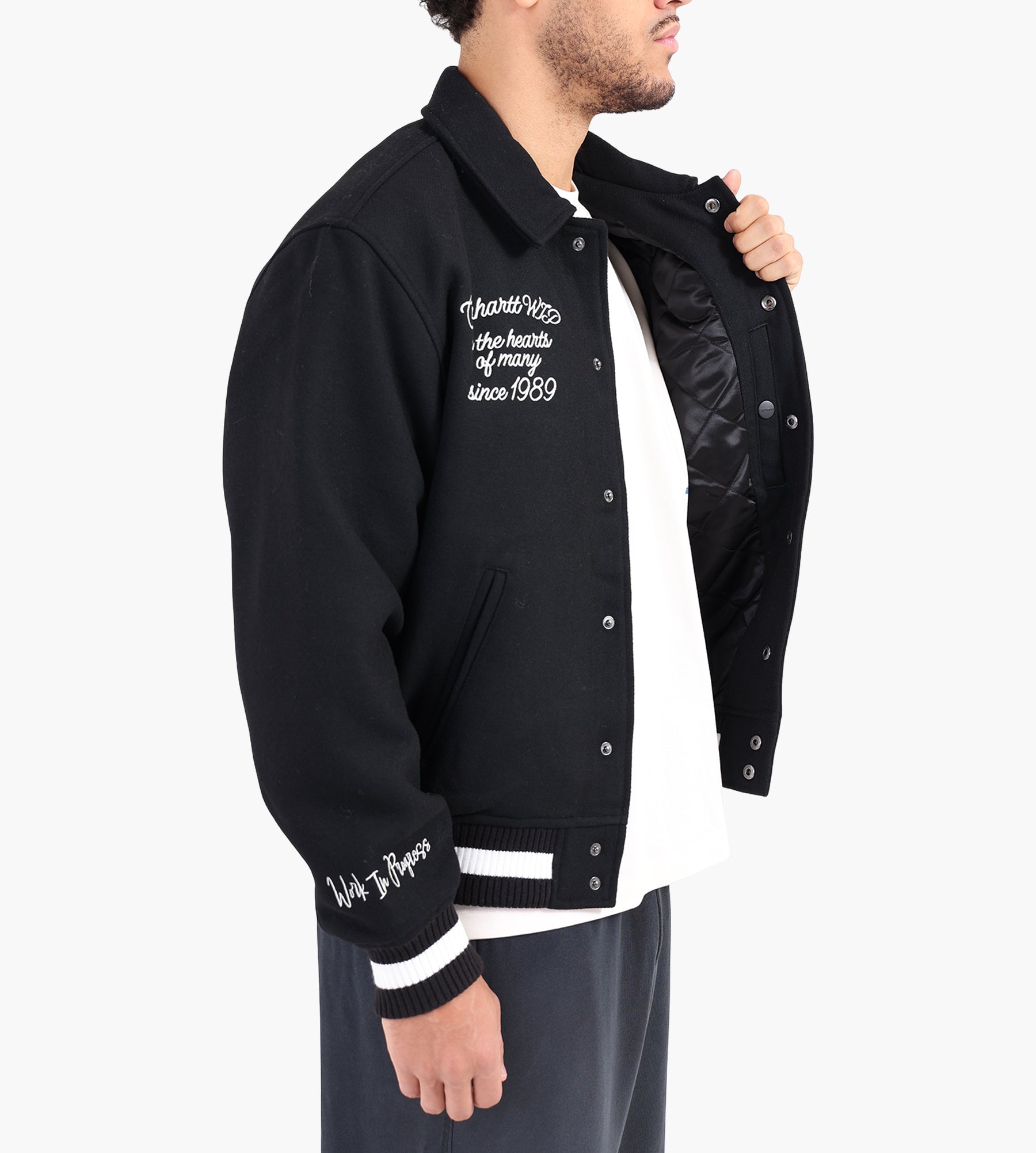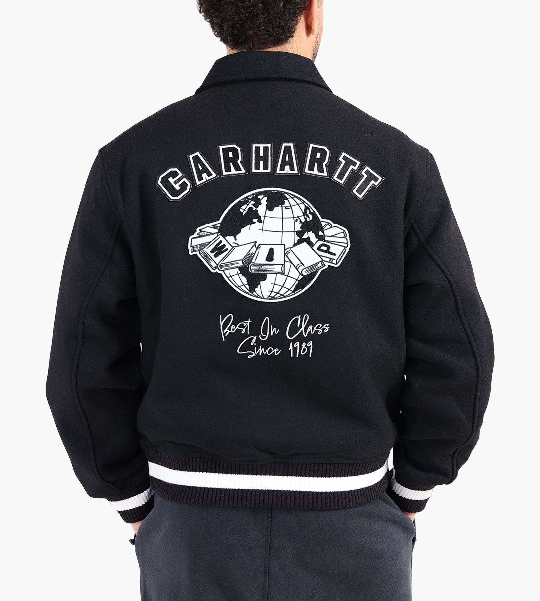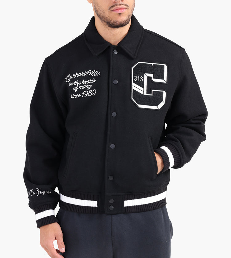 The Carhartt WIP World Class Varsity Jacket in black combines heritage-inspired design with modern durability. Crafted from a wool-blend body and reinforced with contrast leather sleeves, it delivers a structured yet comfortable fit. Embroidered branding and striped ribbed trims nod to classic collegiate aesthetics, while the monochrome palette ensures versatility.